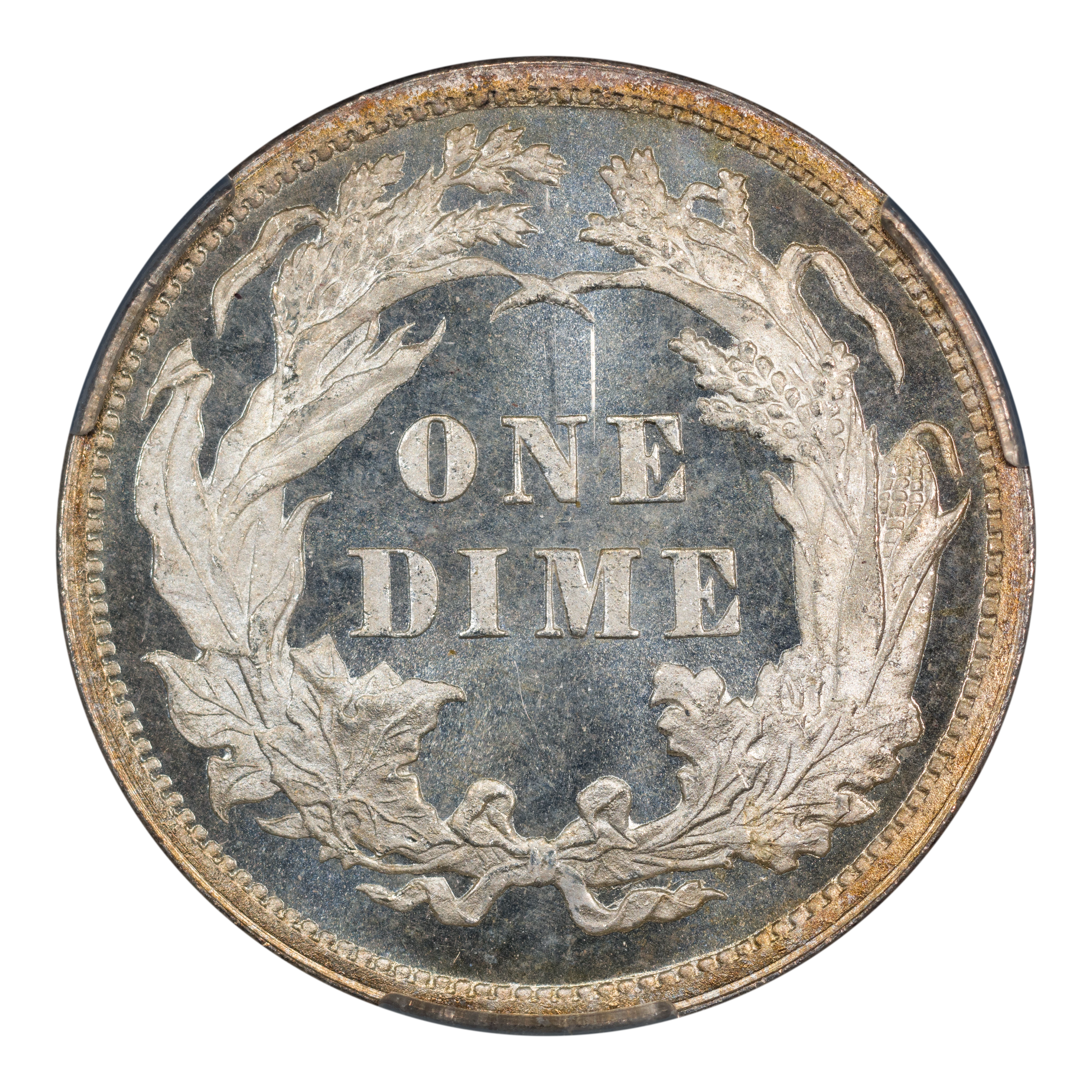 Reverse: ONE DIME is centered in the middle of the reverse surrounded by a wreath tied by a bow at the bottom.