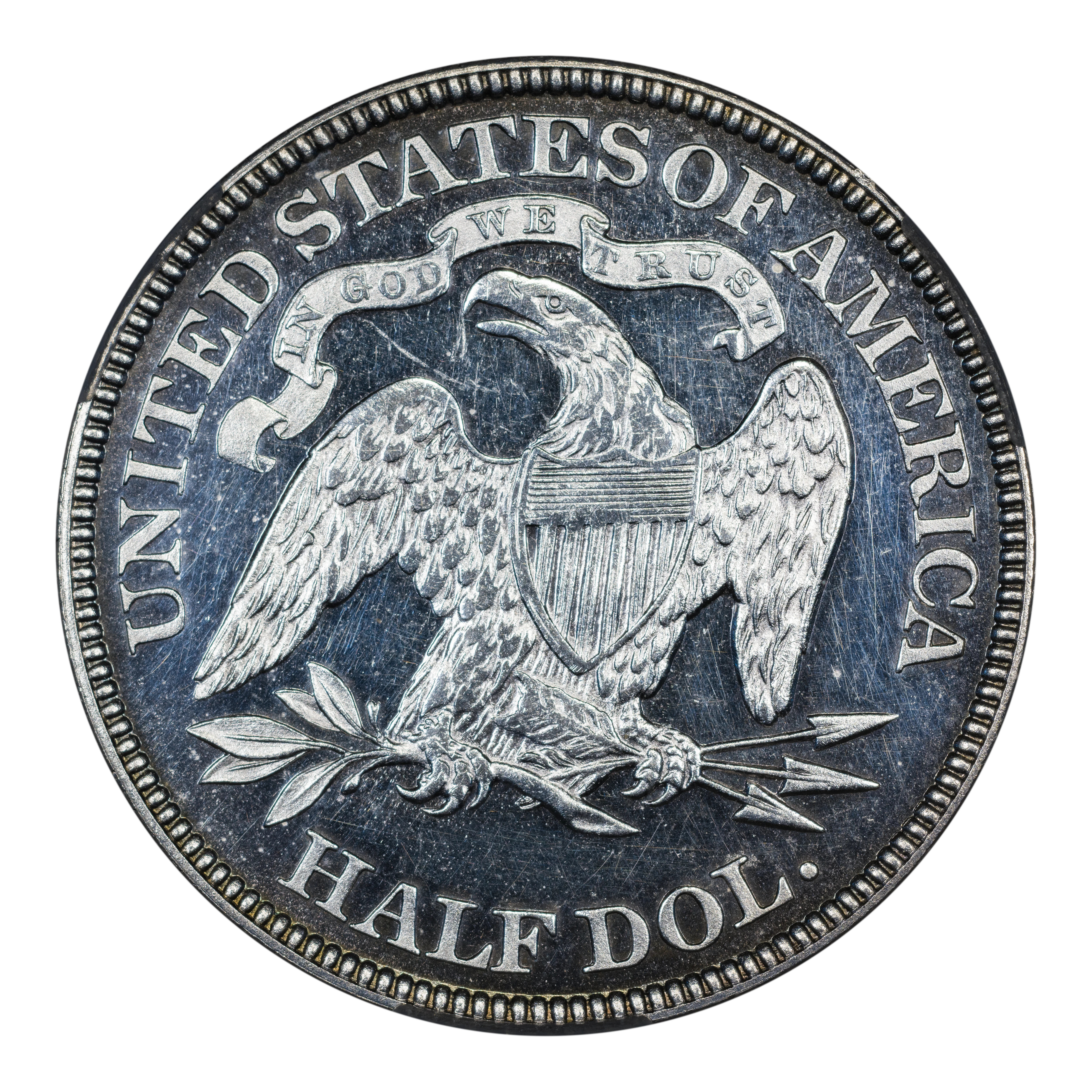 Reverse: The heraldic eagle is centered in the design with the words UNITED STATES OF AMERICA and HALF DOL. around the periphery. A ribbon above the eagle's head bears the motto IN GOD WE TRUST