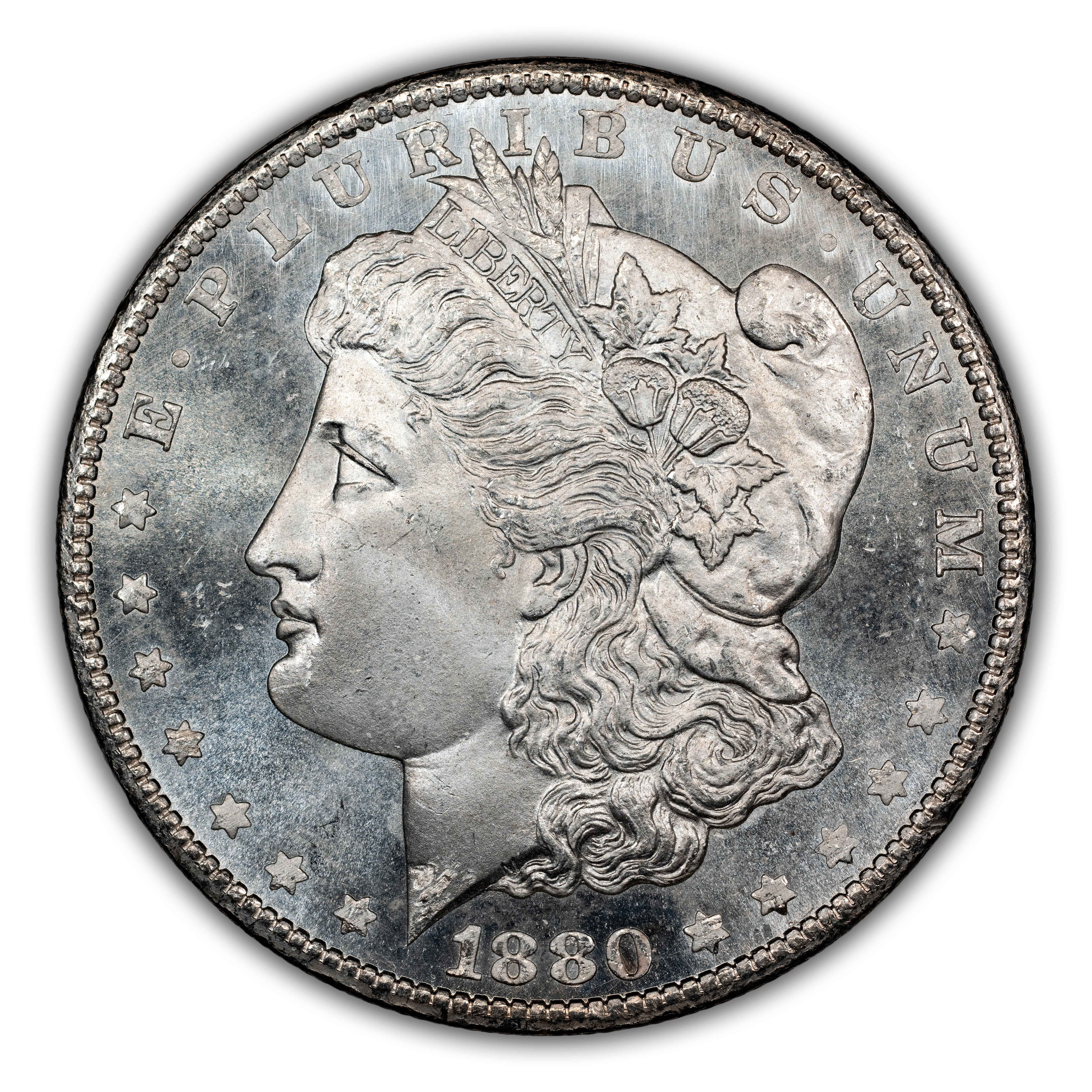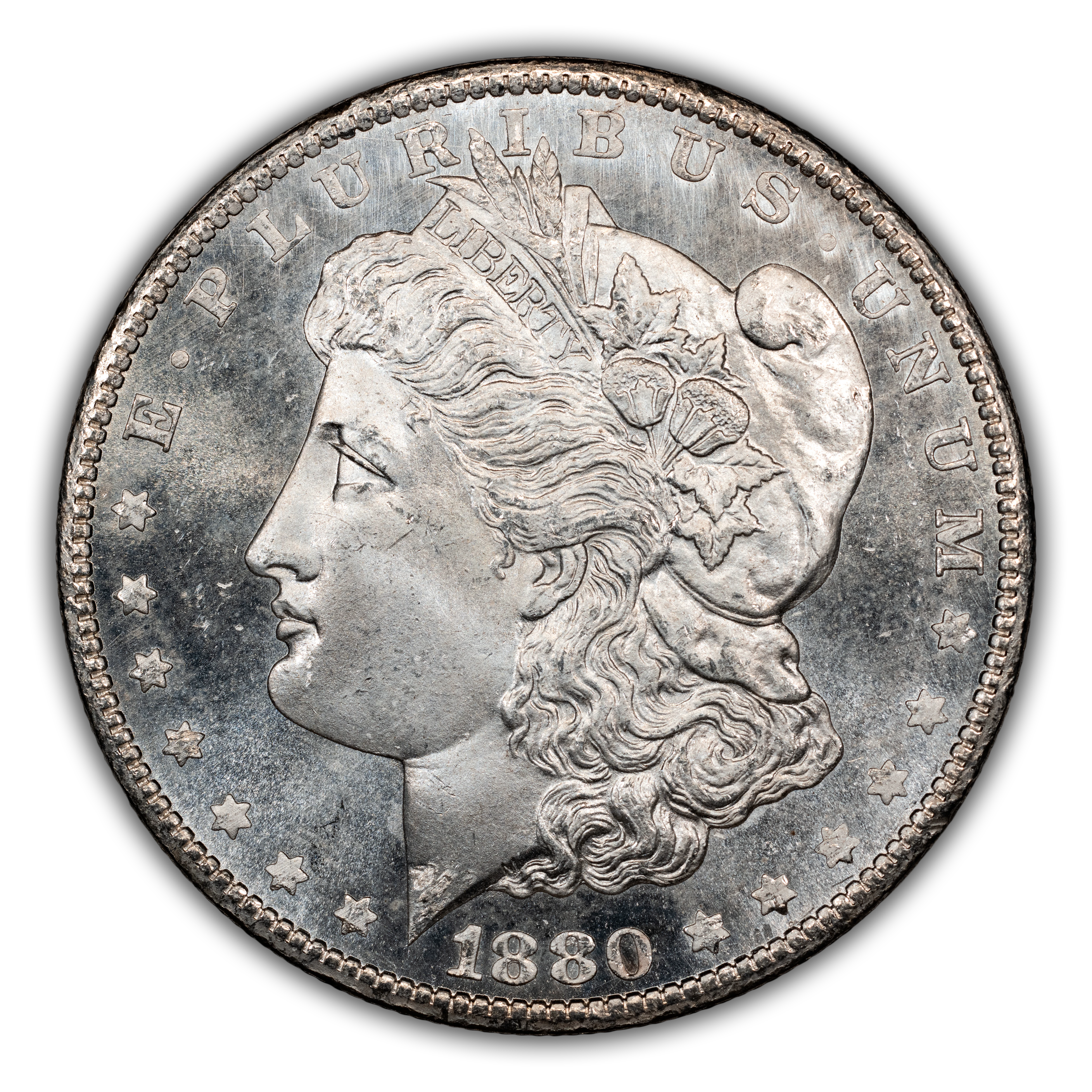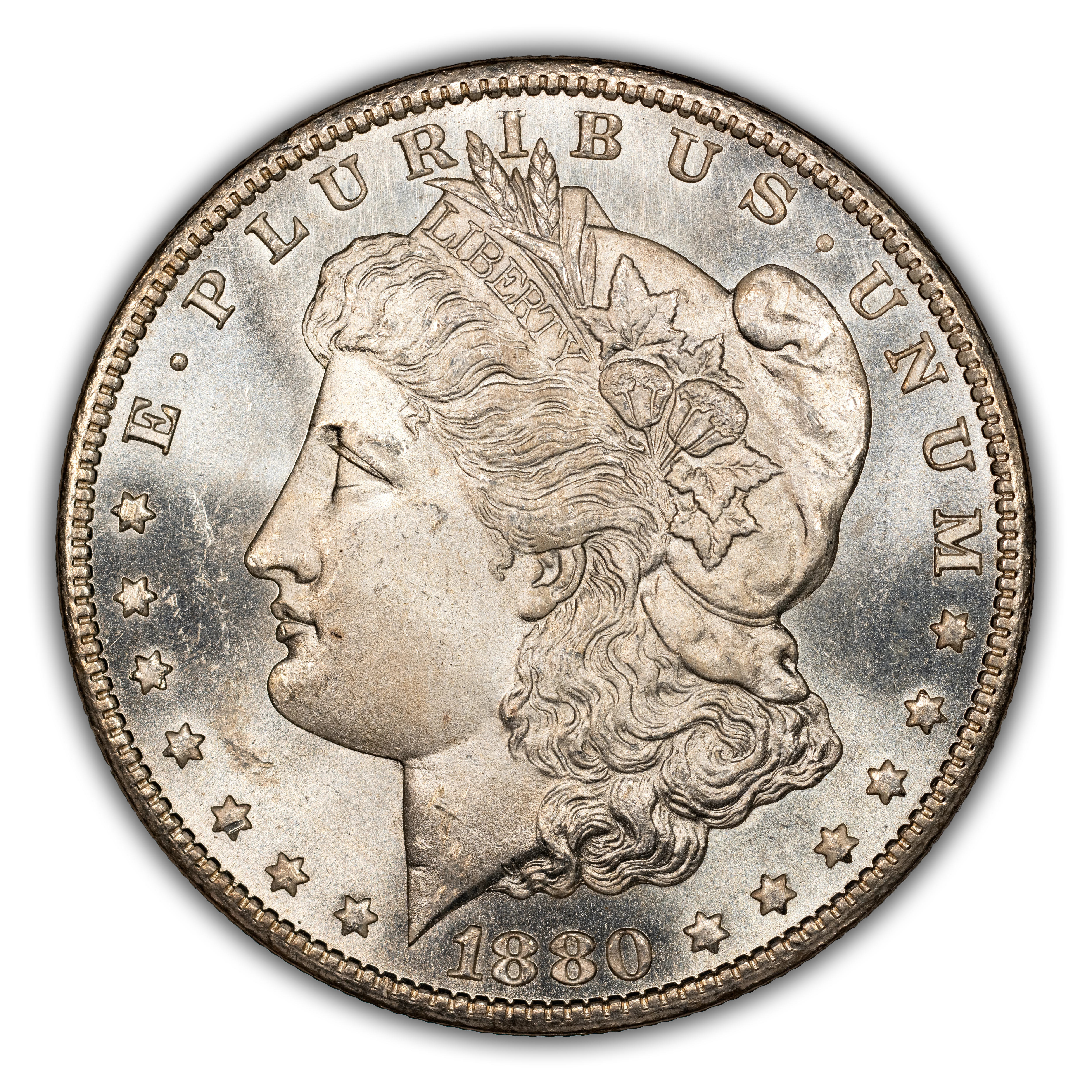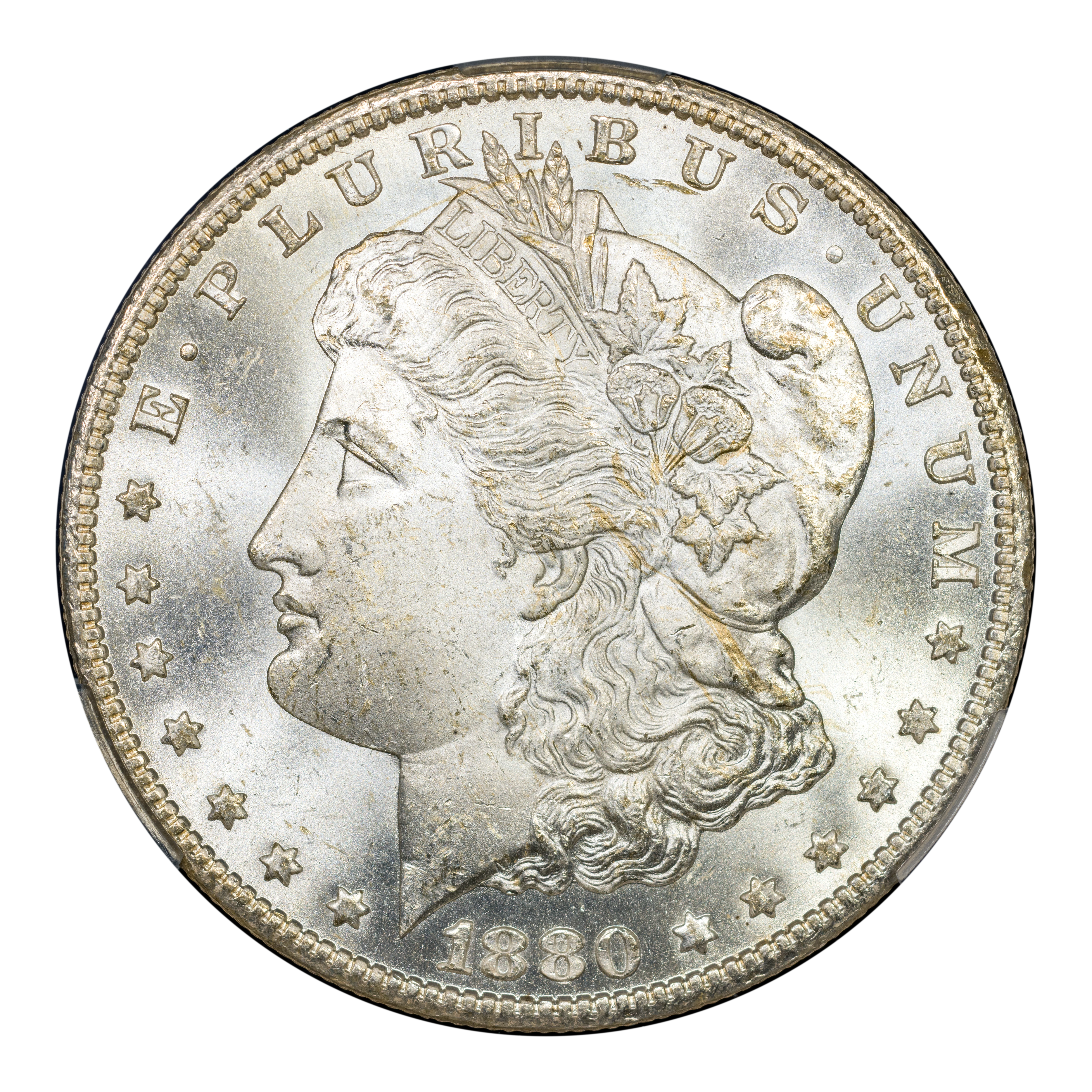 Featuring the reverse style (rounded breast) of 1879, this popular overdate is distinguished from its Low 7 counterpart by looking for where traces of the 7 are to be found in and around the second 8 of the date. With the High 7, the horizontal bar of the ghostlike 7 can be seen within the top half of the upper loop in the 8, with only a tiny notch visible under the bottom loop of that same 8. This is a very scarce variety in all grades and particularly so above MS66, in which case it is rare. PLs and DMPLs are rare in all grades and very rare in the Gem range, commanding huge premiums across the MS spectrum.