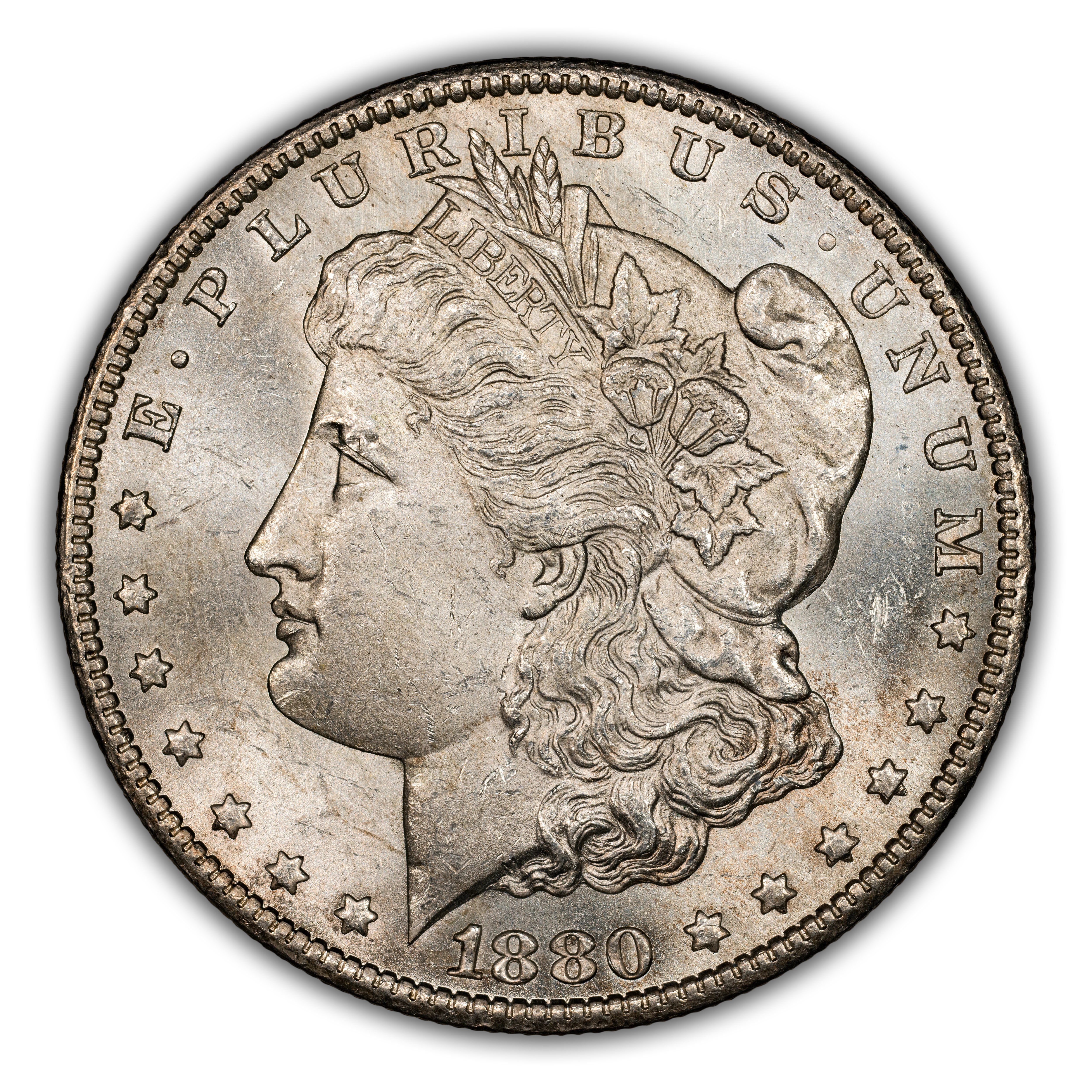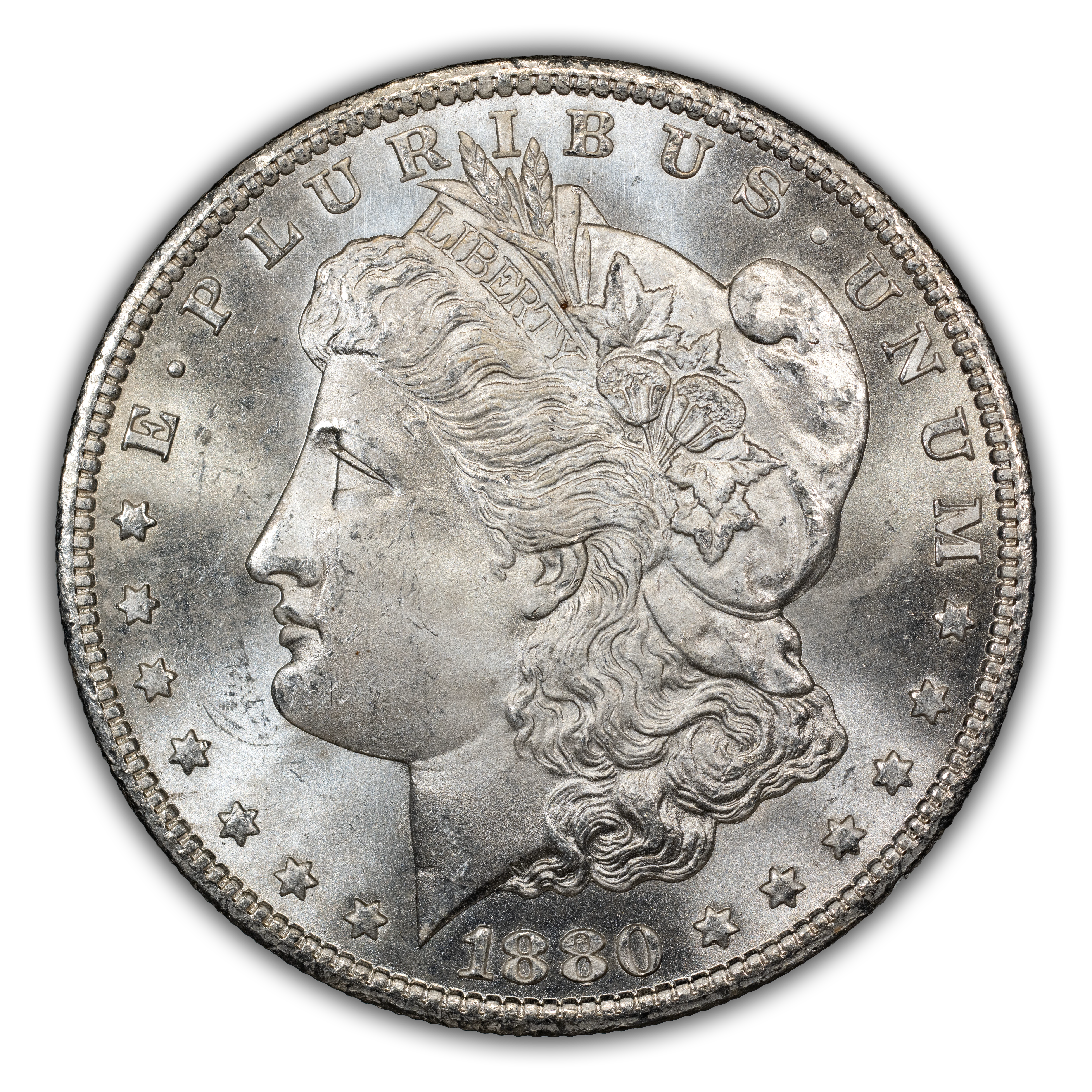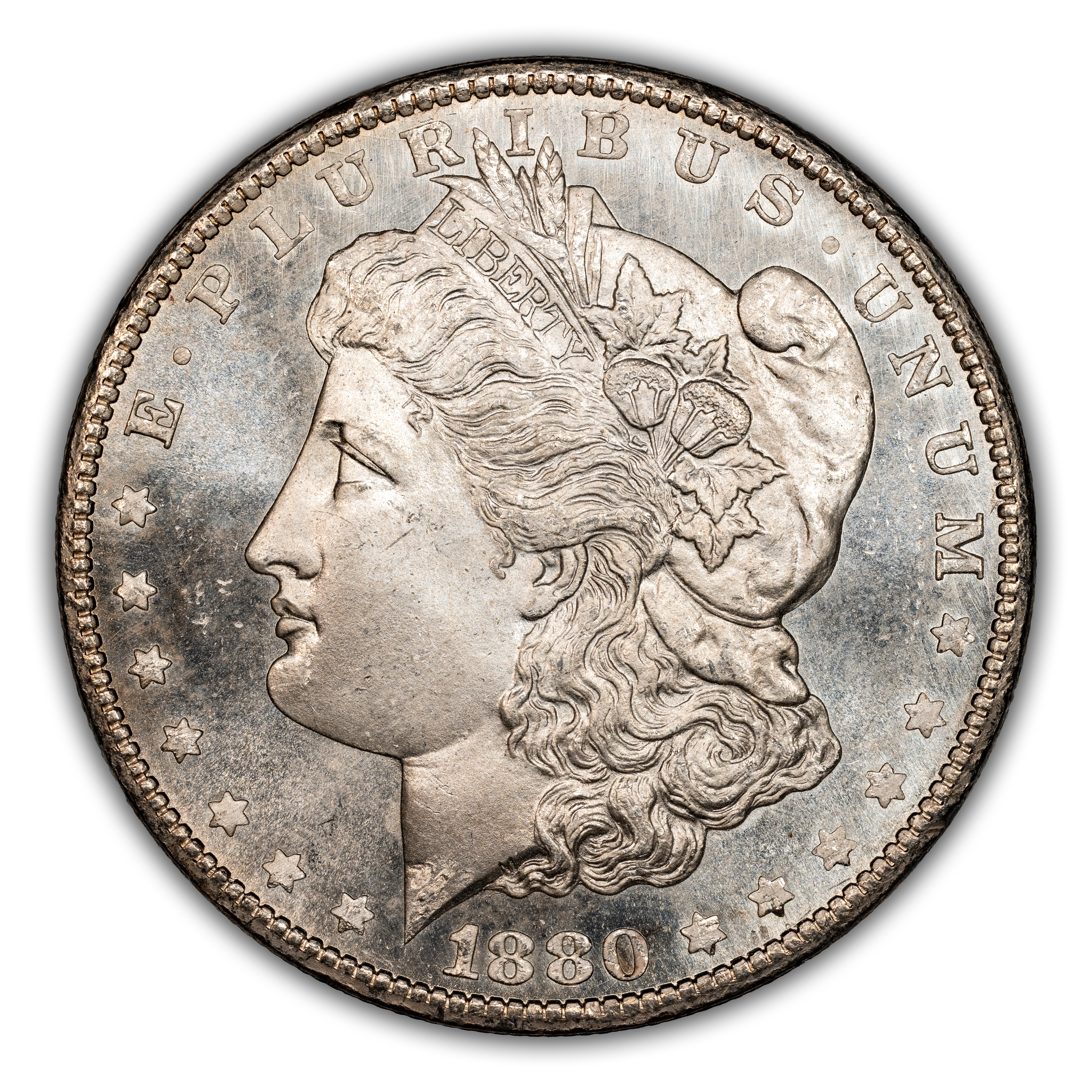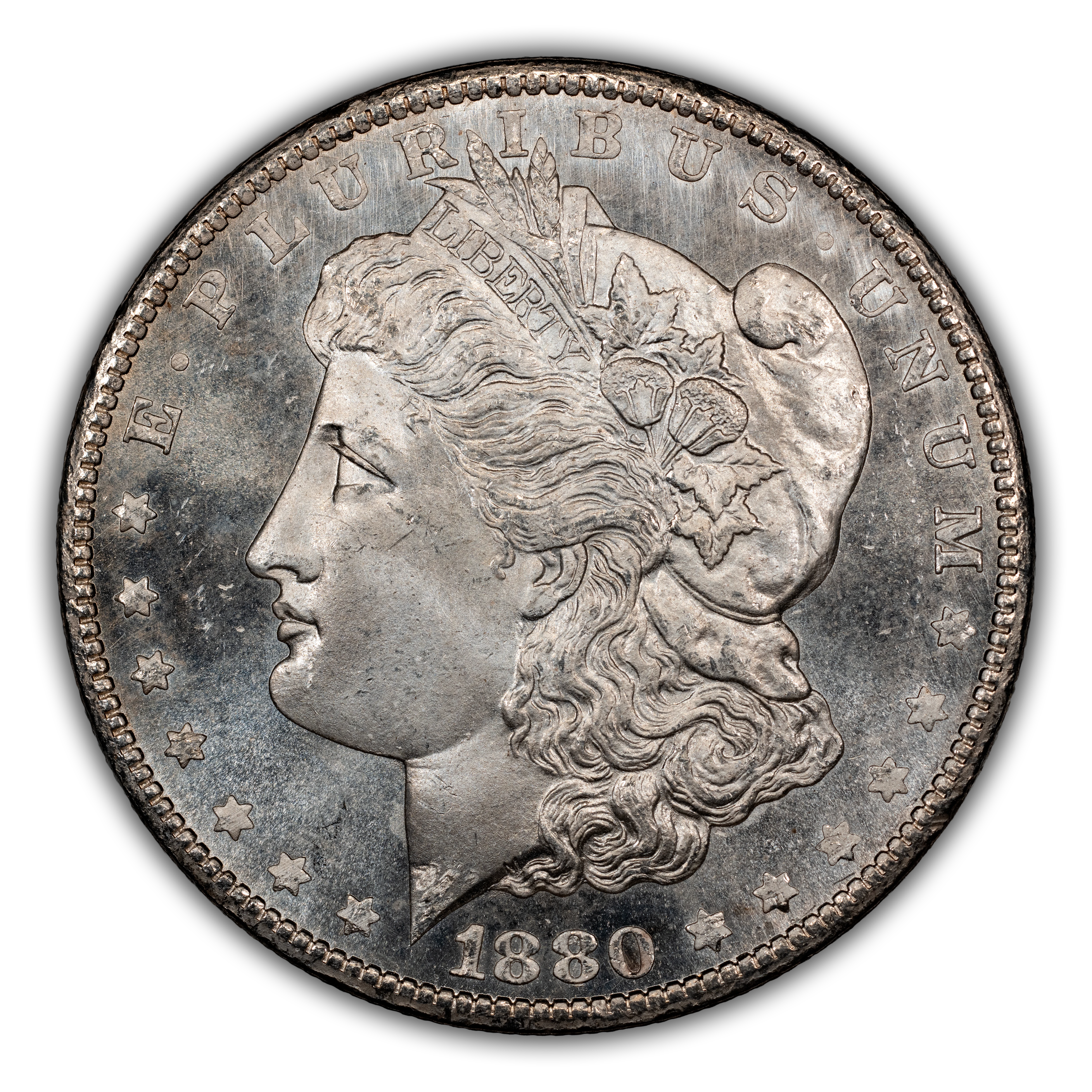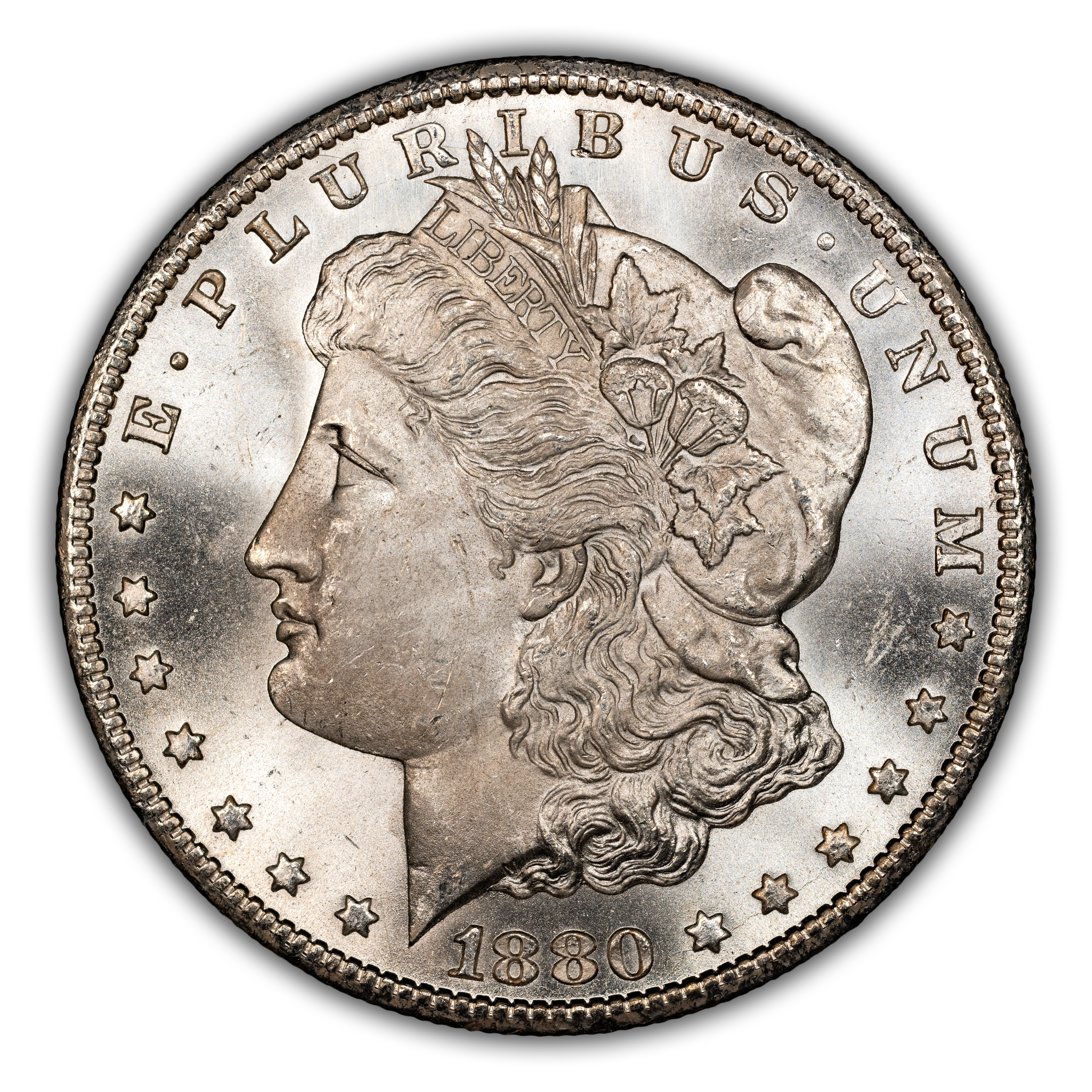 Featuring the reverse style (rounded breast) of 1879, this popular overdate is distinguished from its Low 7 counterpart by looking for where traces of the 7 are to be found in and around the second 8 of the date. With the High 7, the horizontal bar of the ghostlike 7 can be seen within the top half of the upper loop in the 8, with only a tiny notch visible under the bottom loop of that same 8. This is a very scarce variety in all grades and particularly so above MS66, in which case it is rare. PLs and DMPLs are rare in all grades and very rare in the Gem range, commanding huge premiums across the MS spectrum.