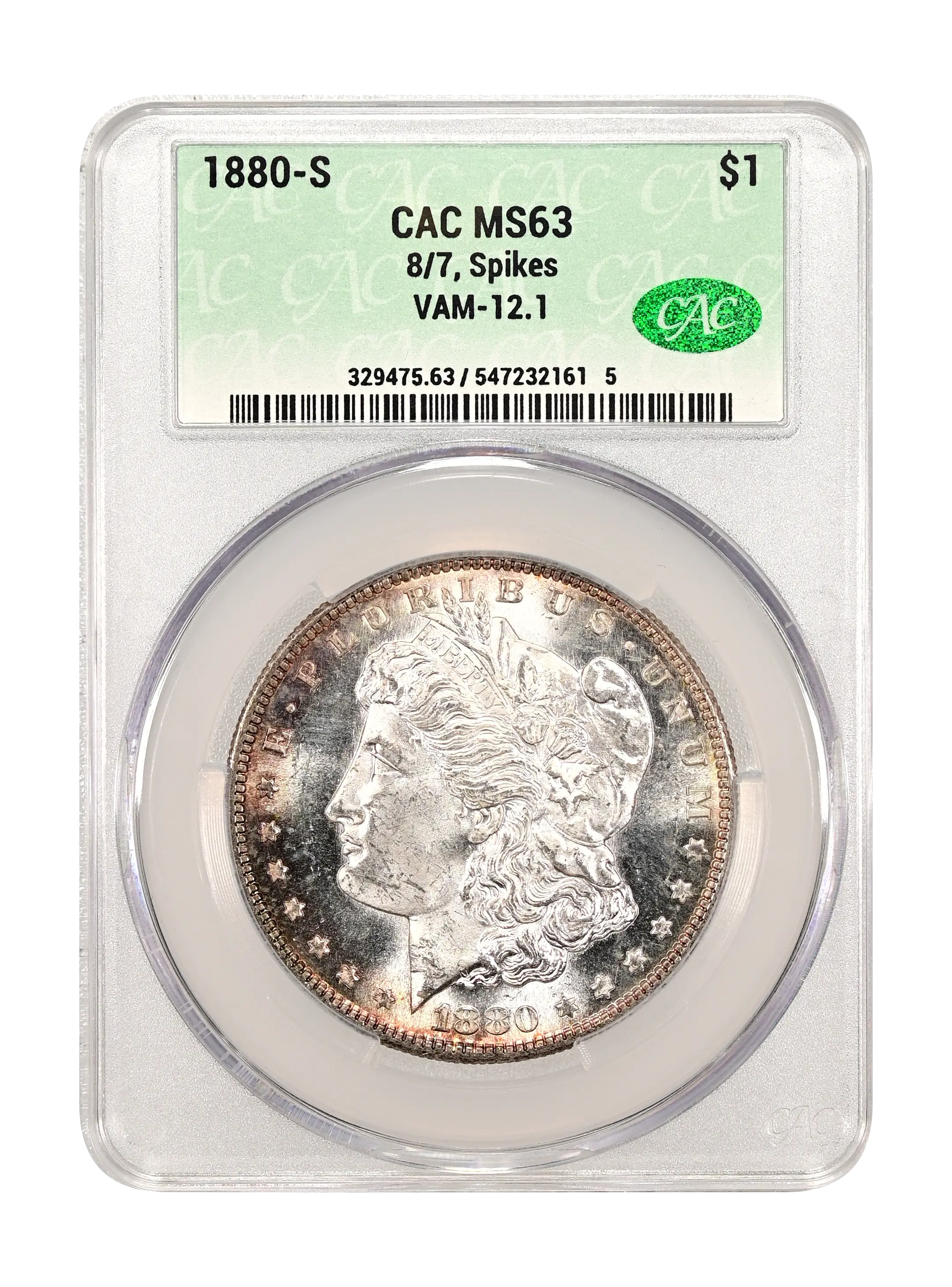 1880-S 8/7, Spikes $1 VAM-12.1 CAC MS63+