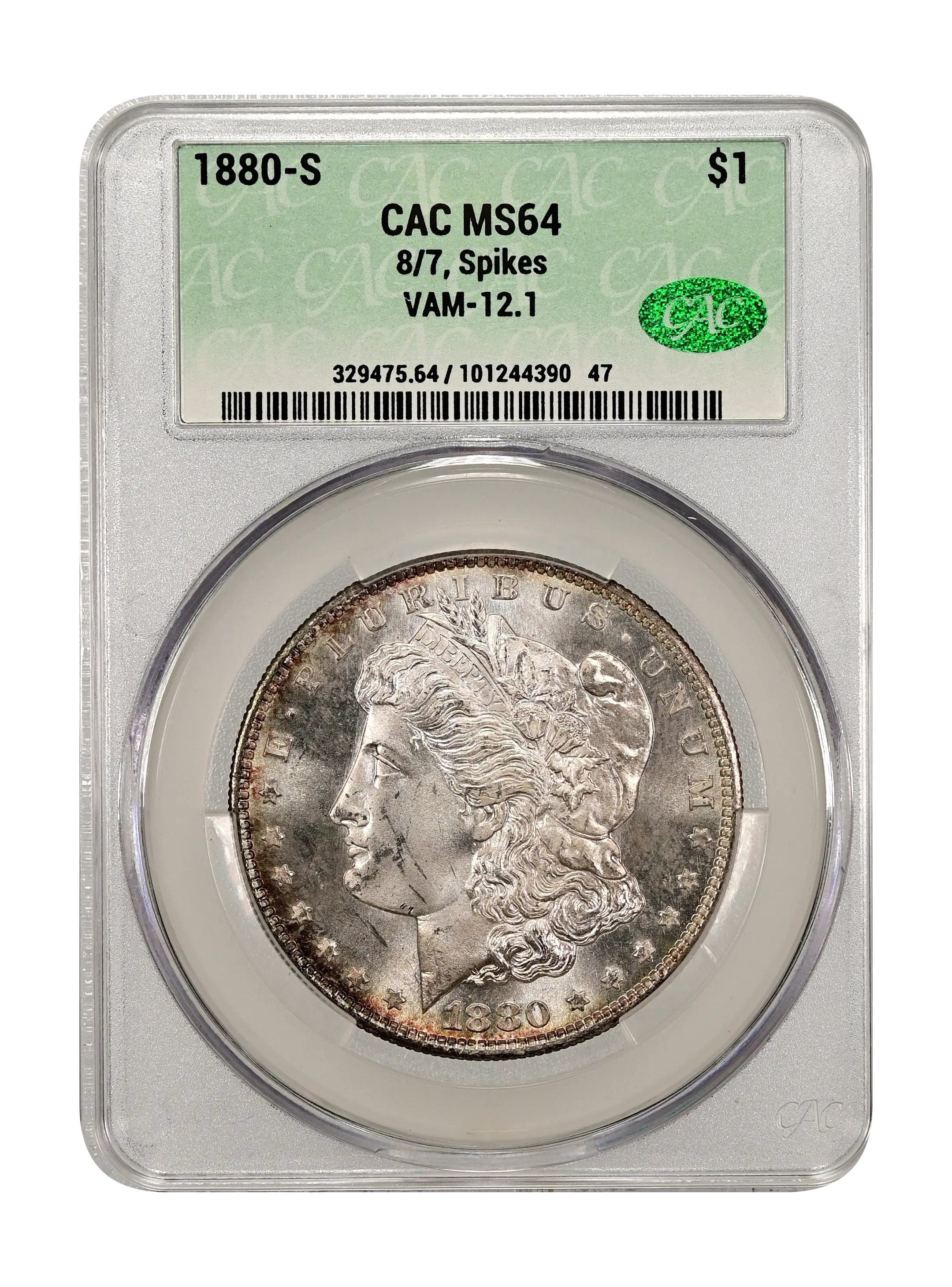 1880-S 8/7, Spikes $1 VAM-12.1 CAC MS64