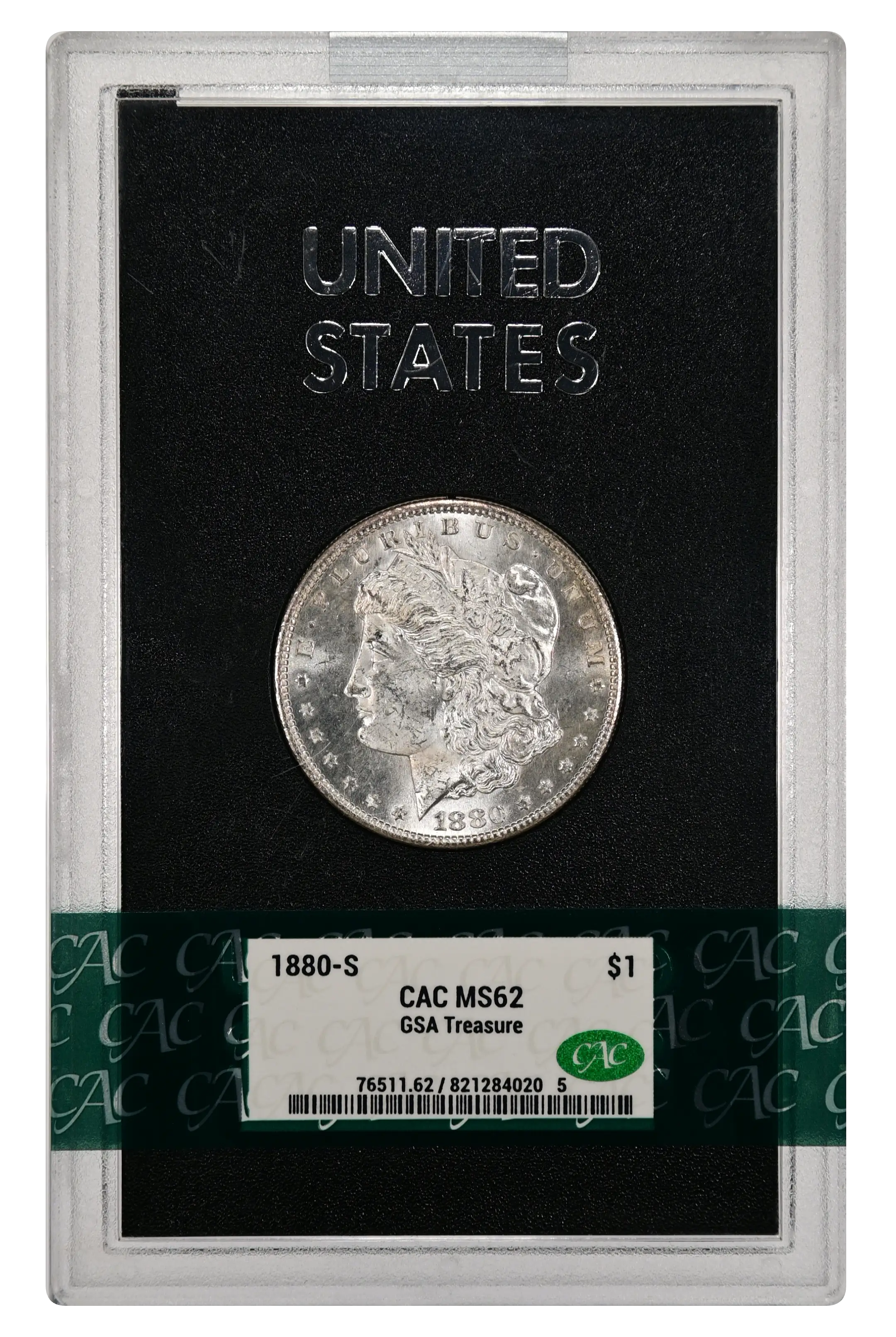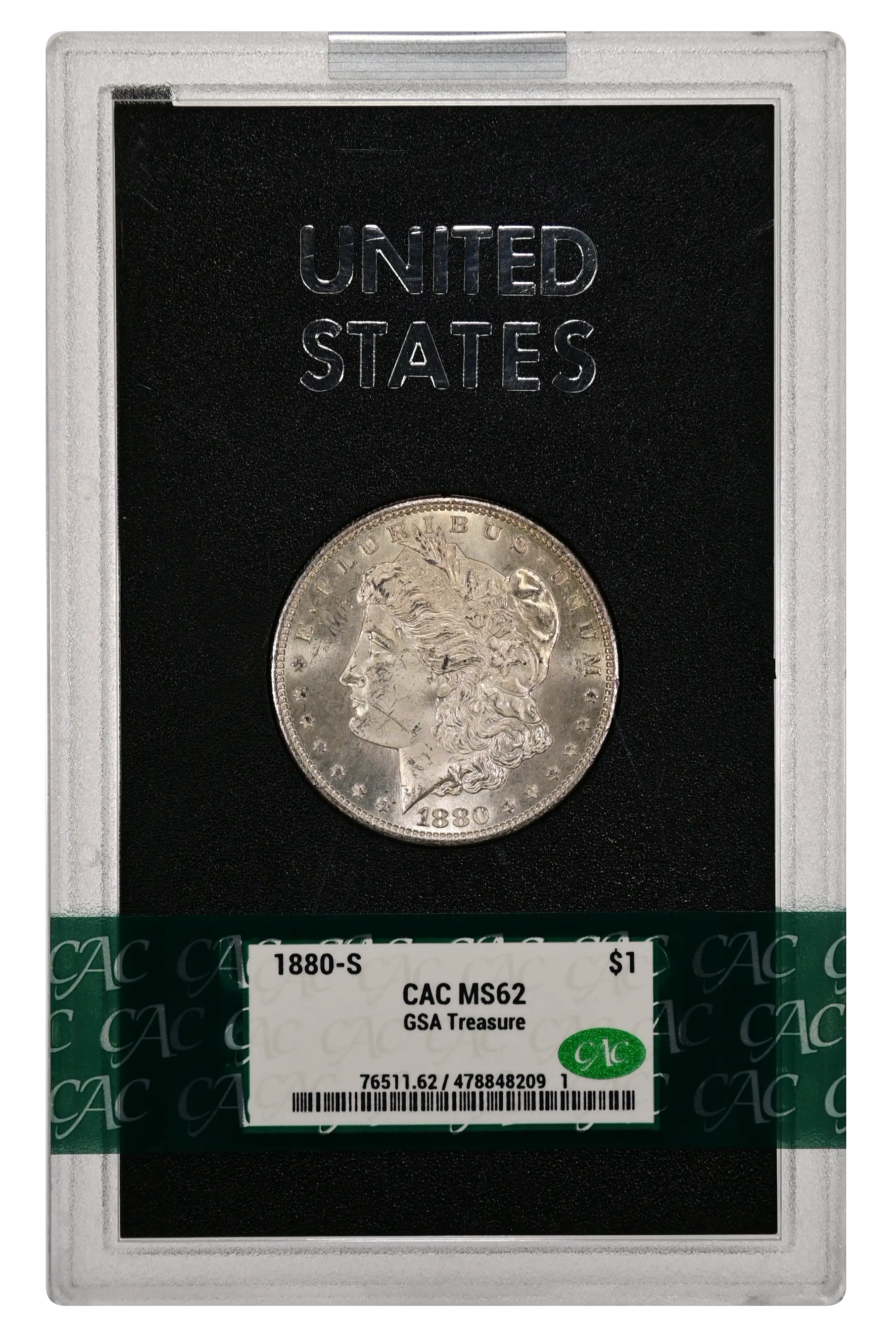 The 1880-S GSA Morgan dollars are rare, and certainly much tougher to find than almost any of the Carson City Morgan dollars that form the bulk of the GSA Morgans. The 1880-S GSA Morgan dollars are found both circulated and uncirculated and in hard packs as well as soft packs. PLs and DMPLs are relatively rare and, as do GSA silver dollars in any condition, command substantial premiums.