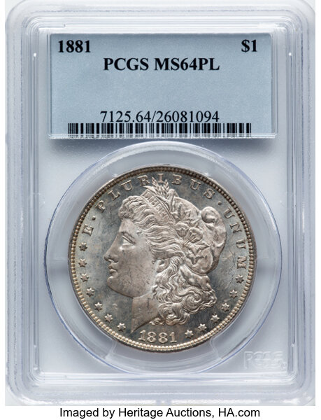 1881 $1 MS65 Prooflike PCGS. PCGS Population: (17/1). NGC Census: (6/1). CDN: $1,950 Whsle. Bid for NGC/PCGS MS65. Mintage ...