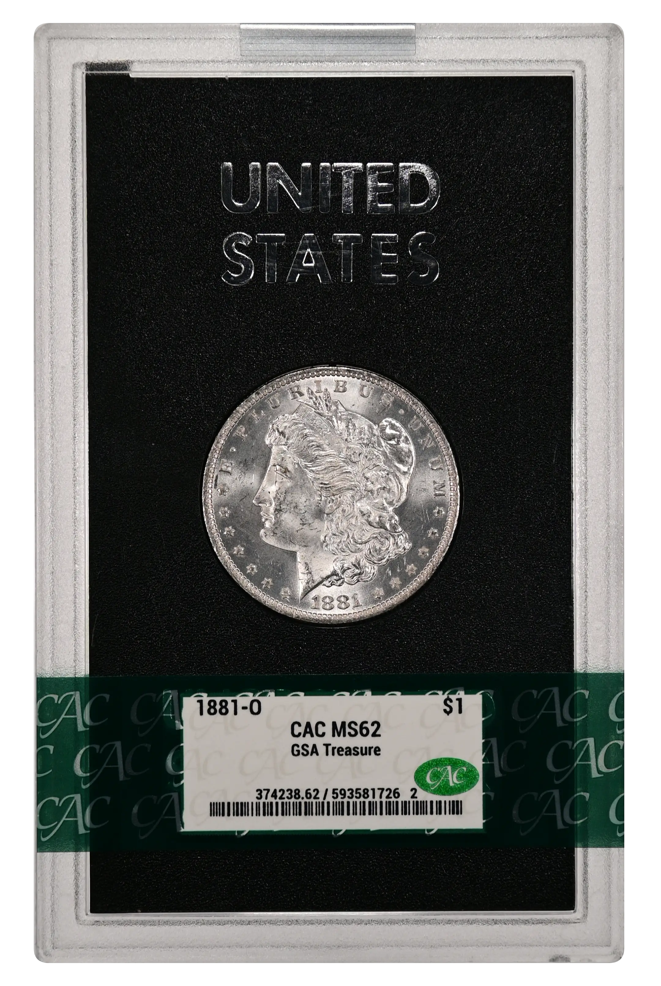 The 1881-O Morgan dollar in GSA packaging is rare, at least as compared to CC-mint GSA Morgans. Some are found in circulated grades, other uncirculated, and some are in hard packs and other soft packs. Examples of any are very much in demand by Morgan dollar enthusiasts and particularly the large numbers of collectors who specifically focus on building GSA dollar sets. PLs and DMPLs are very rare.
