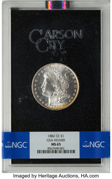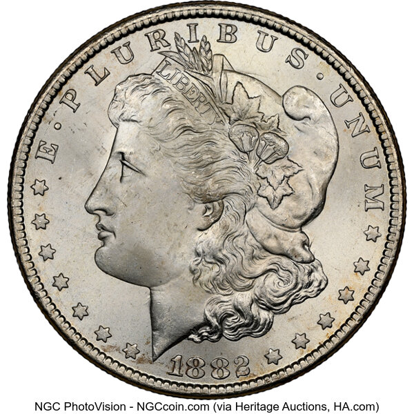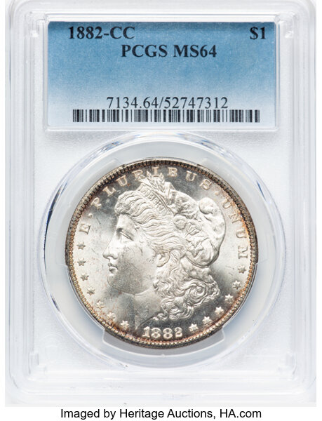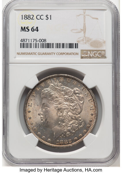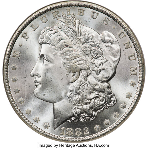 The 1882-CC Morgan dollar is a popular date and widely available in circulated and MS grades through about MS66. It is much tougher in better condition. PLs and DMPLs are reasonably available, especially up through MS65, above which they become significantly more challenging and extremely rare in grades of MS66 or better.