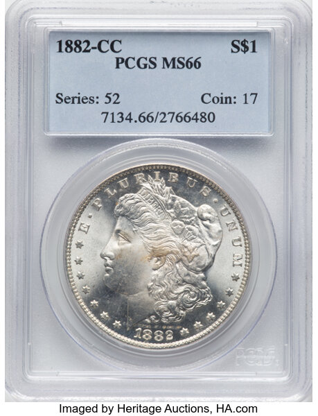 <B>1882-CC $1 MS66 PCGS.</B></I> CDN: $1,050 Whsle. Bid for NGC/PCGS MS66. Mintage 1,133,000....