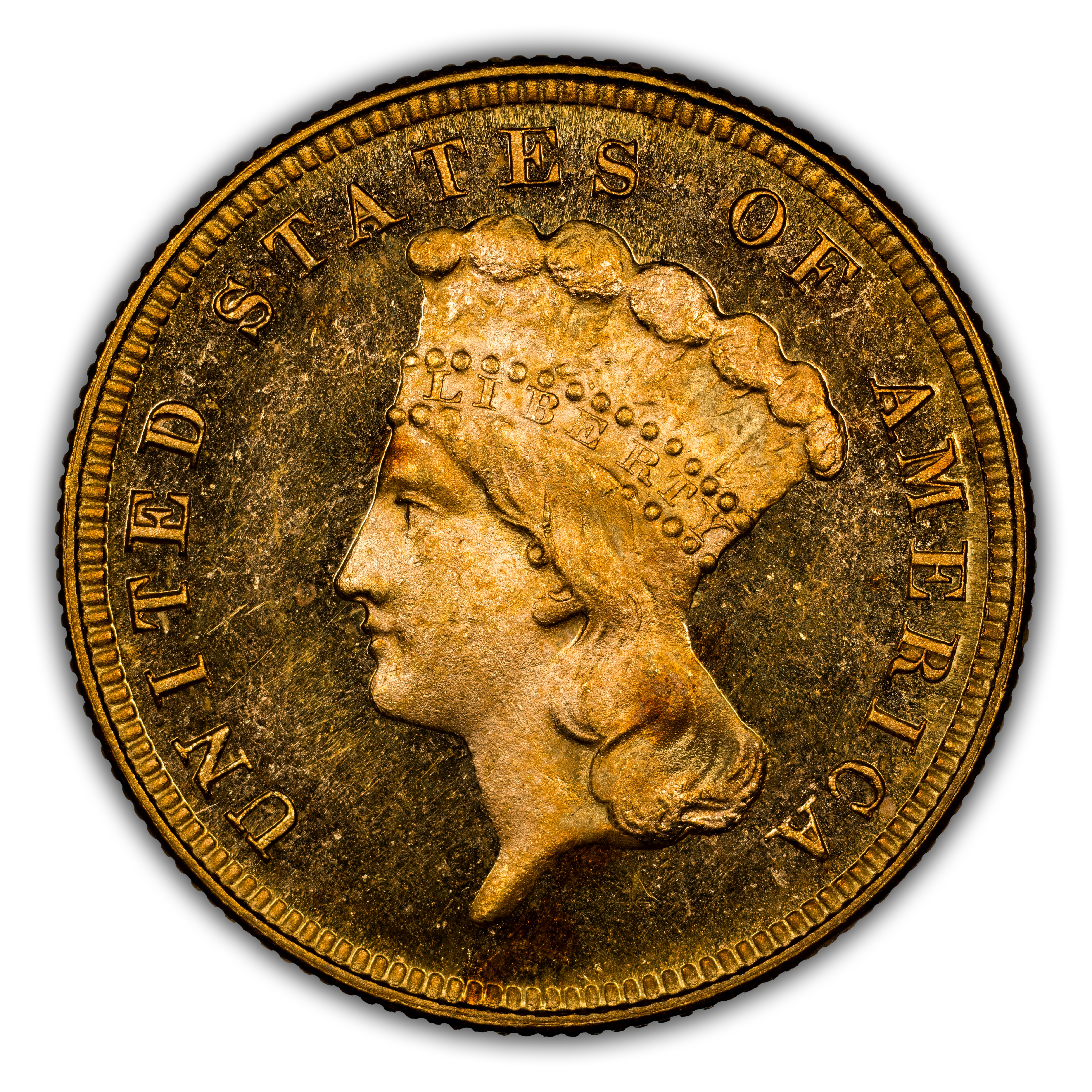 Reverse: "3 DOLLARS" is centered with date below, surrounded by a large wreath tied in a bow at the bottom.