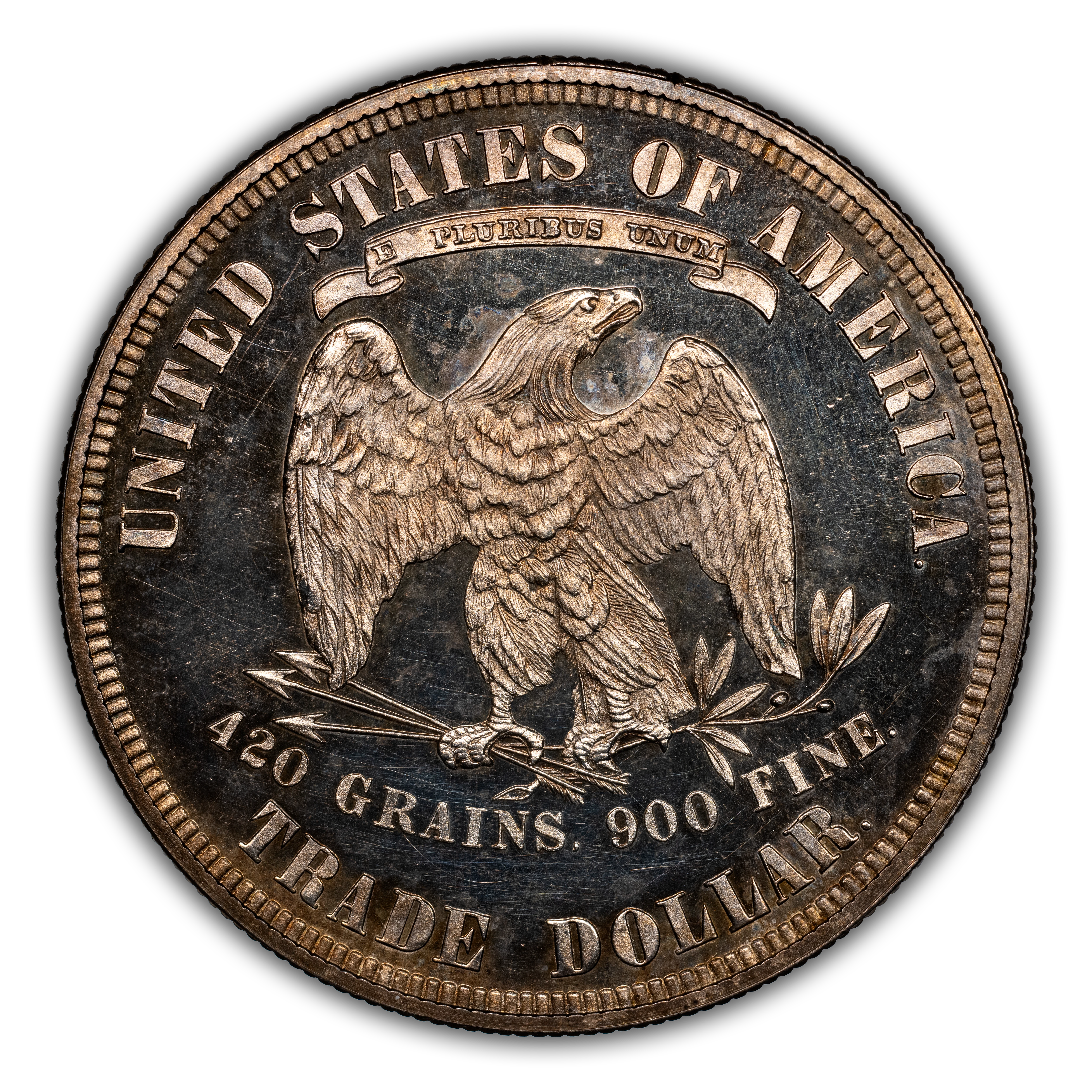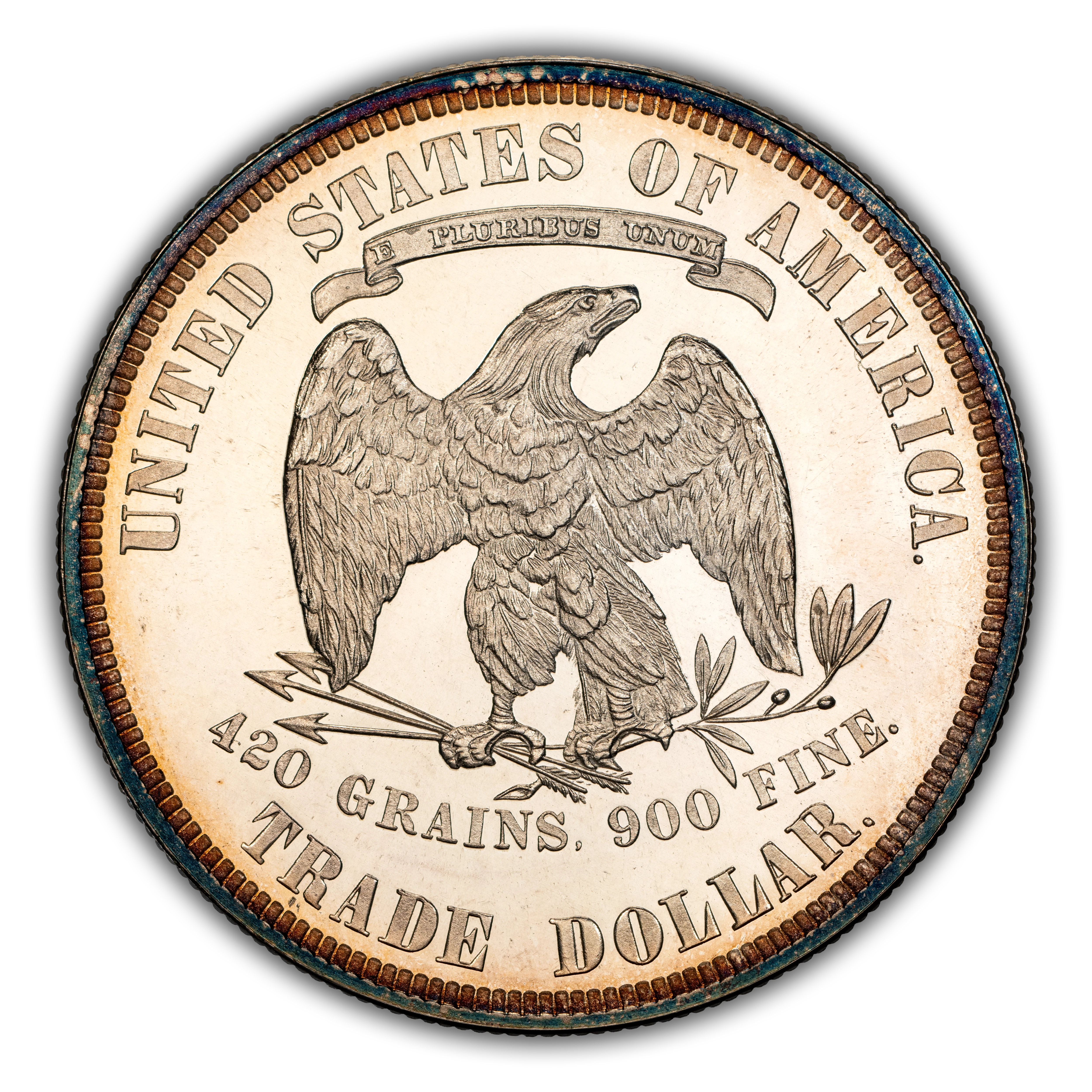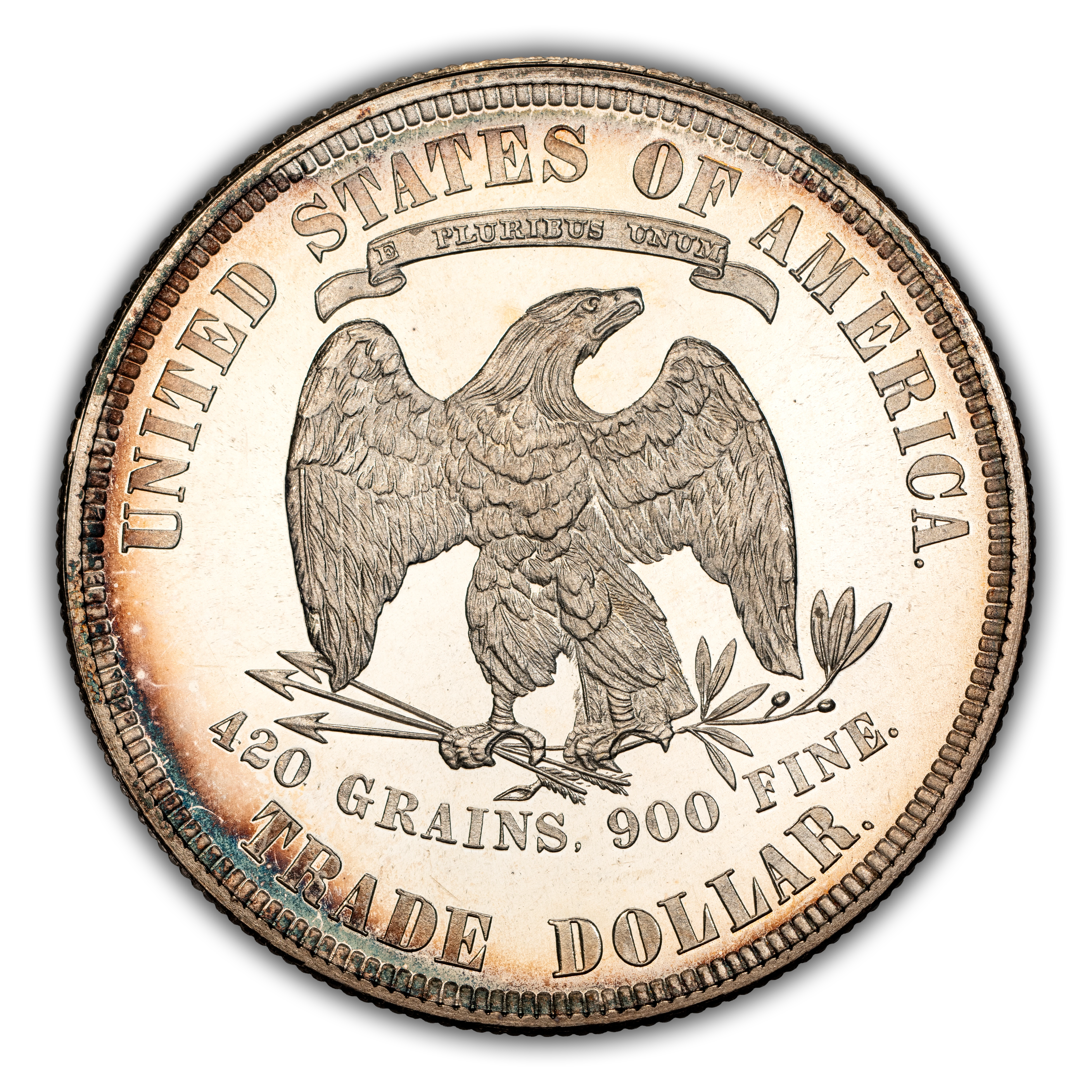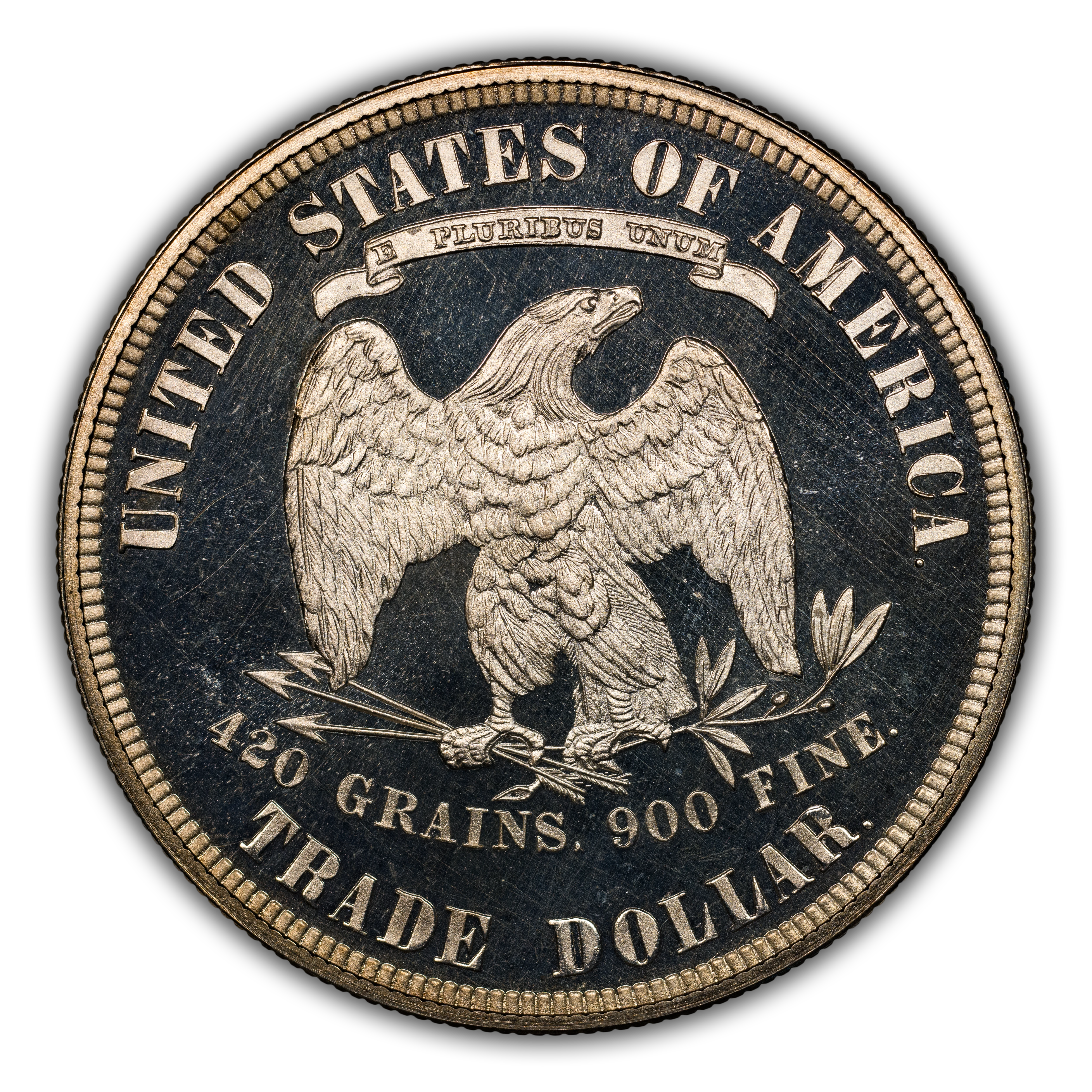 Reverse: An eagle is centered in the design with the weight of the coin listed below as "420 GRAINS. 900 FINE." The words UNITED STATES OF AMERICA and TRADE DOLLAR adorn the top and bottom periphery with a ribbon stating the motto E PLURIBUS UNUM above the eagle's head.