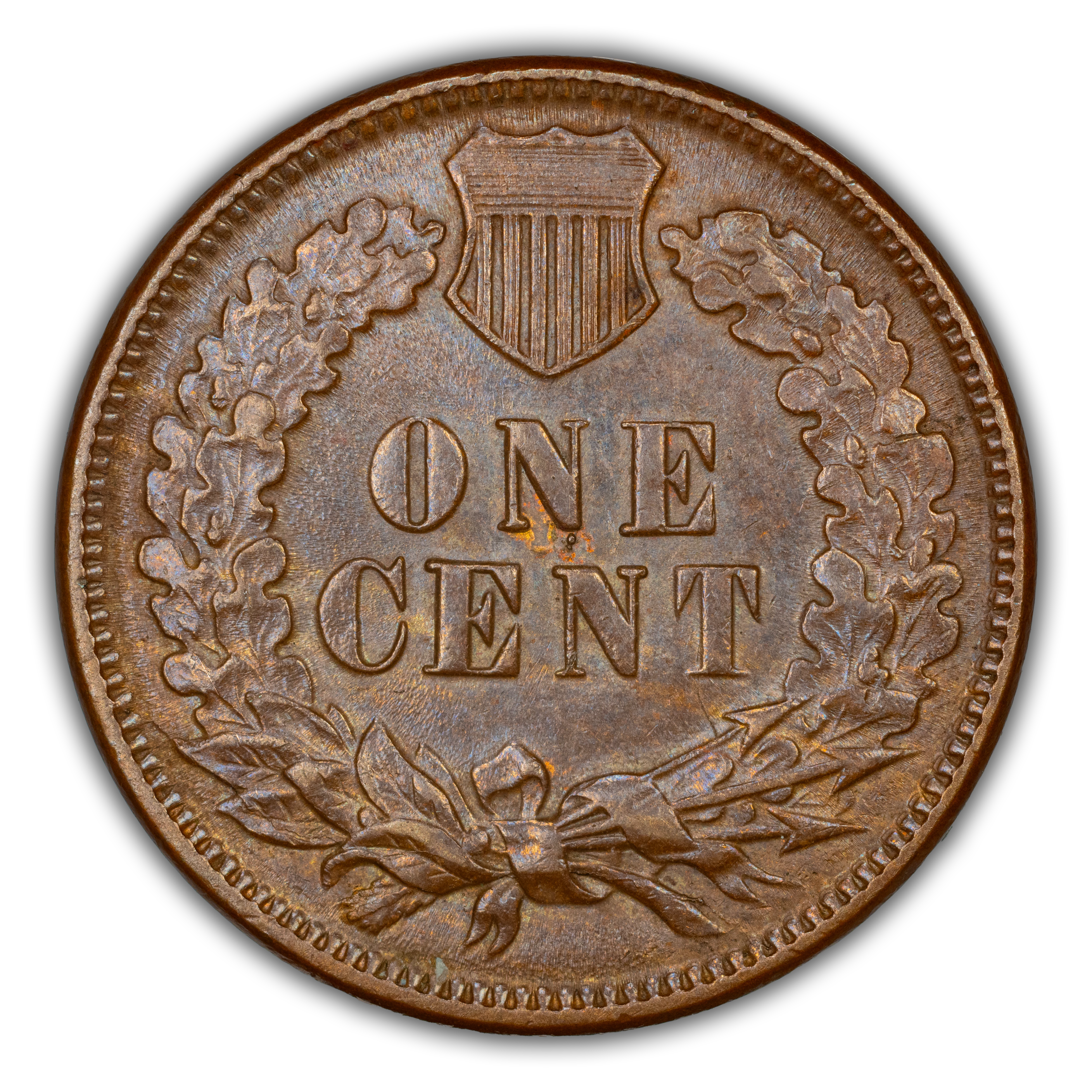 Reverse: The reverse bears the denomination of ONE CENT in the center surrounded by a wreath bearing a ribbon with arrows tied in at the bottom center.