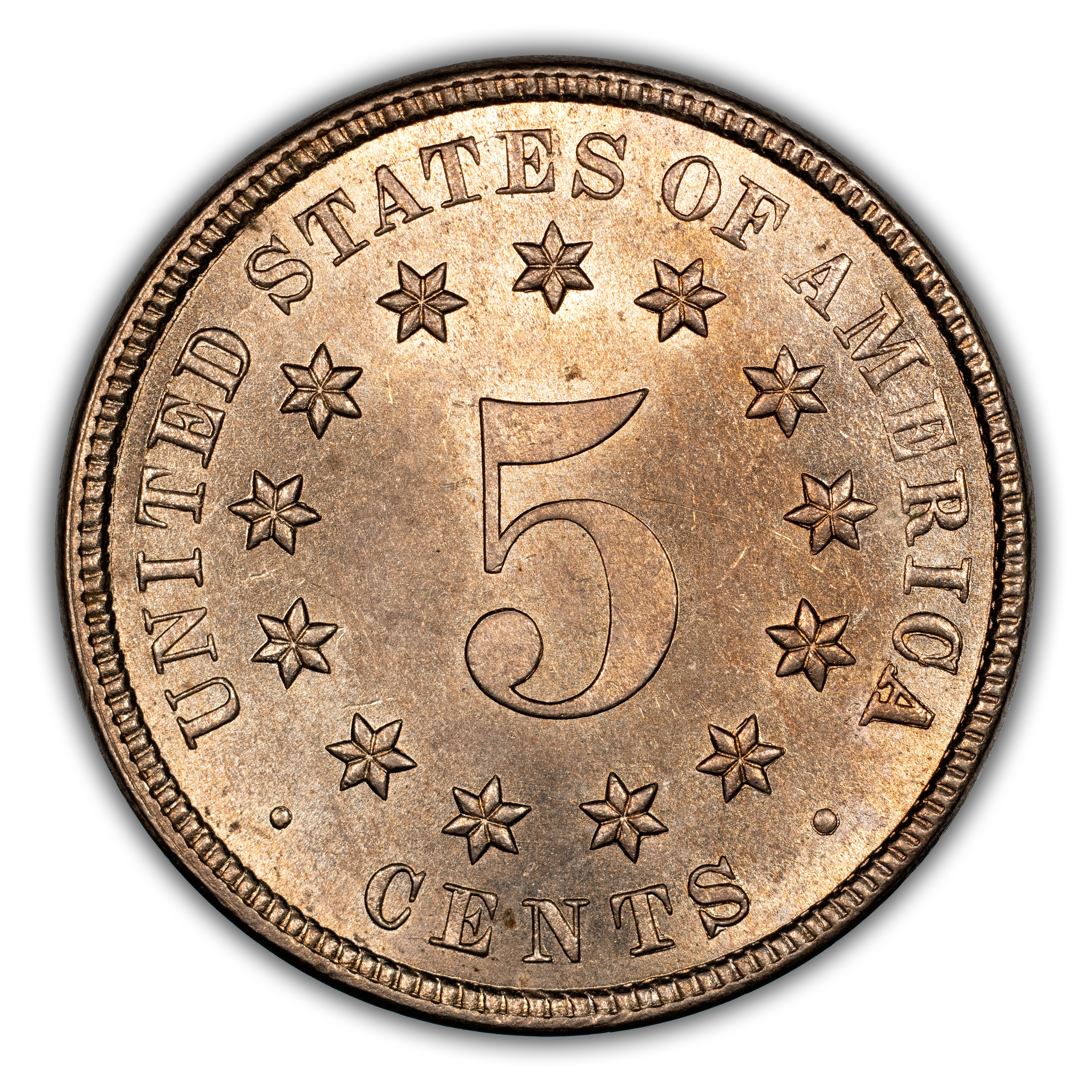 Reverse: A large numeral 5 surrounded by 13 stars centered in the design with UNITED STATES OF AMERICA * CENTS around the periphery.