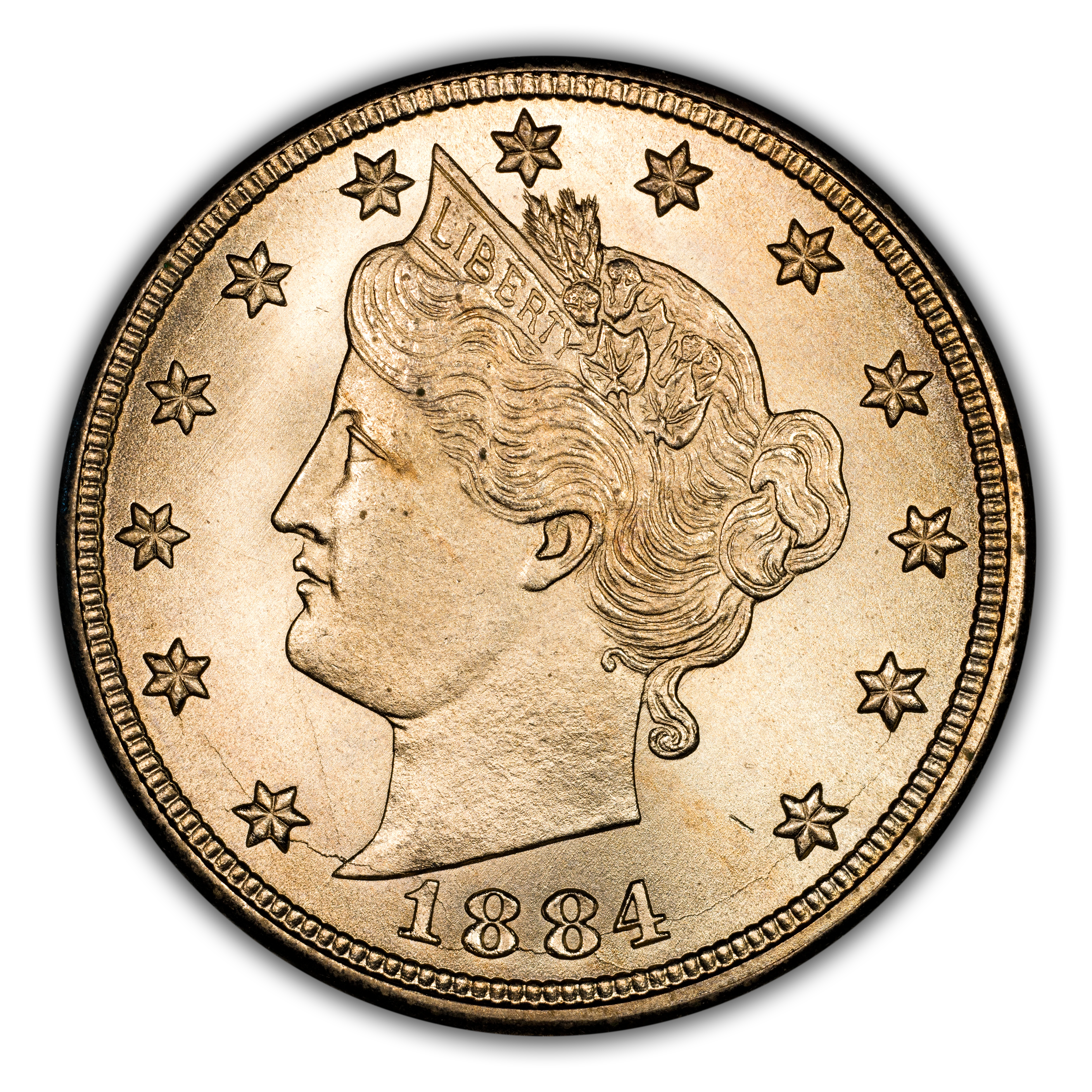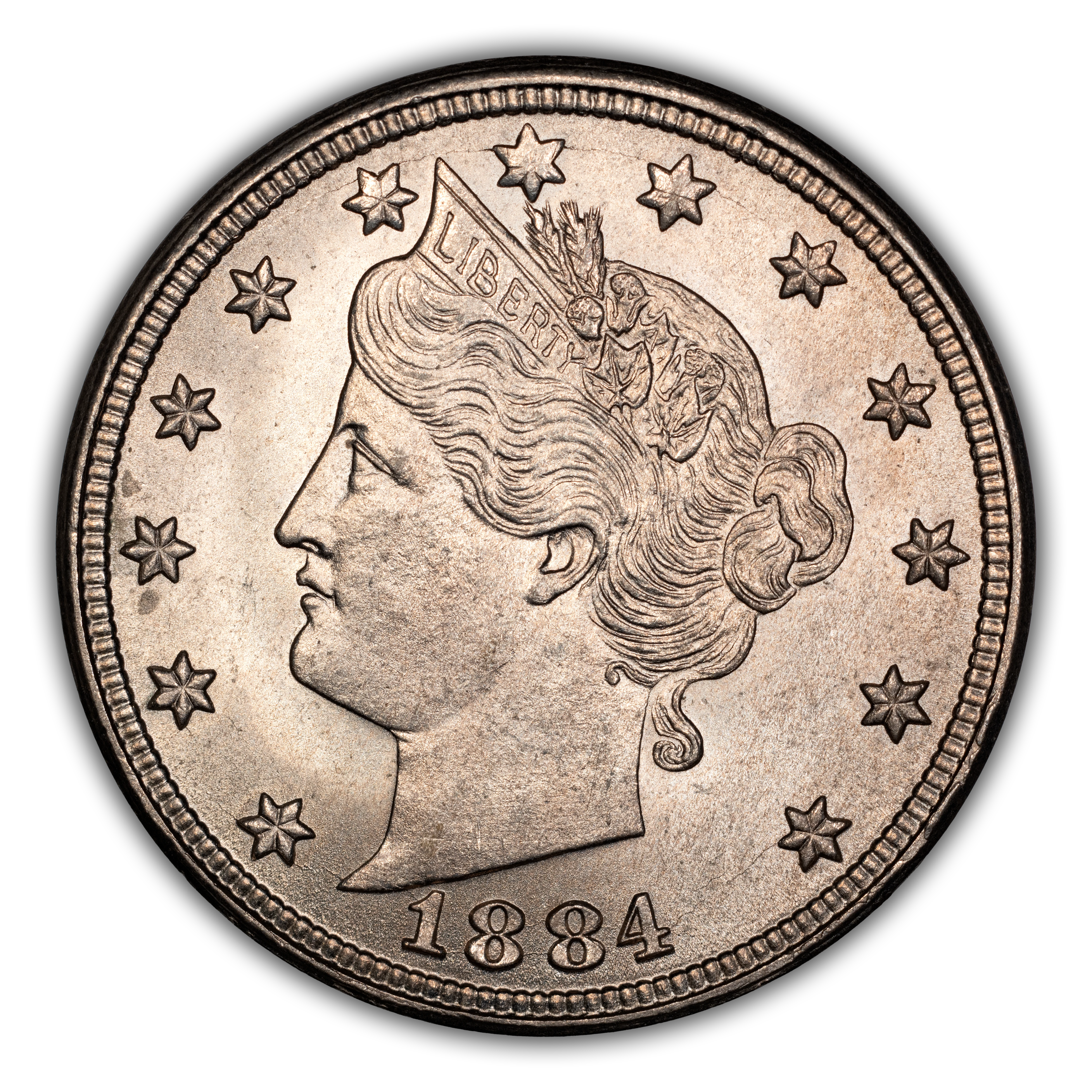 The 1884 V Nickel is very common from circulated grades up to and including MS65, leaving just the finest of gems with any scarcity at all. A fantastic type coin as it is affordable and displays strong strikes and luster ranging from flashy to satiny.