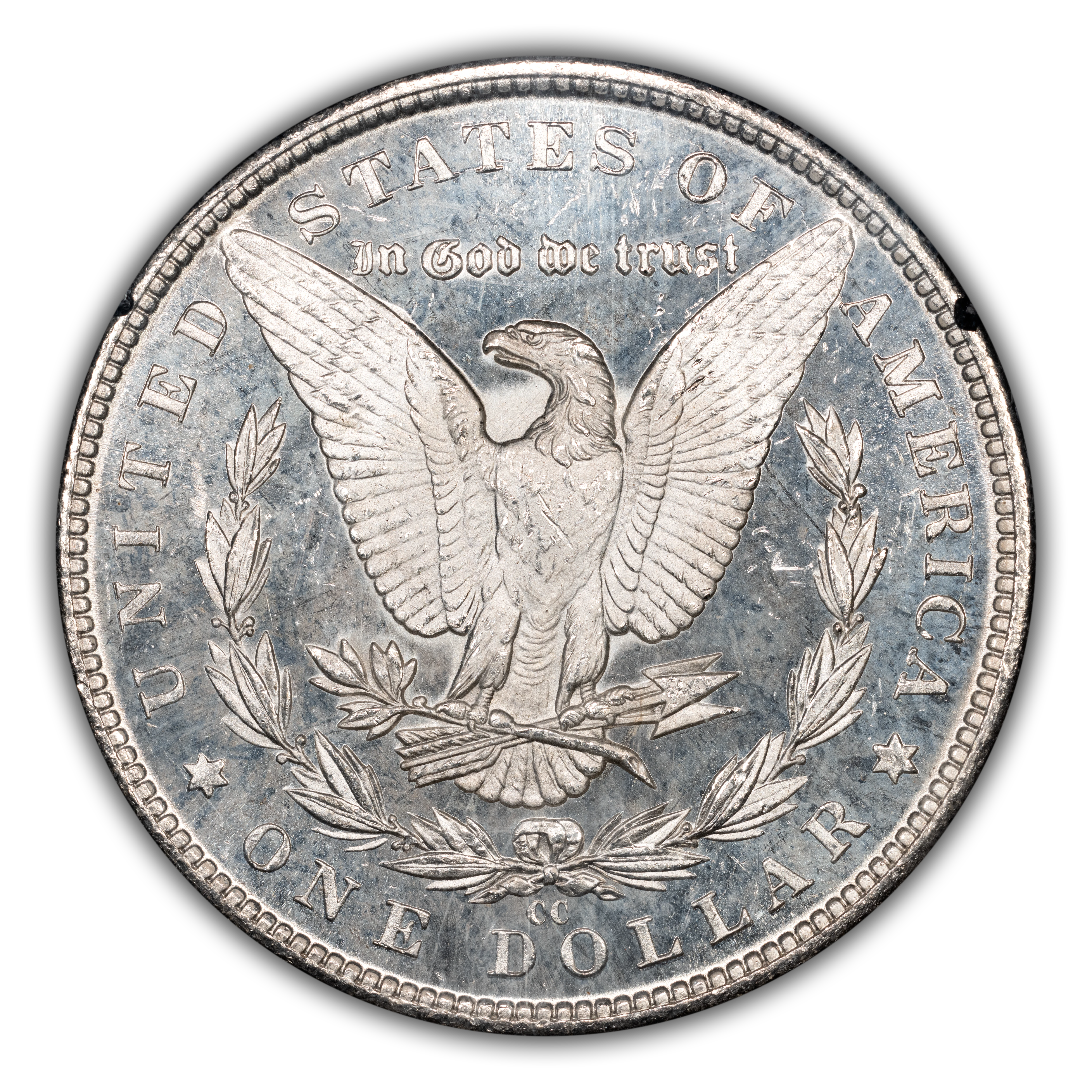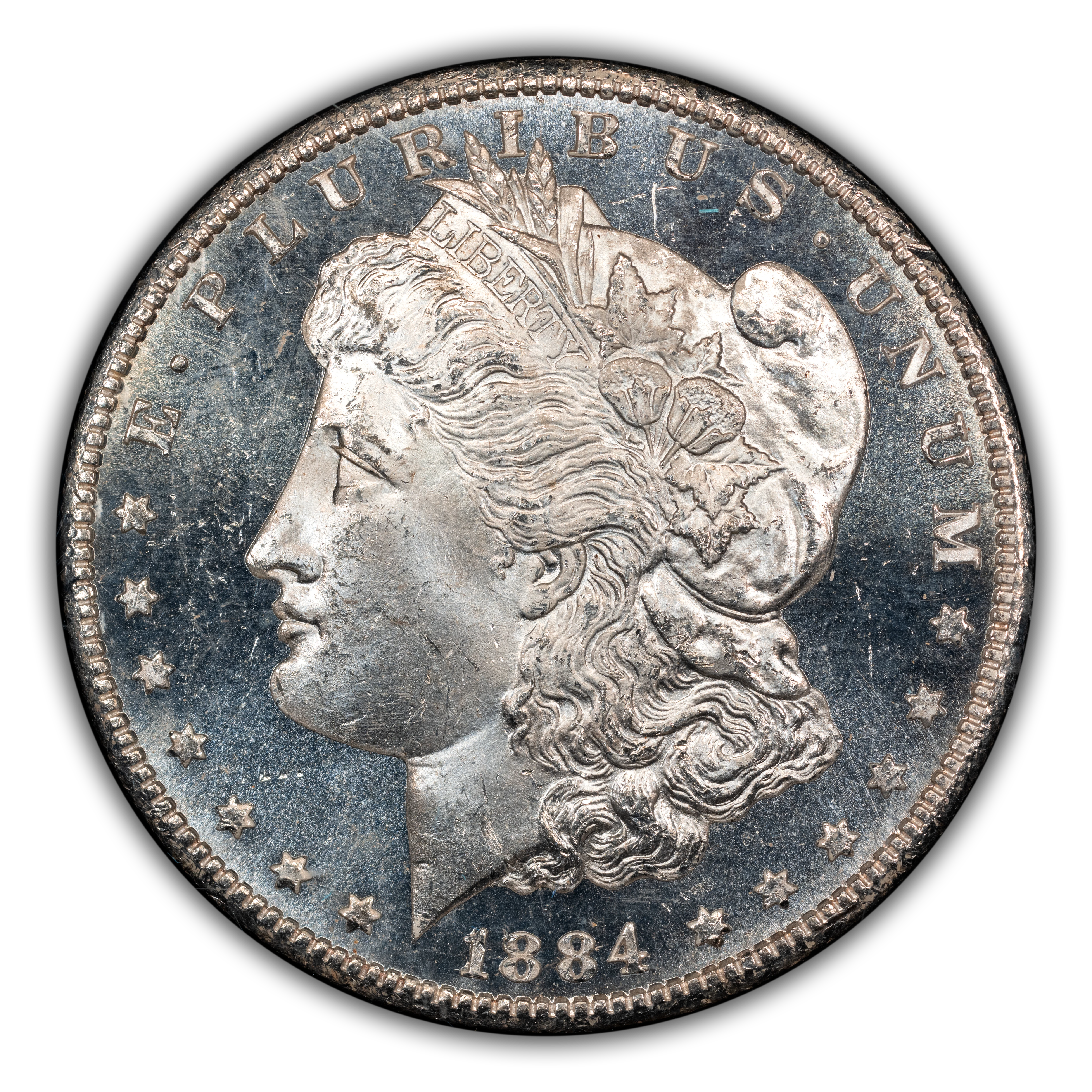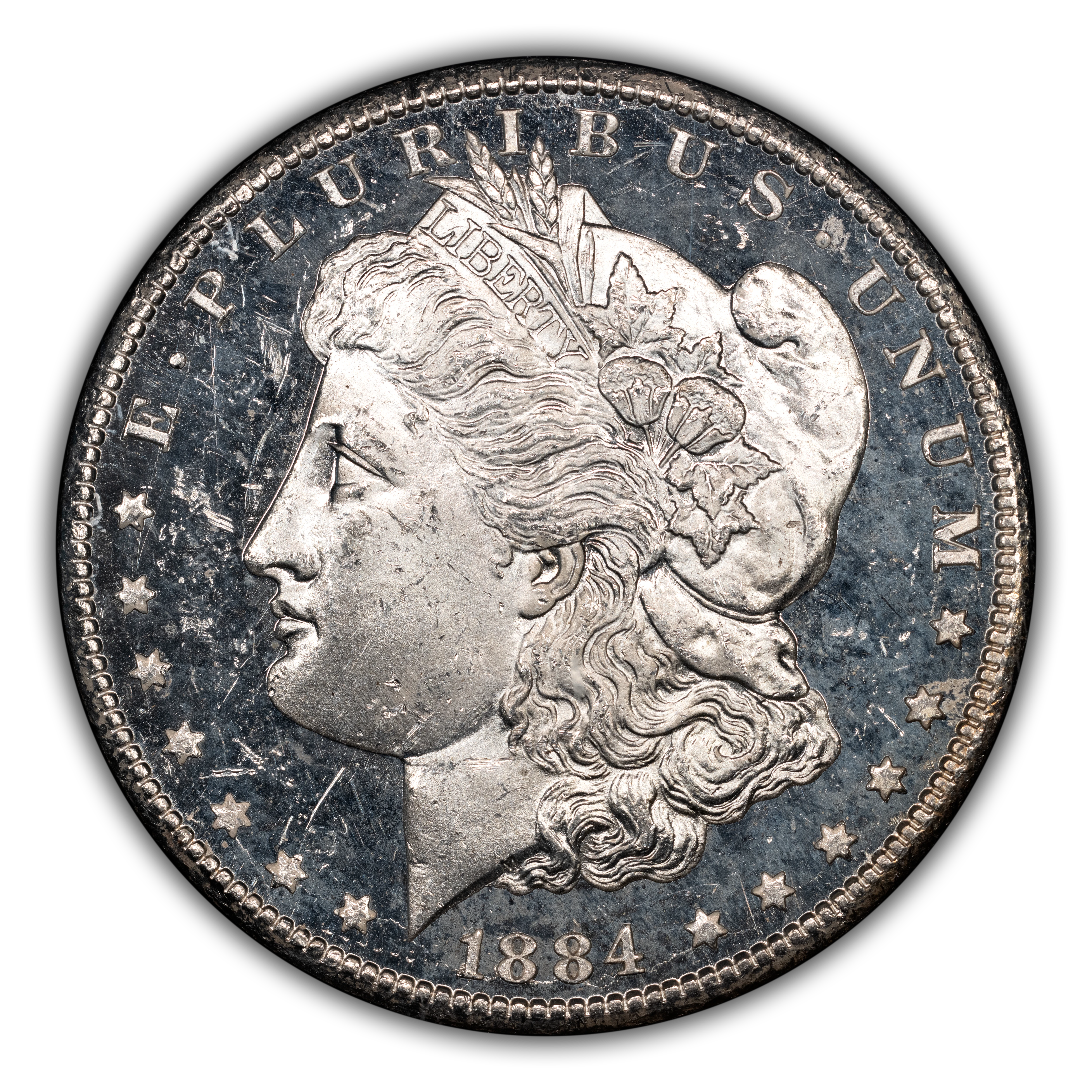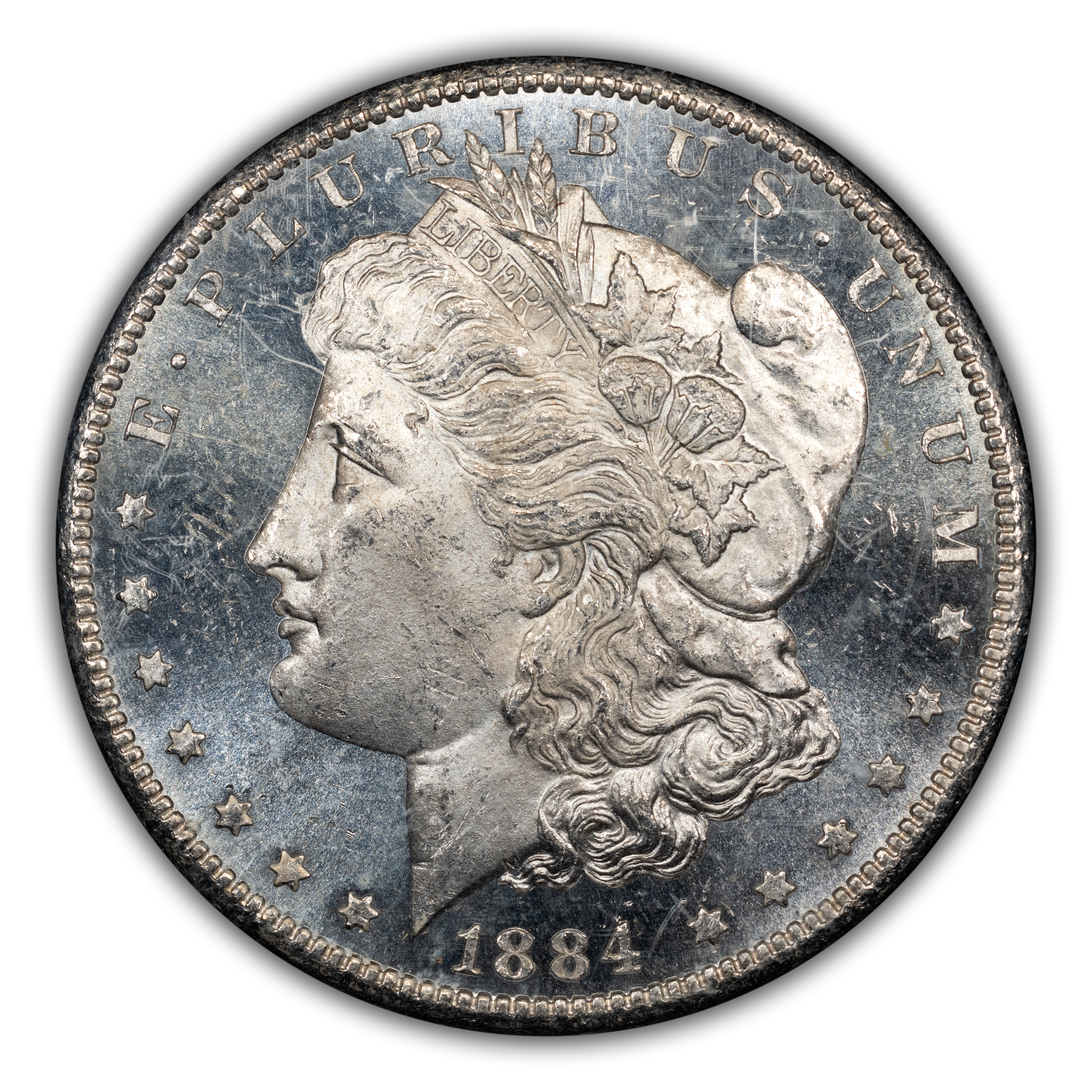The 1884-CC GSA Morgan dollar is the most common of all GSA Hoard silver dollars, counting for a remarkable 962,638 examples out of a total production of 1,136,000. Number crunchers will see that the total sum of 1884-CC GSA Morgan dollars accounts for approximately half of all GSA silver dollars sold in the 1970s and early 1980s as part of the Great Silver Sale. While relatively common, buyers place a premium on examples still in their original government GSA packaging, and PLs or DMPLs found within are highly desirable.