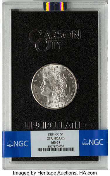 <B>1884-CC $1 GSA MS62 NGC.</B></I> CDN: $275 Whsle. Bid for NGC/PCGS MS62. Mintage 1,136,000....