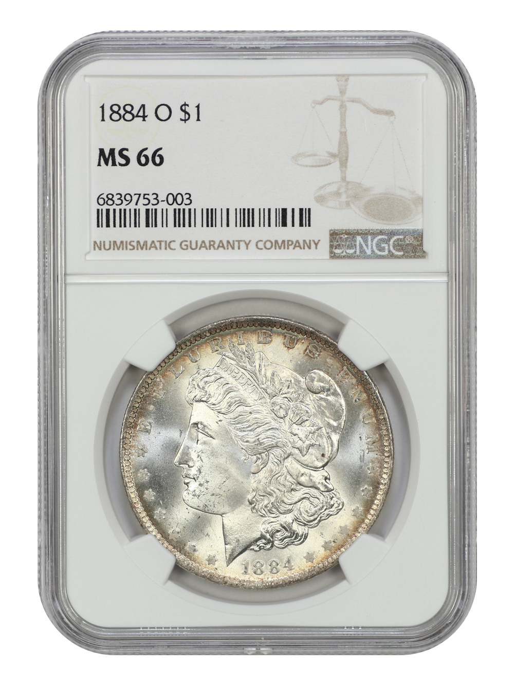 <B>1884-O $1 MS64 NGC.</B></I> Ex: McClaren Collection. CDN: $77 Whsle. Bid for NGC/PCGS MS64. Mintage 9,730,000. ...