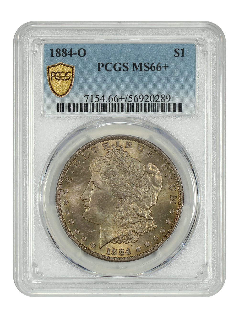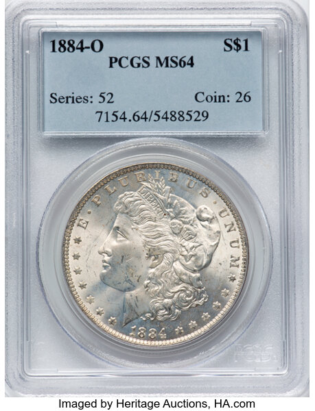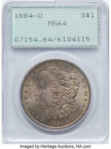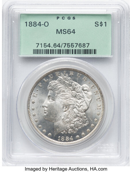 <B>1884-O $1 MS64 PCGS.</B></I> Housed in a Generation 1.2 "rattler" holder. CDN: $77 Whsle. Bid for NGC/PCGS MS64. Mintage 9,730,000...