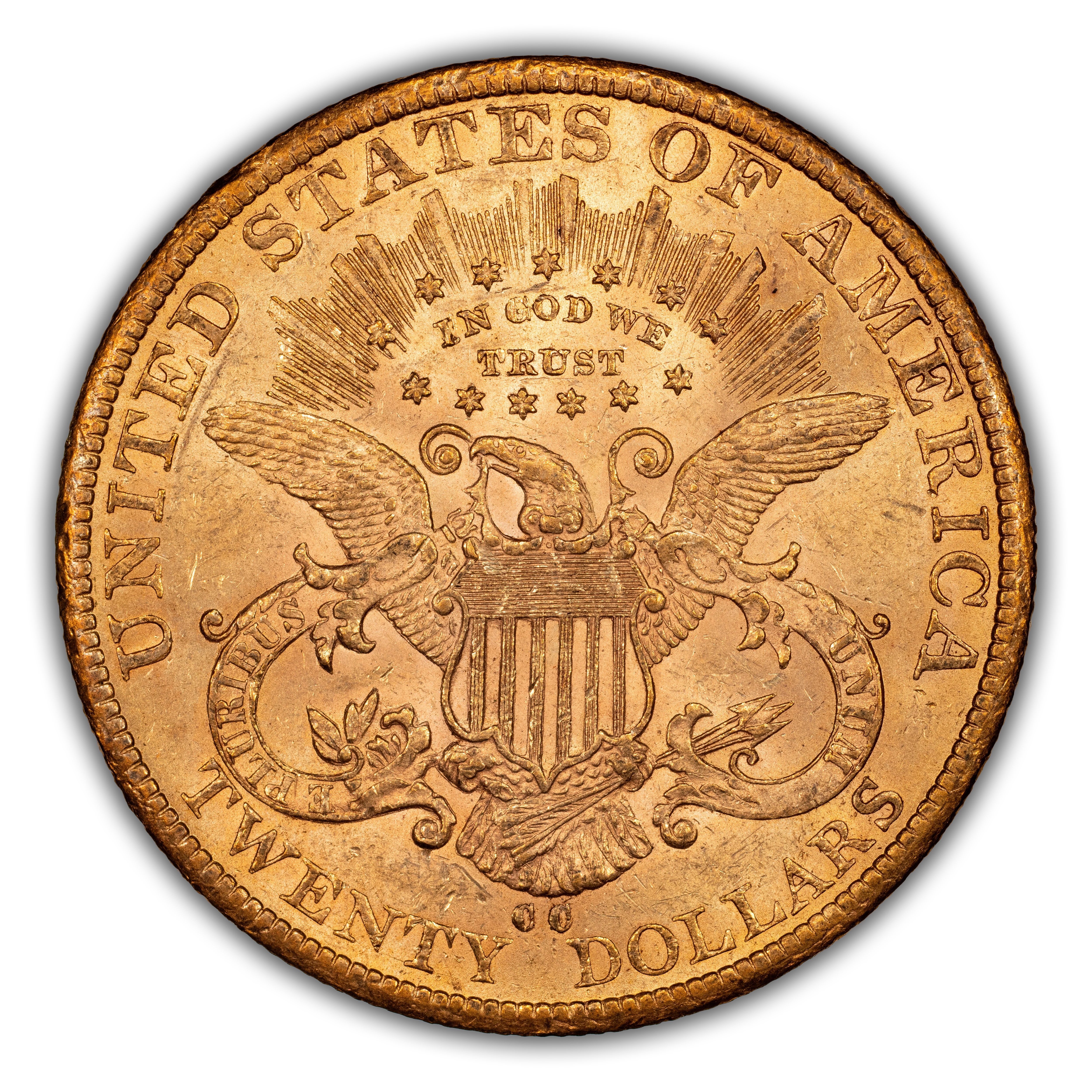 Reverse: Shielded eagle with wings outstretched holding arrows and olive branches. The words UNITED STATES OF AMERICA * TWENTY D. appear around the periphery. Mint mark, if any, appears below the eagle's tail, above the N in TWENTY.