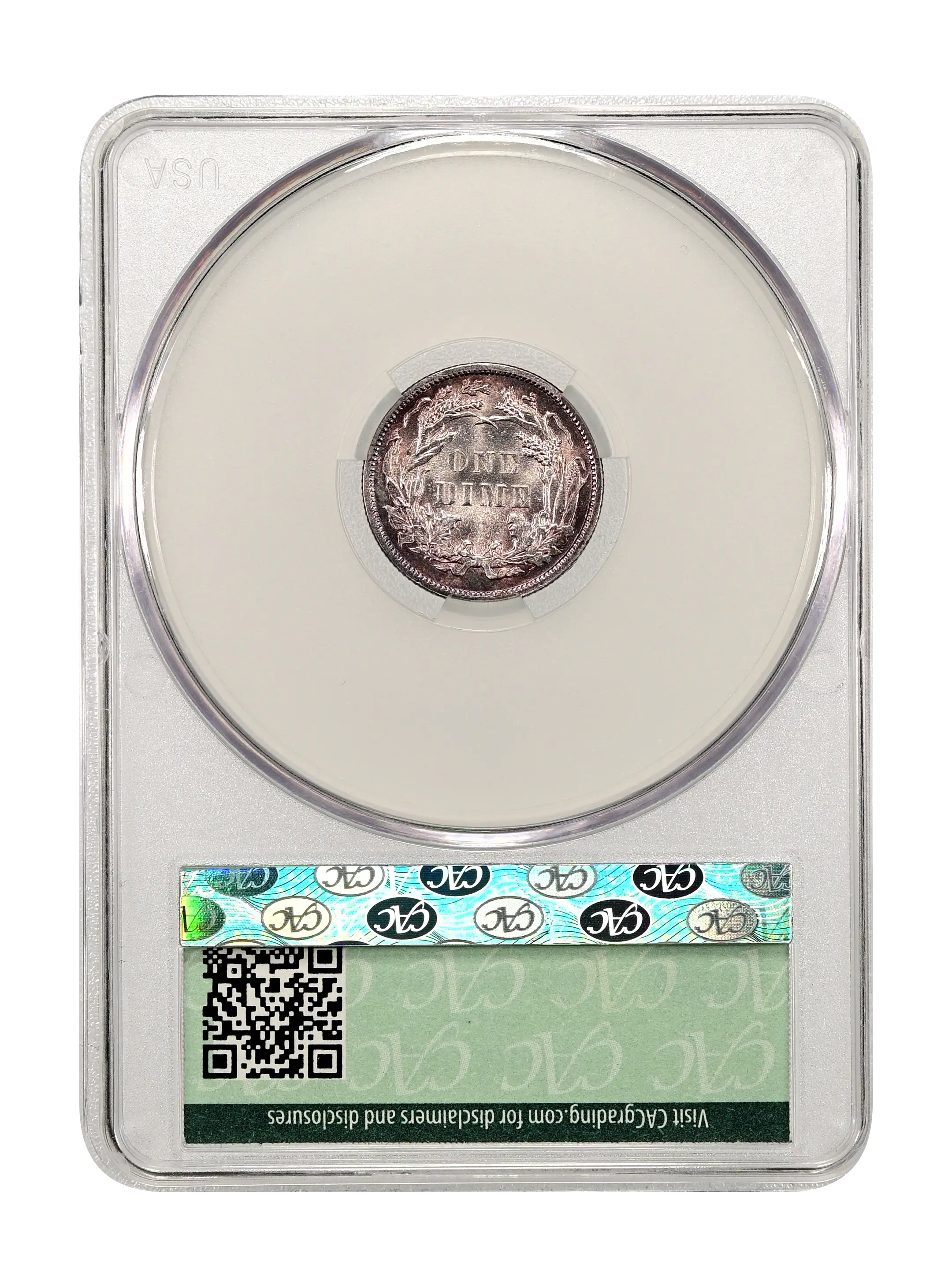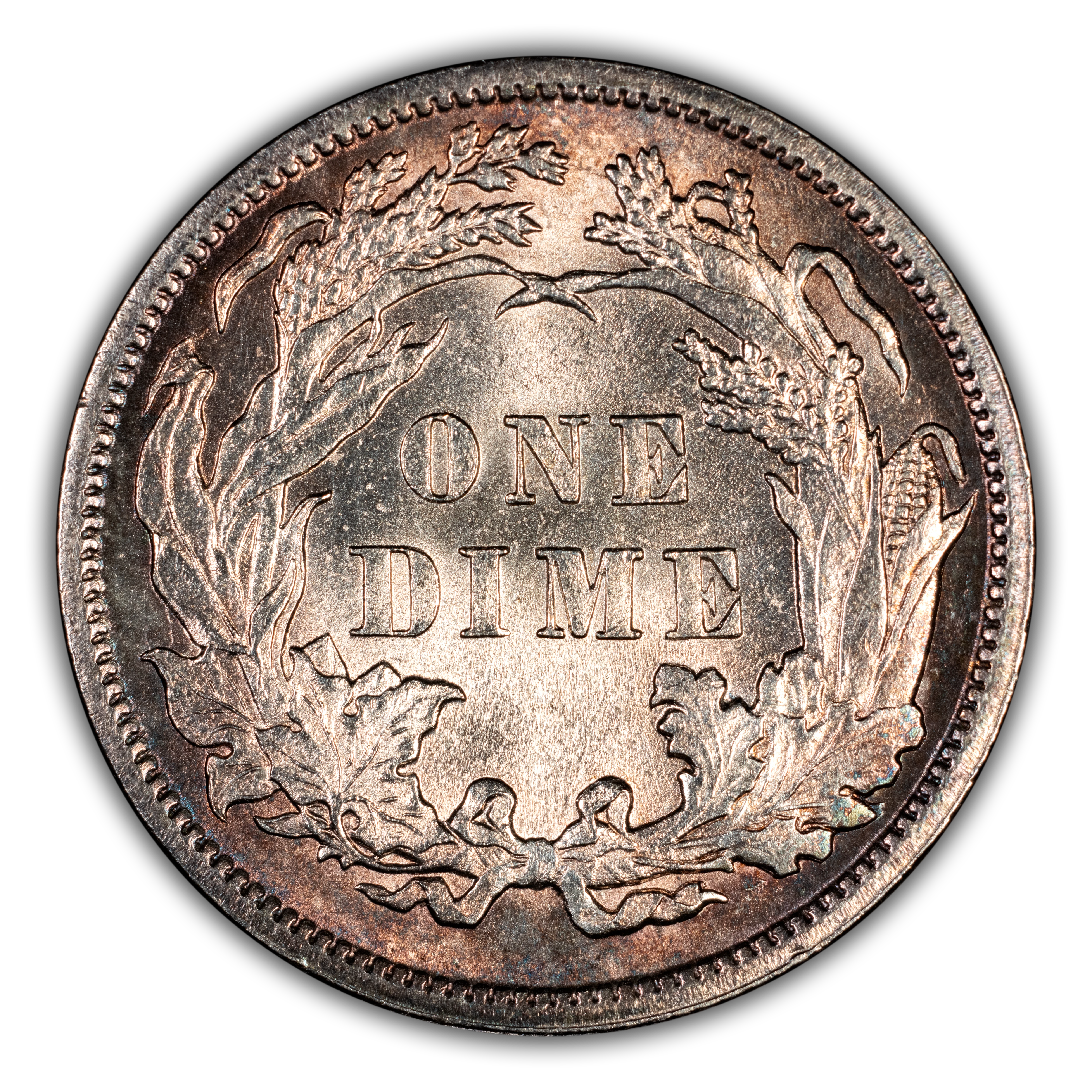 Reverse: ONE DIME is centered in the middle of the reverse surrounded by a wreath tied by a bow at the bottom.