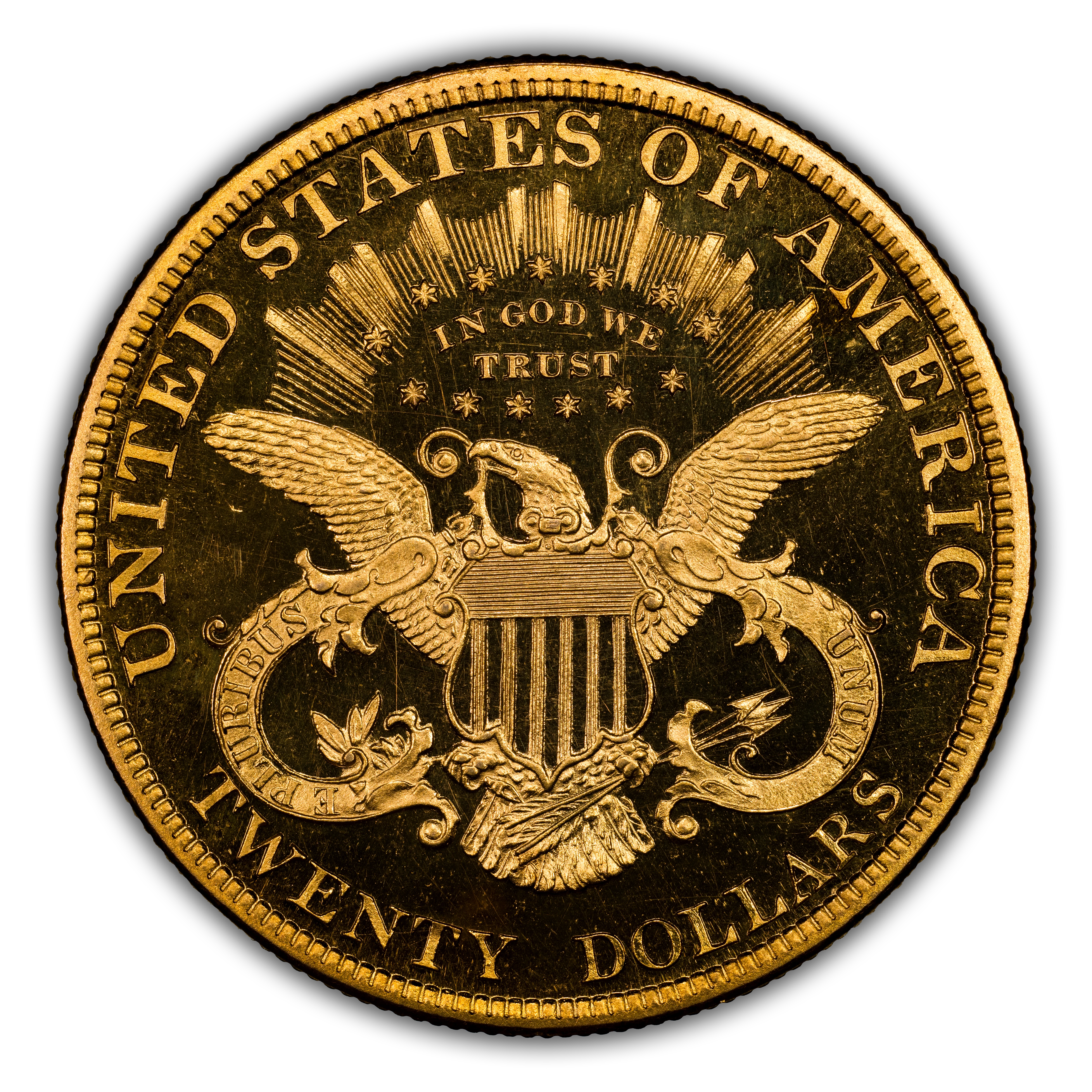 Reverse: Shielded eagle with wings outstretched holding arrows and olive branches. The words UNITED STATES OF AMERICA * TWENTY D. appear around the periphery. Mint mark, if any, appears below the eagle's tail, above the N in TWENTY.