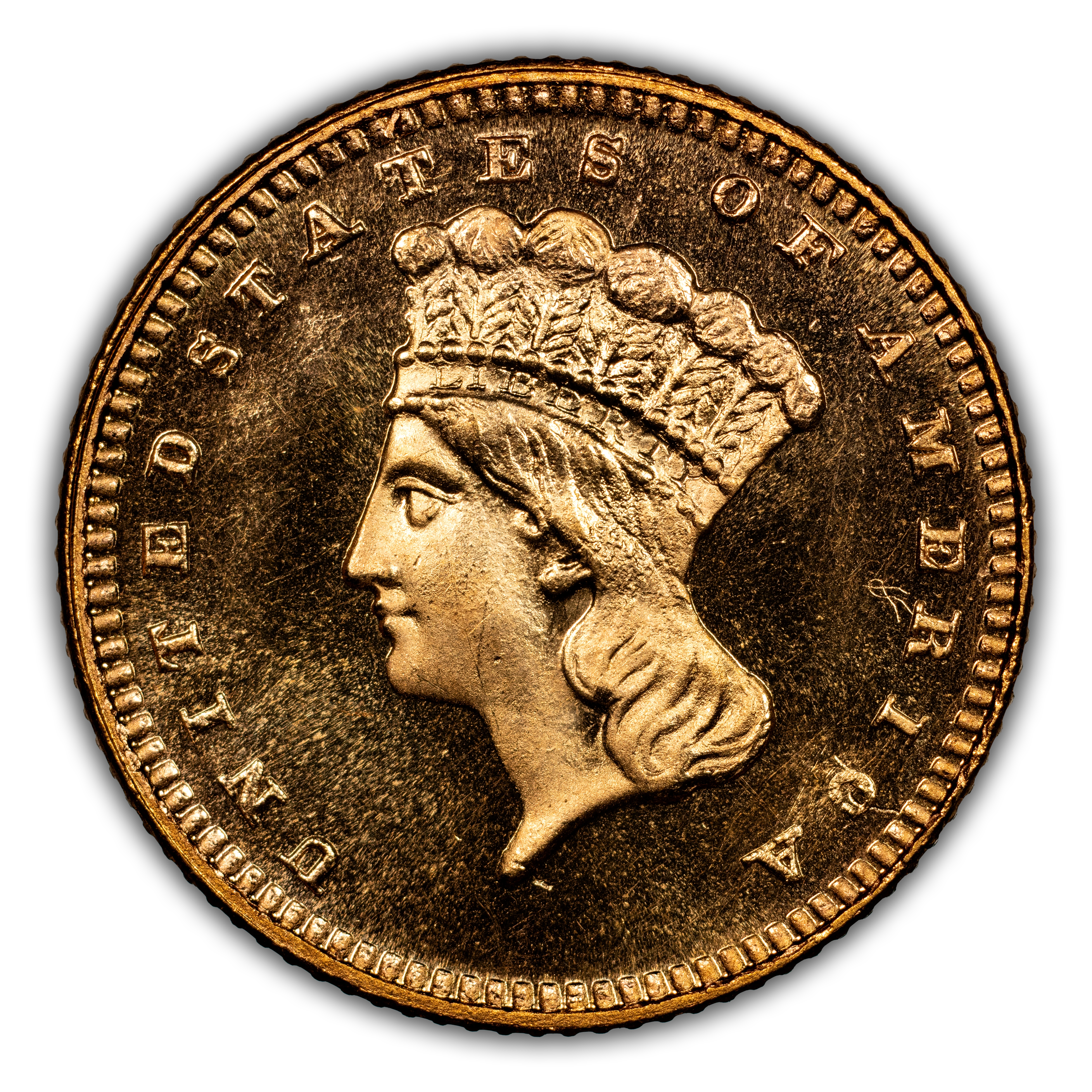 Obverse: Indian head portrait with crown centered in the design surrounded by UNITED STATES OF AMERICA around the periphery.