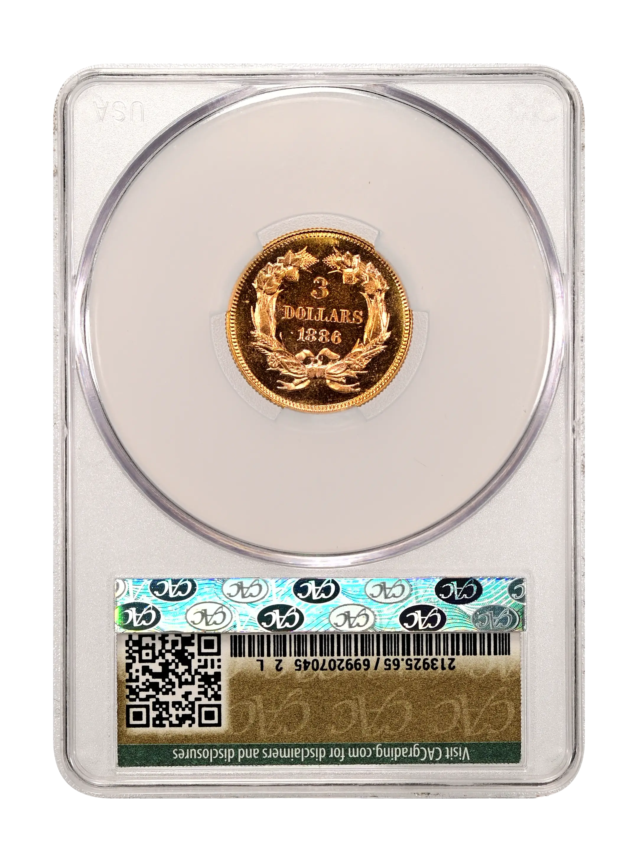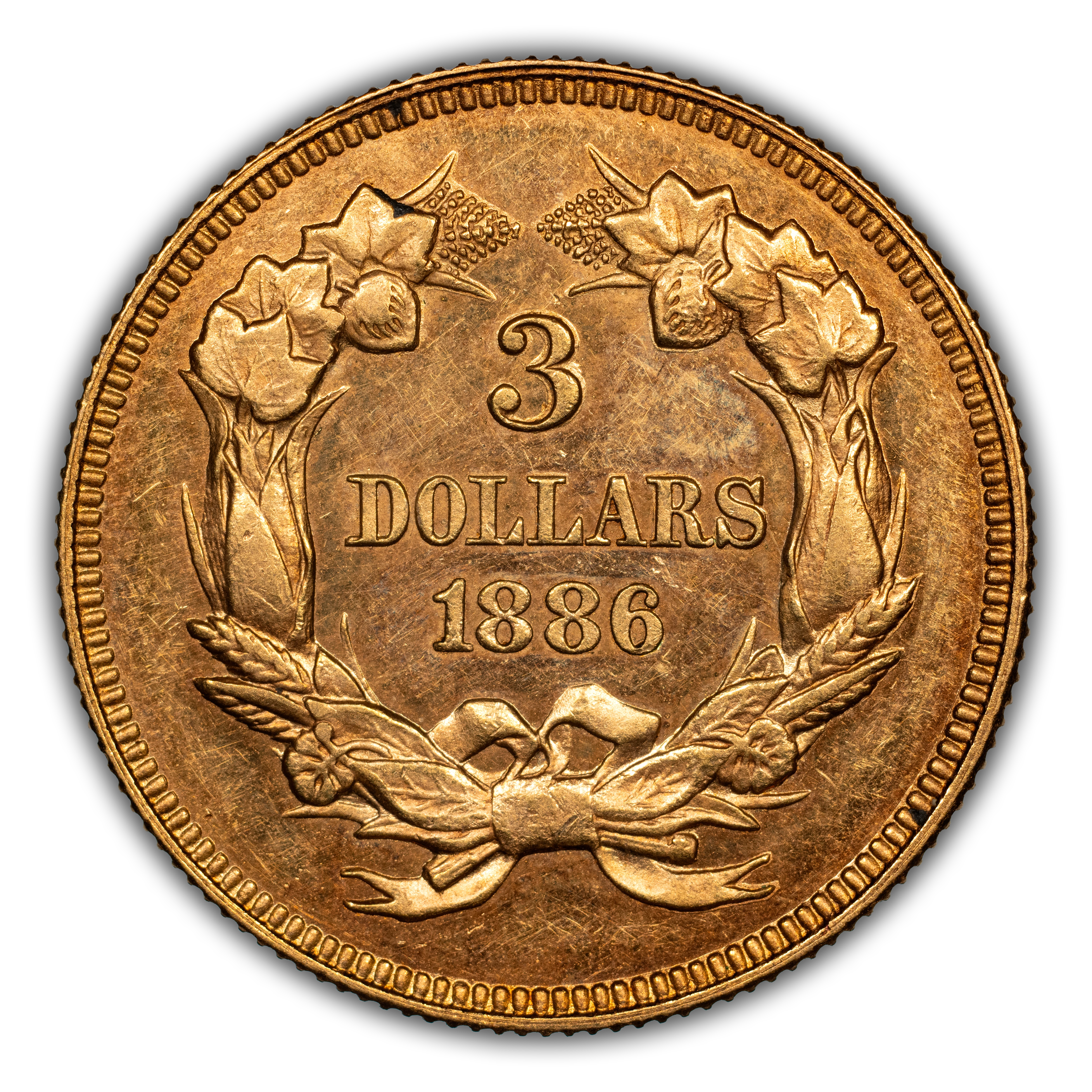 Reverse: "3 DOLLARS" is centered with date below, surrounded by a large wreath tied in a bow at the bottom.