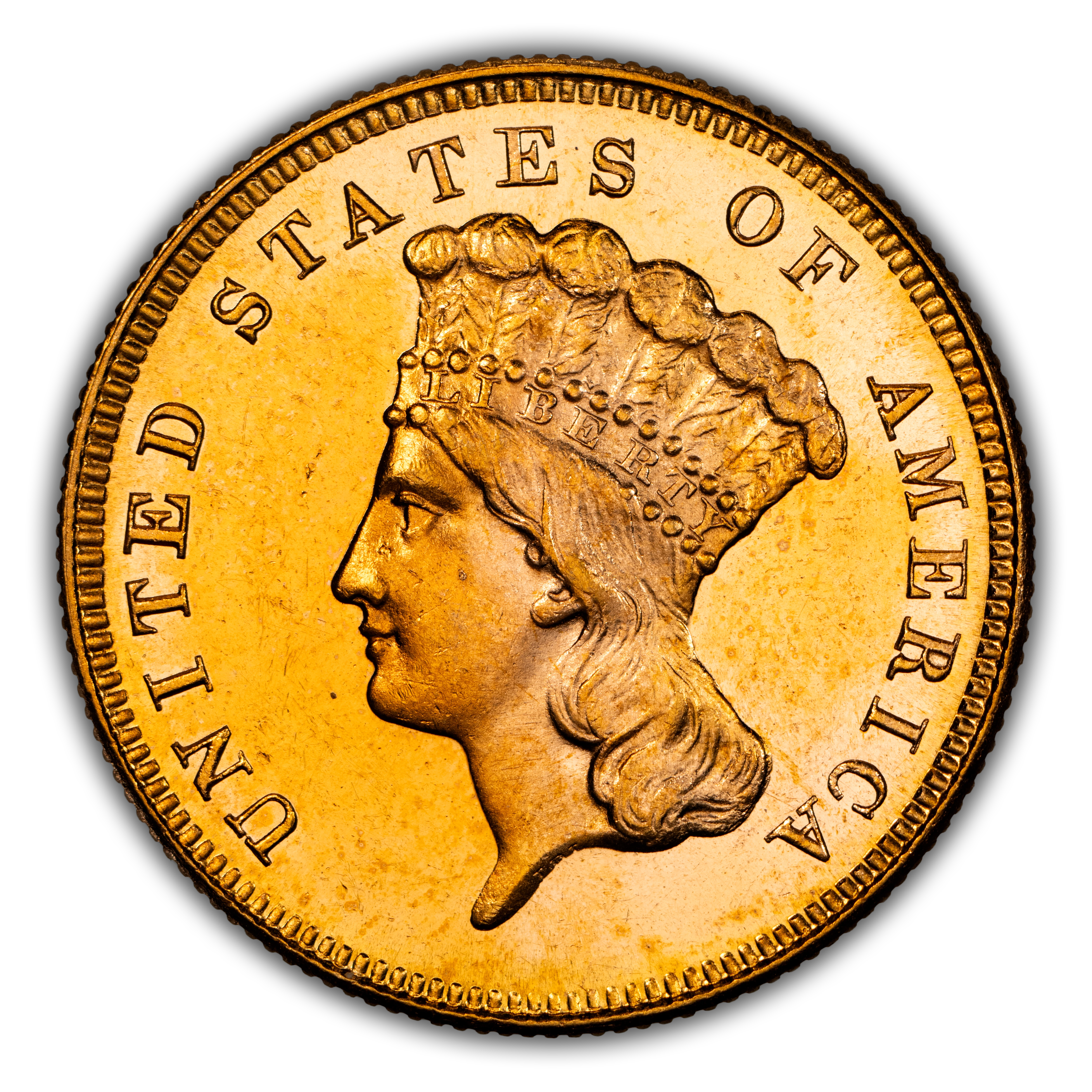 Obverse: The head of a Native American princess with a crown of feathers atop her head. The words UNITED STATES OF AMERICAN circle the periphery from 7 o'clock to 5 o'clock.