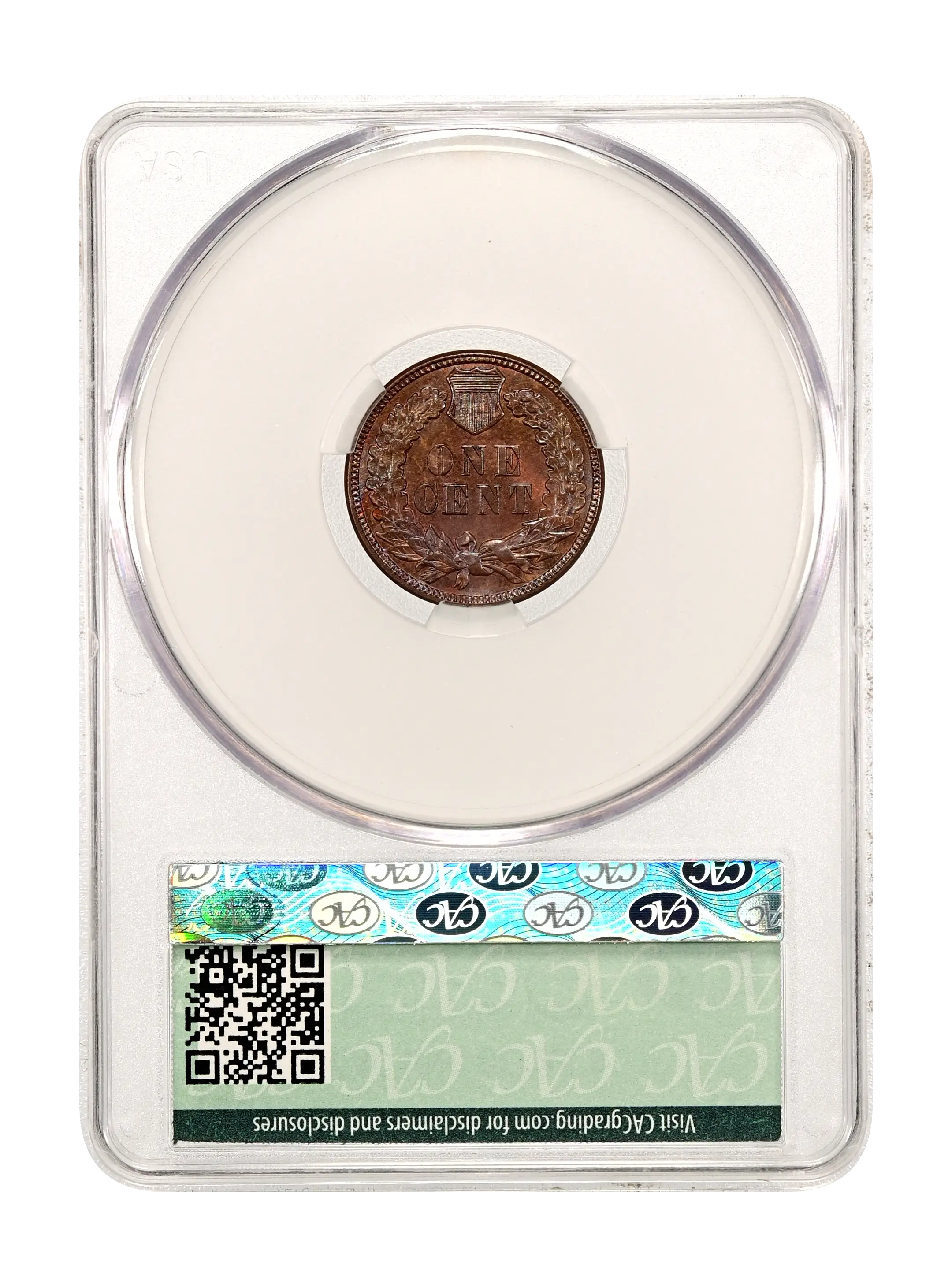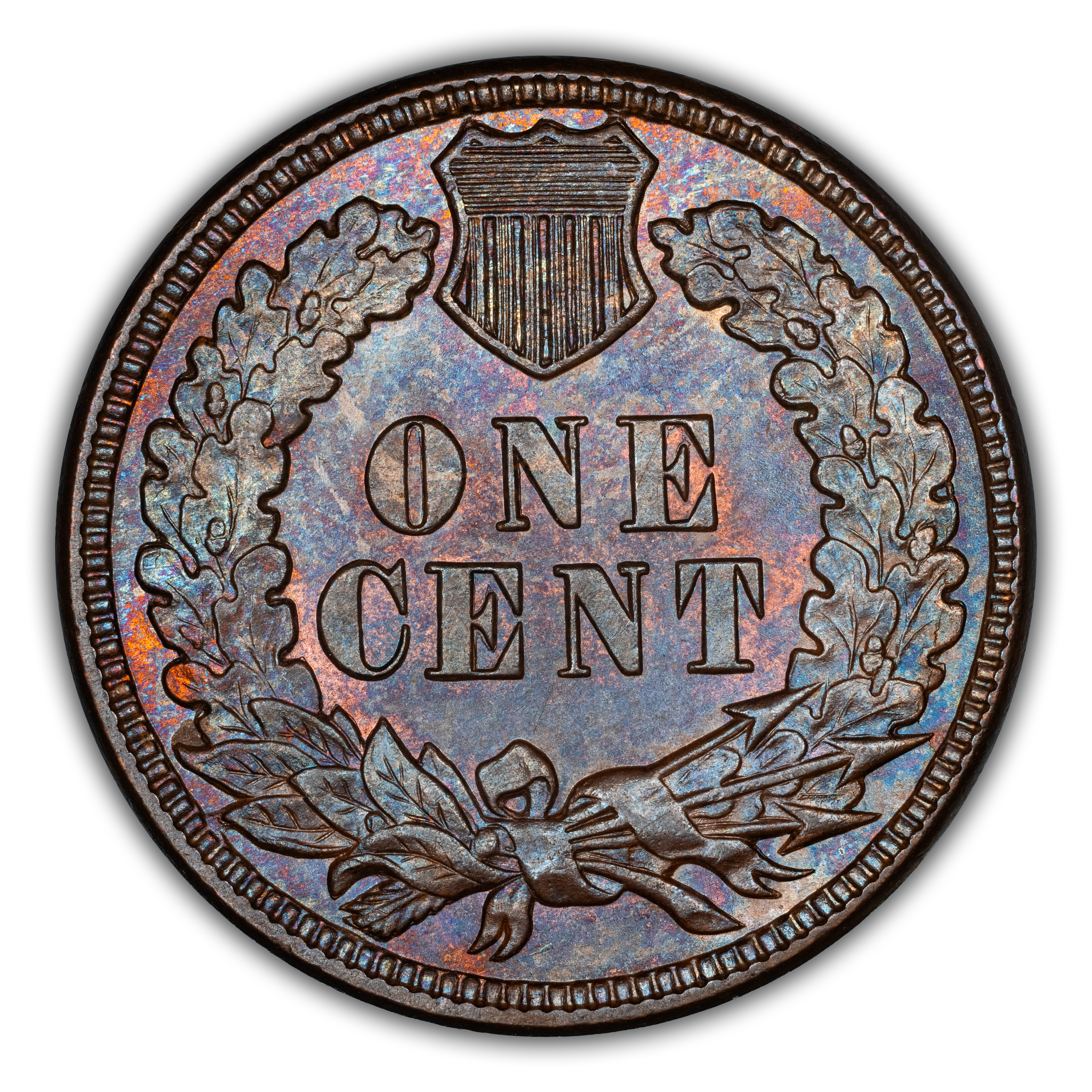 Reverse: The reverse bears the denomination of ONE CENT in the center surrounded by a wreath bearing a ribbon with arrows tied in at the bottom center.