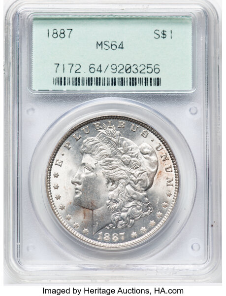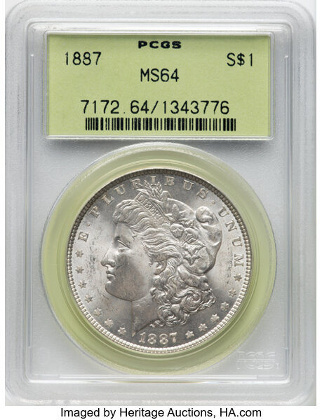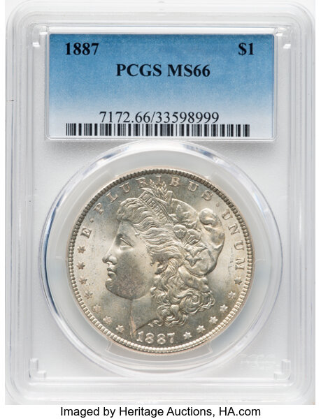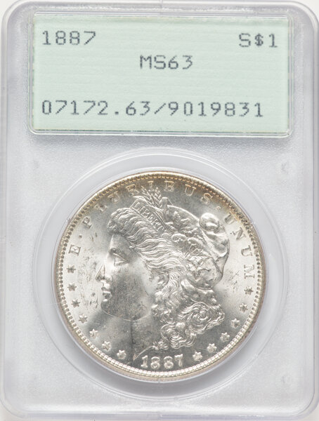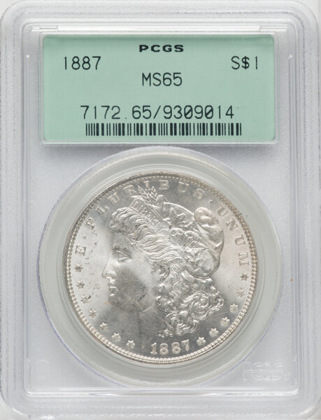 A very common issue, the 1887 Morgan dollar is readily available in all grades through MS66. It becomes quite scarce in MS67 and extremely rare in MS68, a grade for which a tiny number of specimens are known. PLs and DMPLs are scarce but found with frequency in the marketplace and can be bought for a price.