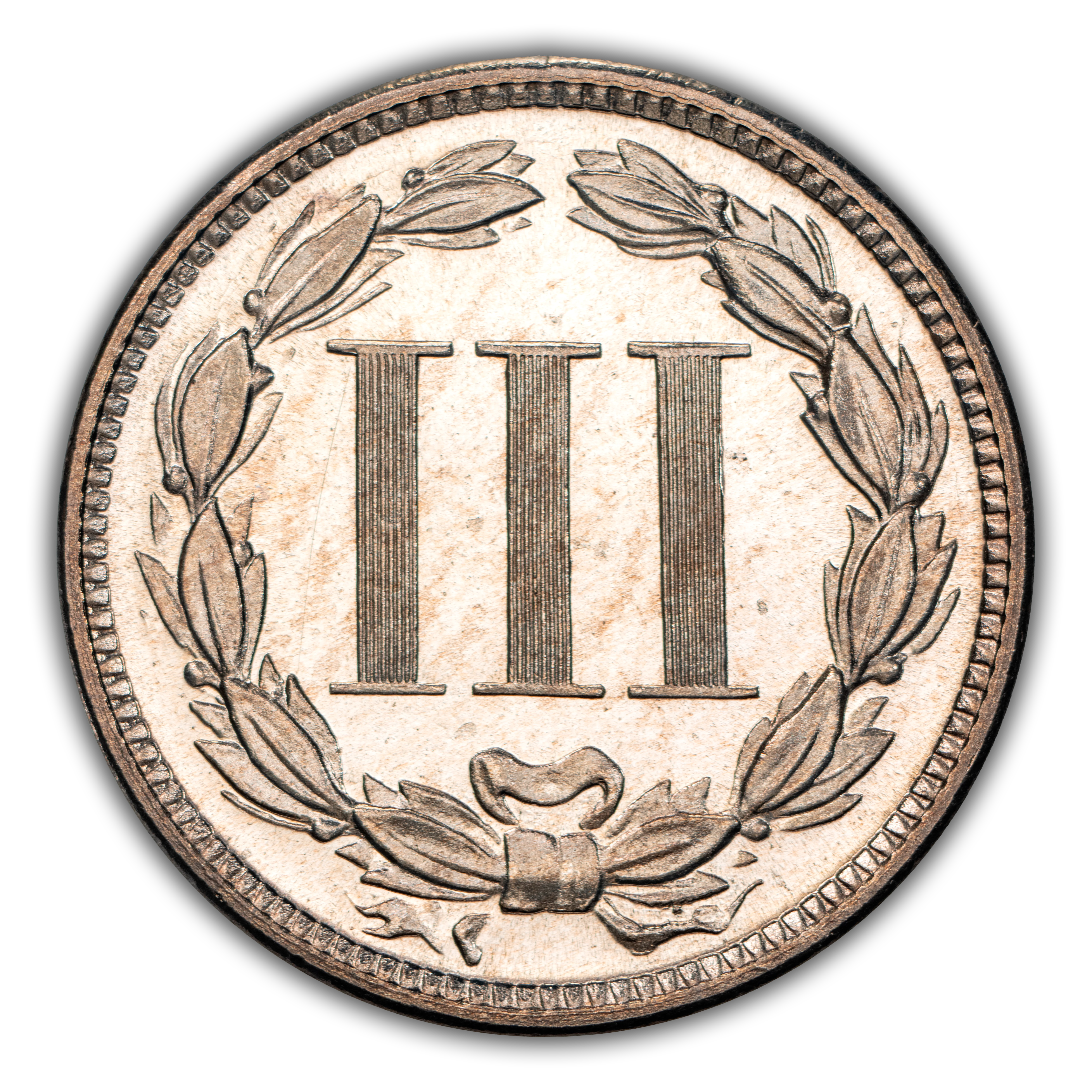 Reverse: The roman numeral III is centered in the design surrounded by a large wreath tied with a bow at the bottom. This design is one of few American coins without wording on one of the sides.