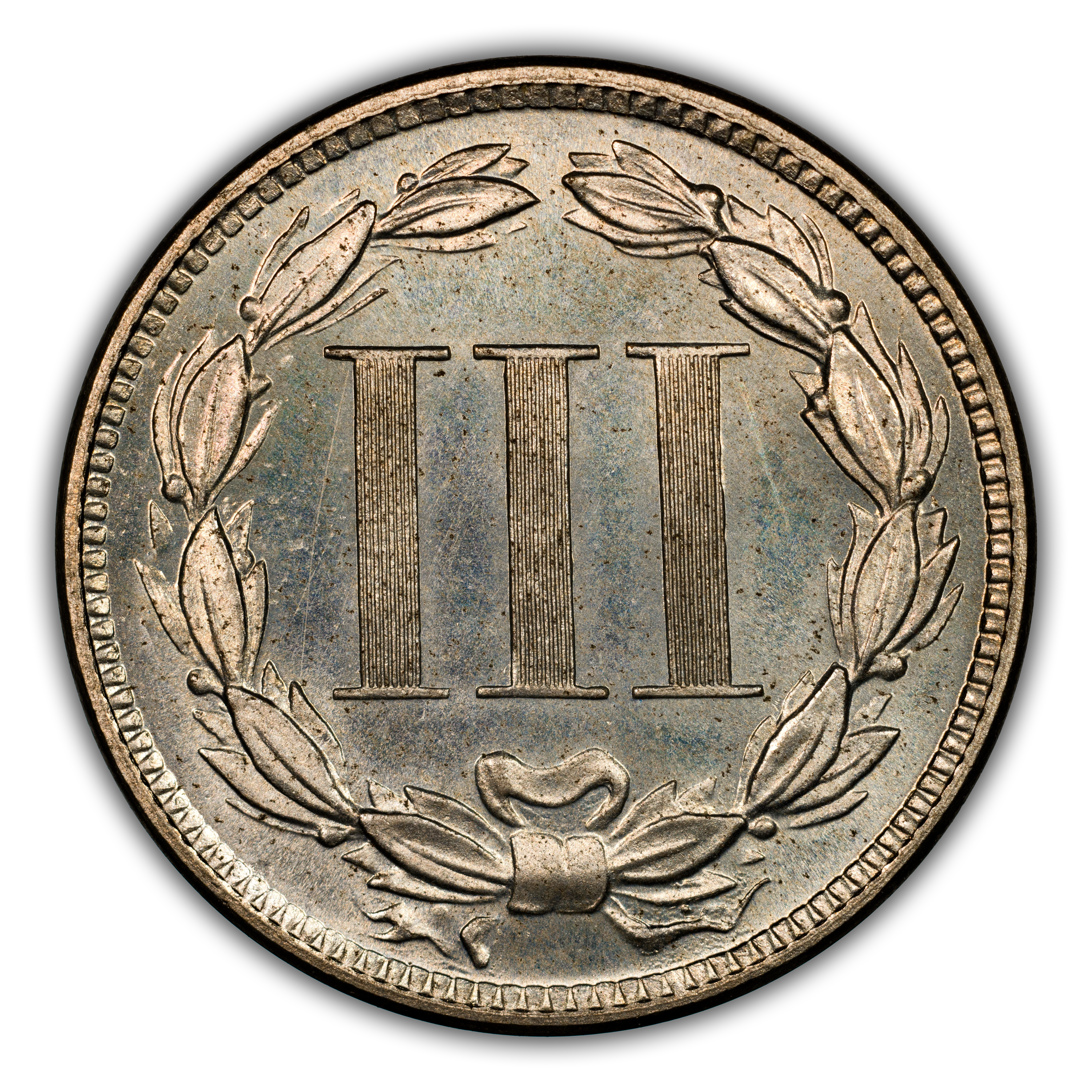 Reverse: The roman numeral III is centered in the design surrounded by a large wreath tied with a bow at the bottom. This design is one of few American coins without wording on one of the sides.