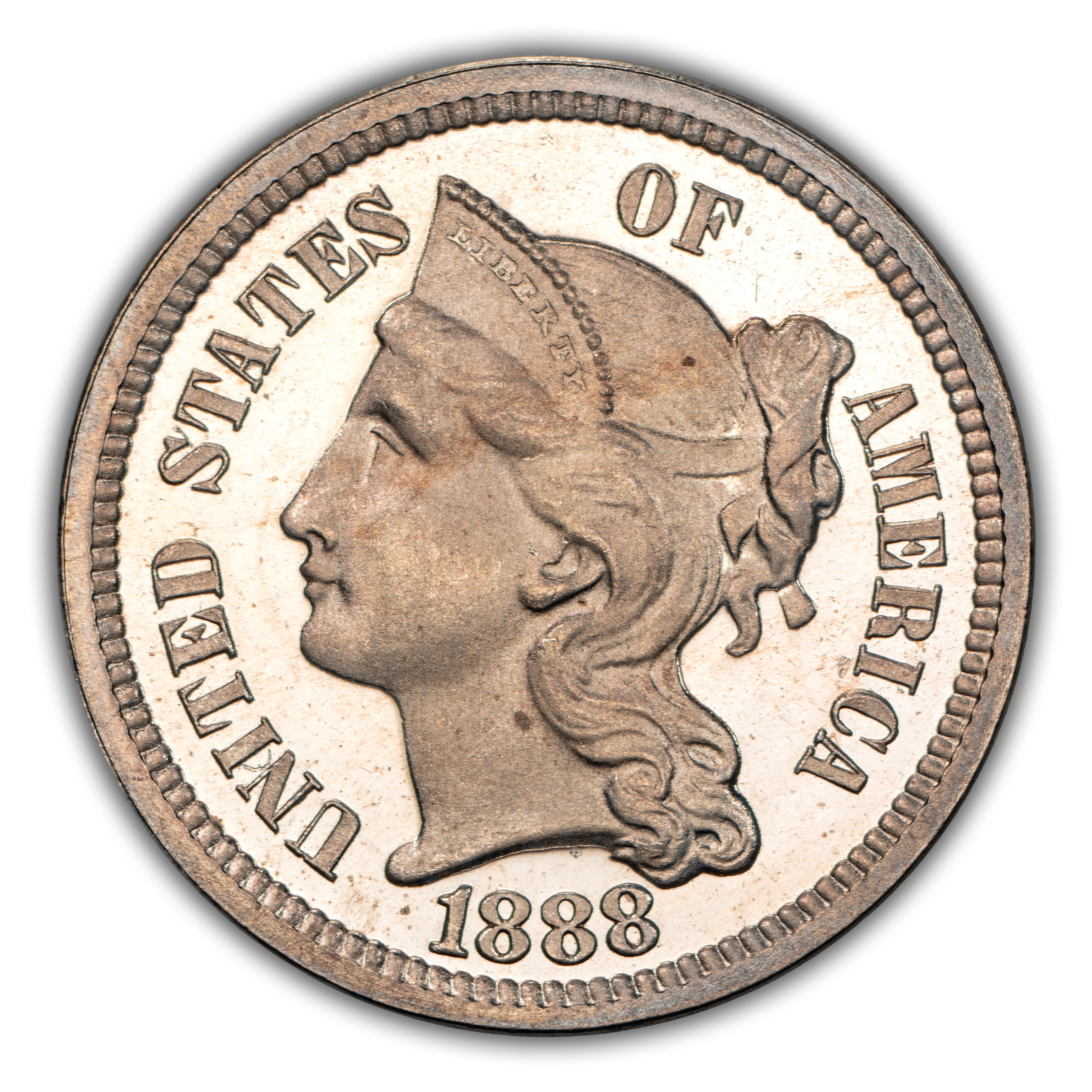 The 1888 Proof Three Cent Nickel is a fantastic type coin for its series because it is relatively affordable and has a higher mintage, at 4,582 coins. Common throughout all grades except the absolute finest gems. With effort, examples with eye catching color and notable strikes can be located. Cameos bring a minor, gradual premium with the increase in rarity and desirability coming from the deep cameos.