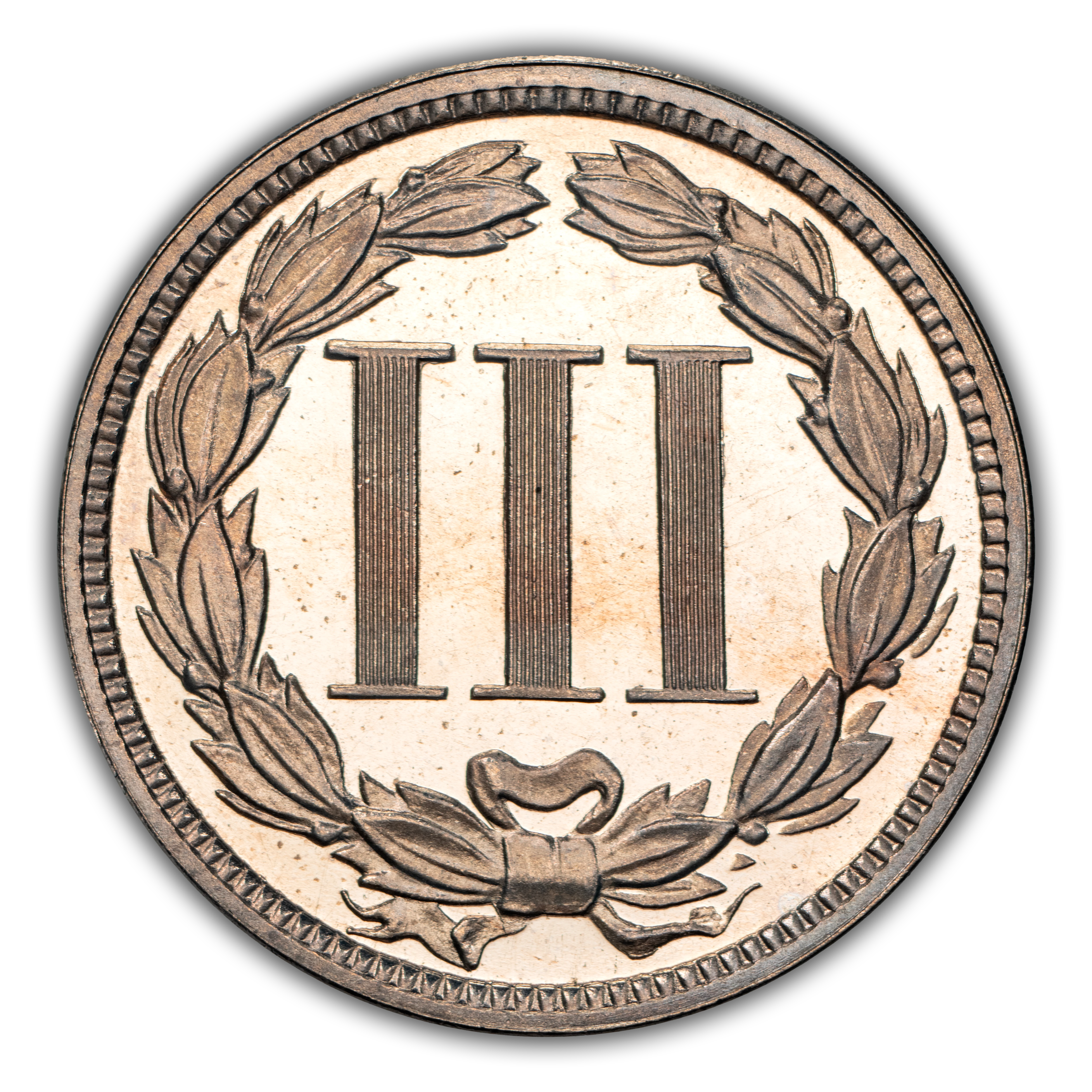 Reverse: The roman numeral III is centered in the design surrounded by a large wreath tied with a bow at the bottom. This design is one of few American coins without wording on one of the sides.