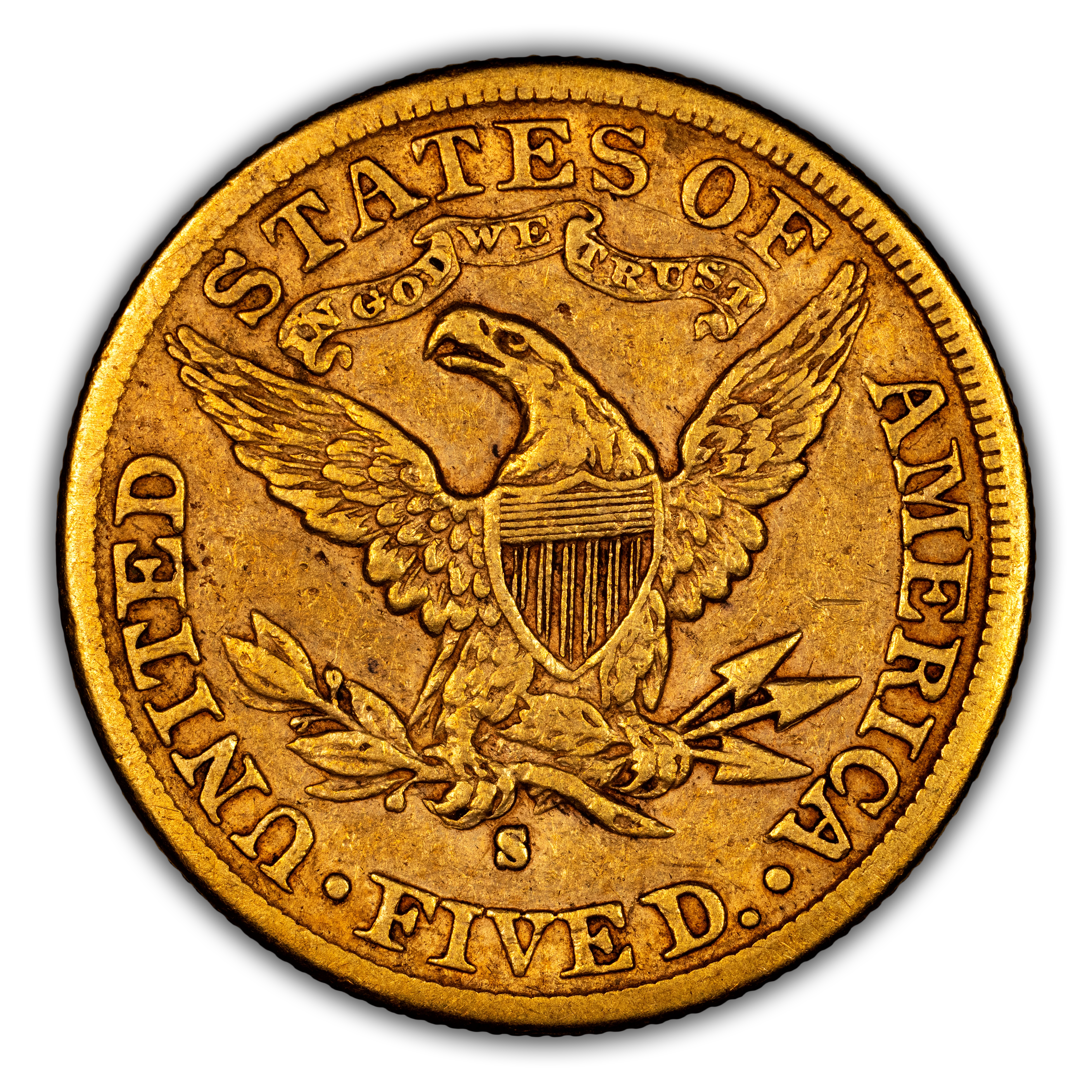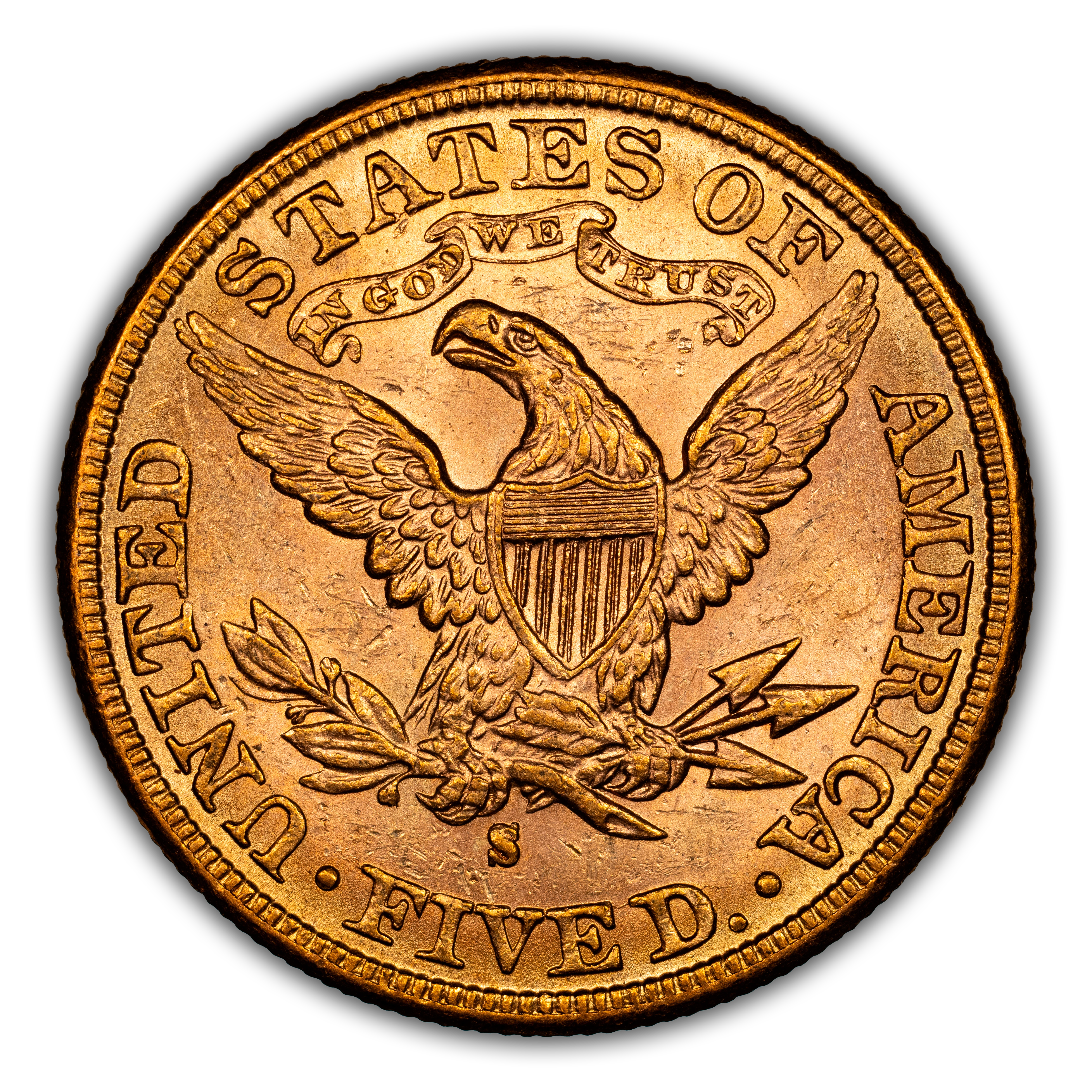 Reverse: Heraldic eagle holding arrows and branch in its claws is centered in the design with the words UNITED STATES OF AMERICA * FIVE D. around the periphery. Mintmark (if any) is located under the eagle's claws.