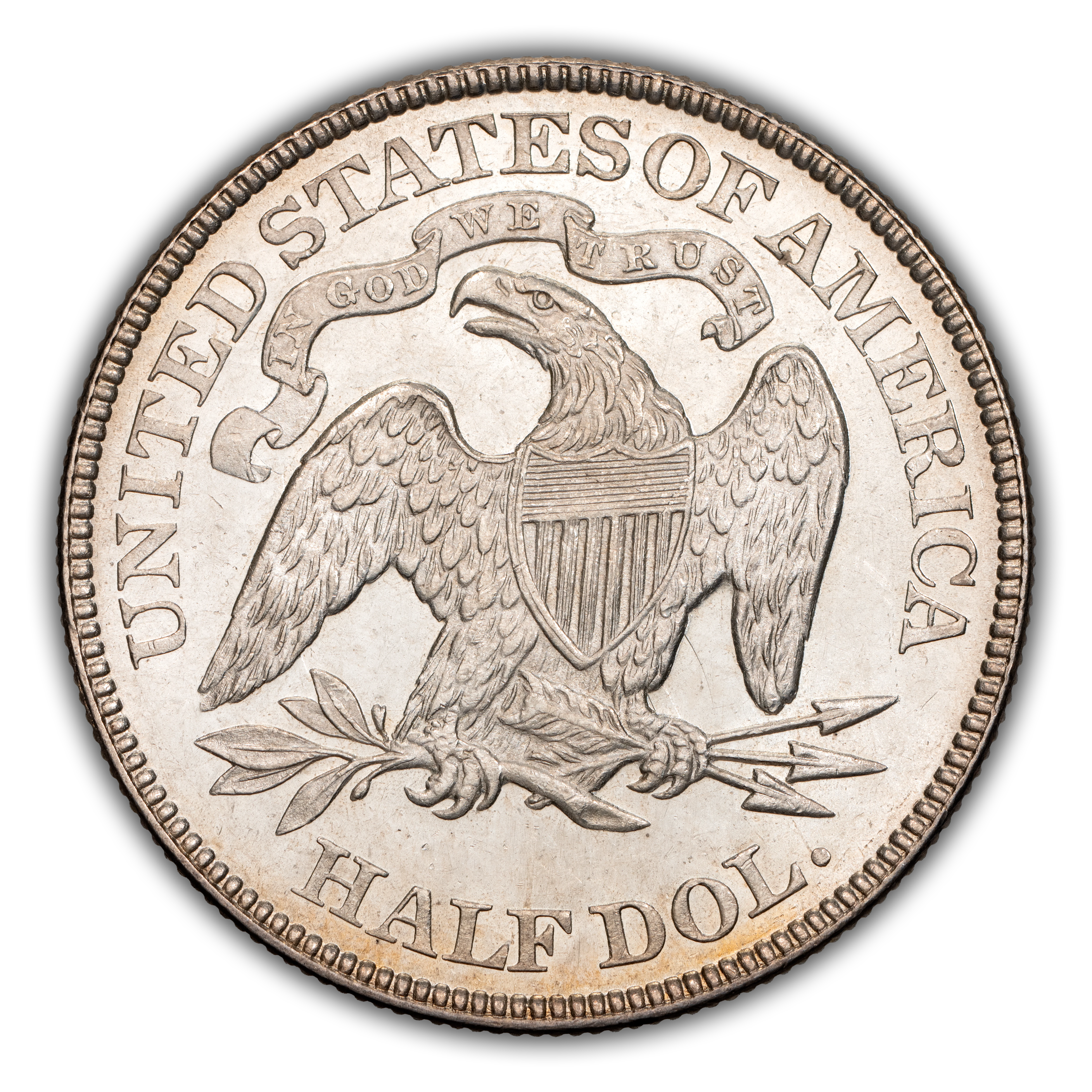 Reverse: The heraldic eagle is centered in the design with the words UNITED STATES OF AMERICA and HALF DOL. around the periphery. A ribbon above the eagle's head bears the motto IN GOD WE TRUST