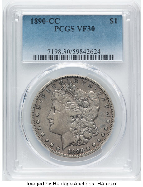 <B>1890-CC $1 AU58 PCGS.</B></I> CDN: $510 Whsle. Bid for NGC/PCGS AU58. Mintage 2,309,041. ...
