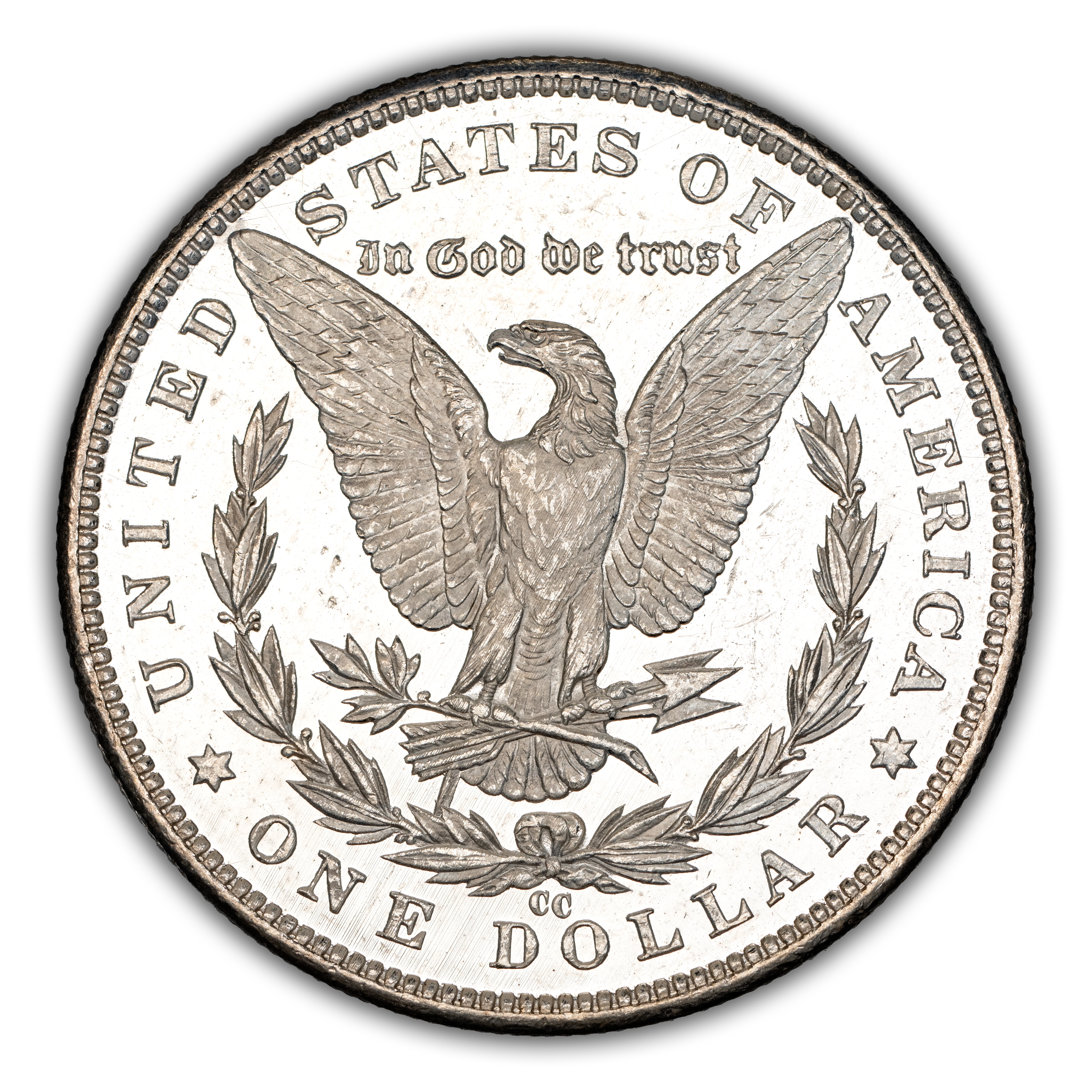 This popular variety, showing a thick, raised line connecting the eagle's leftmost (from the viewer's perspective) feather to the wreath just to the left of its bow, is extremely scarce in all grades. In MS levels, the 1890-CC Tailbar dollar is extremely scarce, becoming exceptionally rare above MS64. Only a handful of PLs and DMPLs are known and these all command strong premiums.