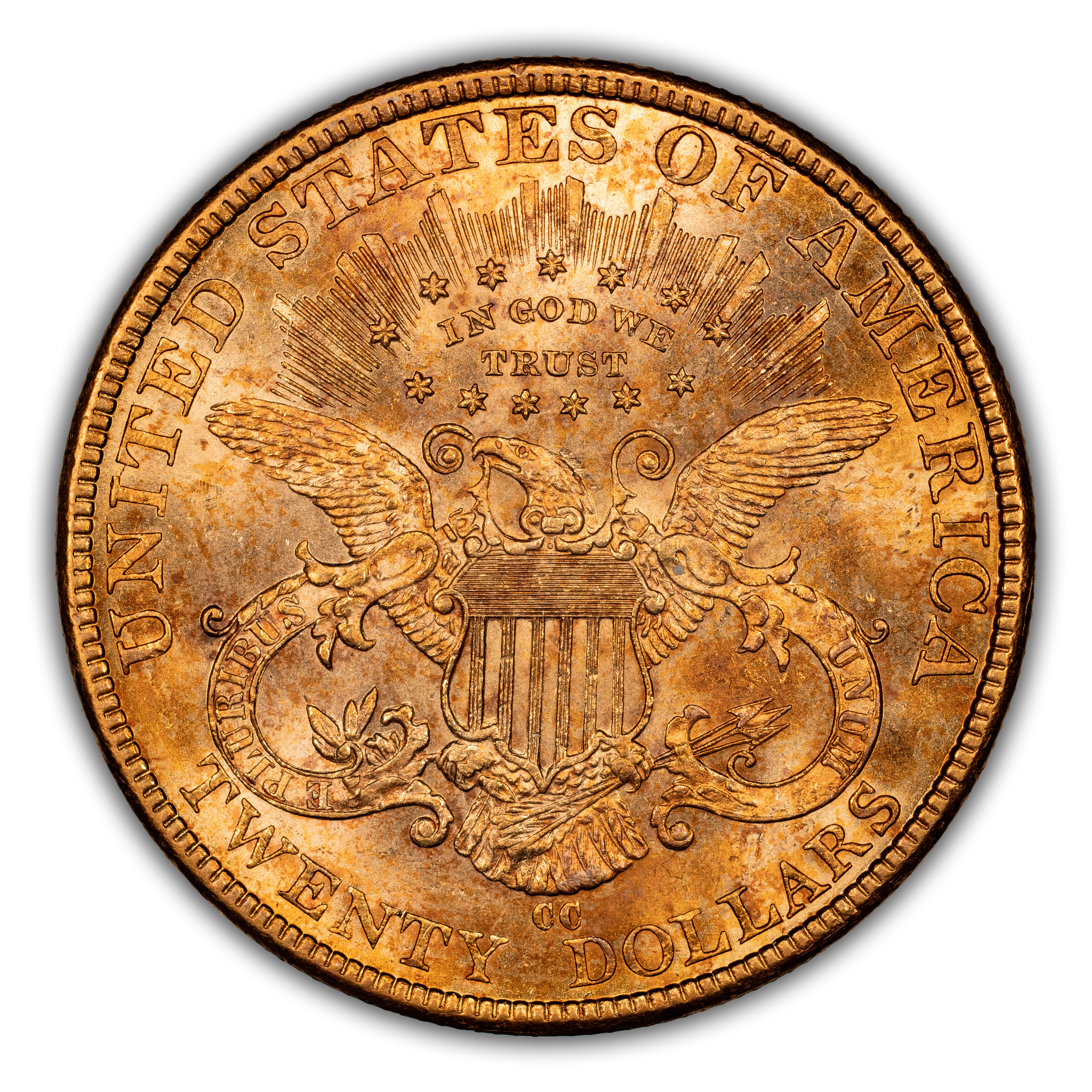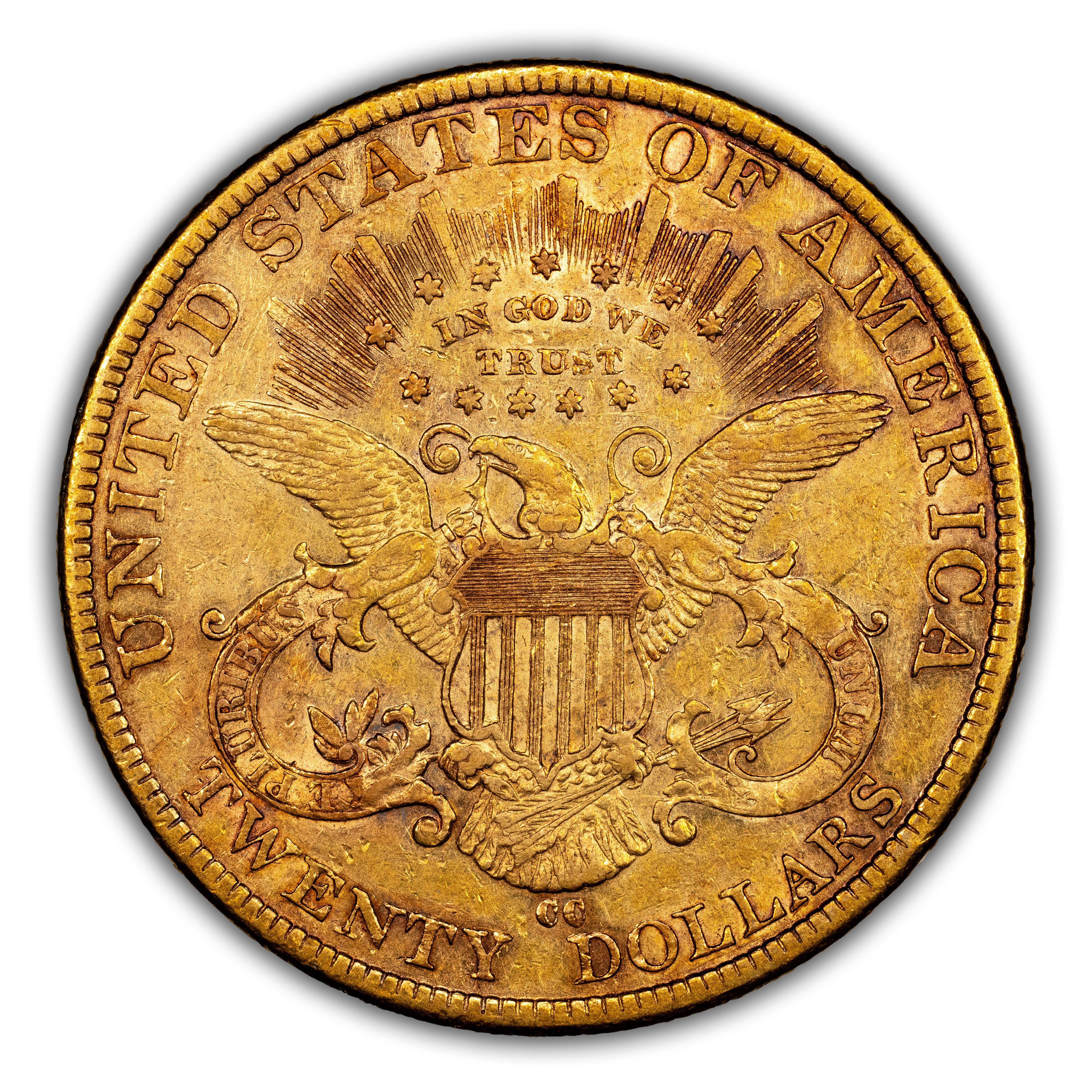 Reverse: Shielded eagle with wings outstretched holding arrows and olive branches. The words UNITED STATES OF AMERICA * TWENTY D. appear around the periphery. Mint mark, if any, appears below the eagle's tail, above the N in TWENTY.