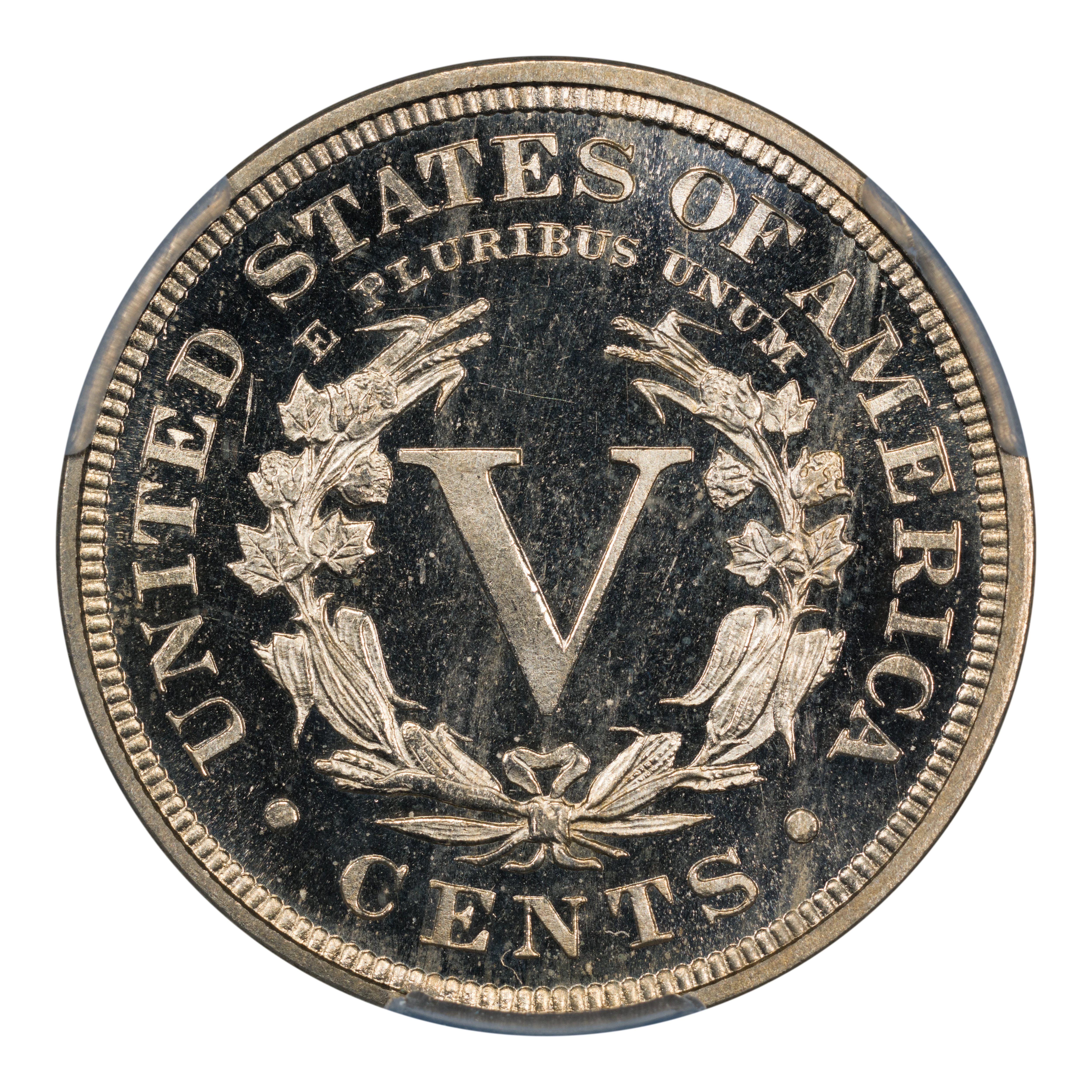 Reverse: Large V (roman numeral 5) is centered in the design surrounded by an ornate wreath with UNITED STATES OF AMERICA * CENTS * around the periphery. The motto E PLURIBUS UNUM appears near the top between the wreath and letters STATES OF AME.