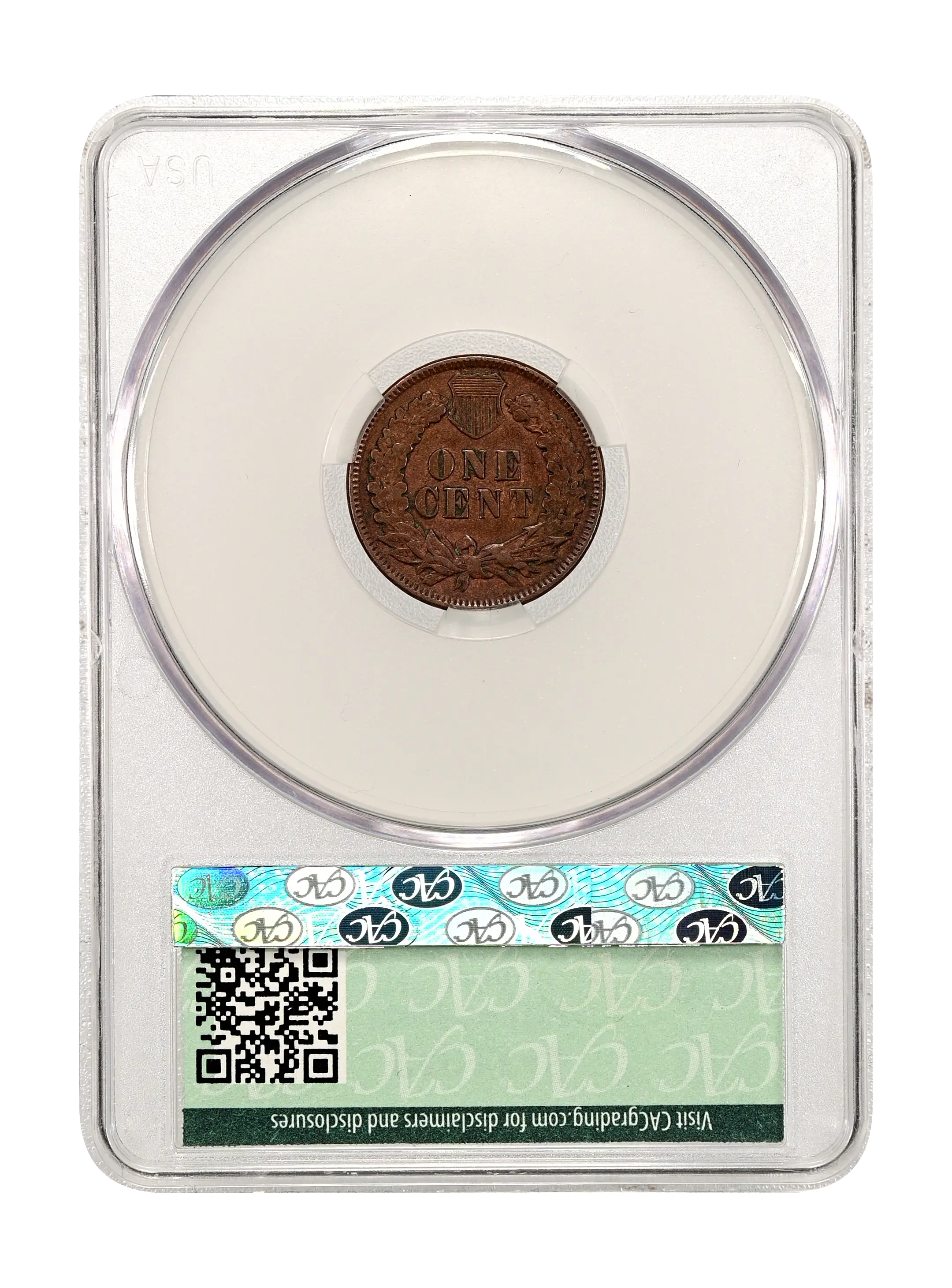 Reverse: The reverse bears the denomination of ONE CENT in the center surrounded by a wreath bearing a ribbon with arrows tied in at the bottom center.