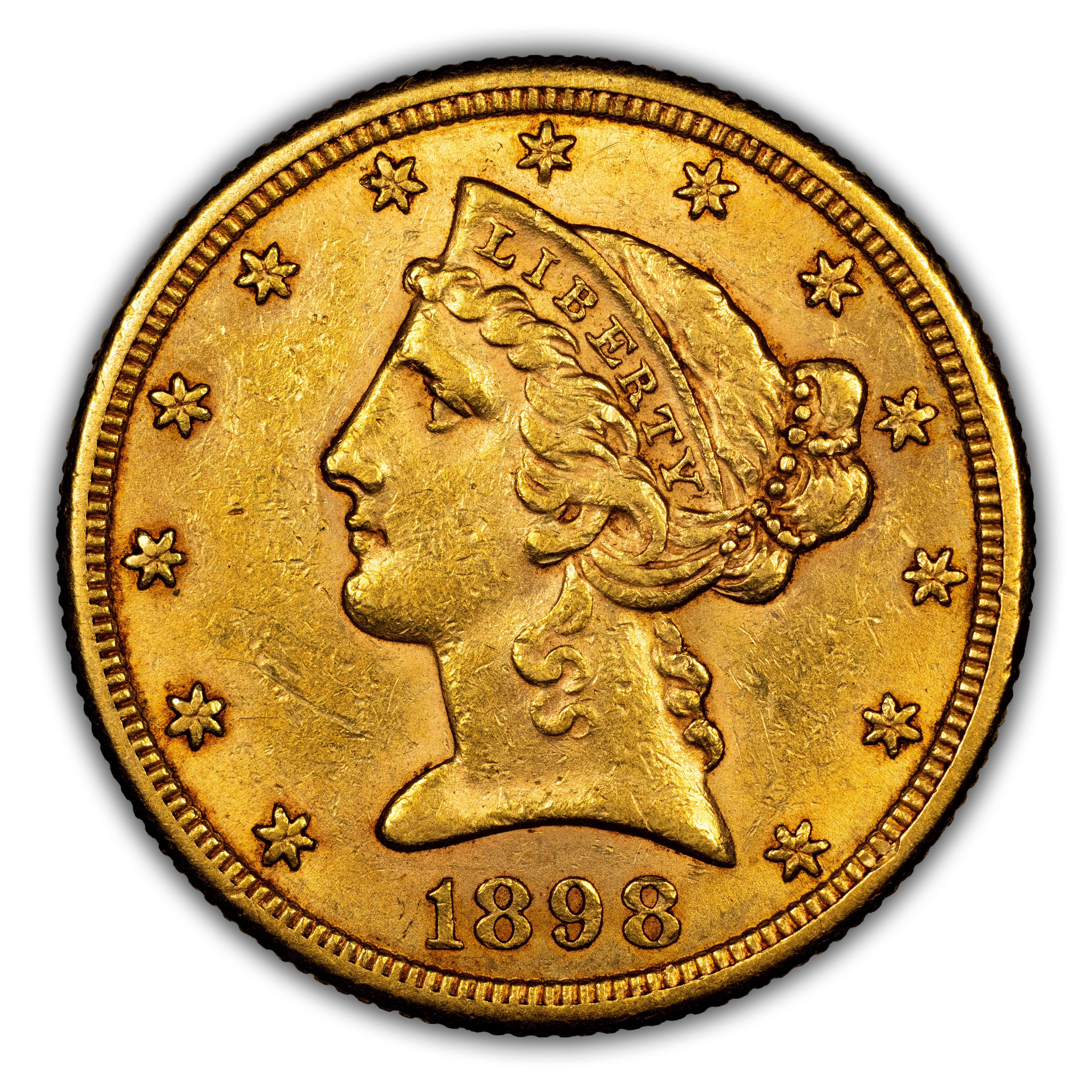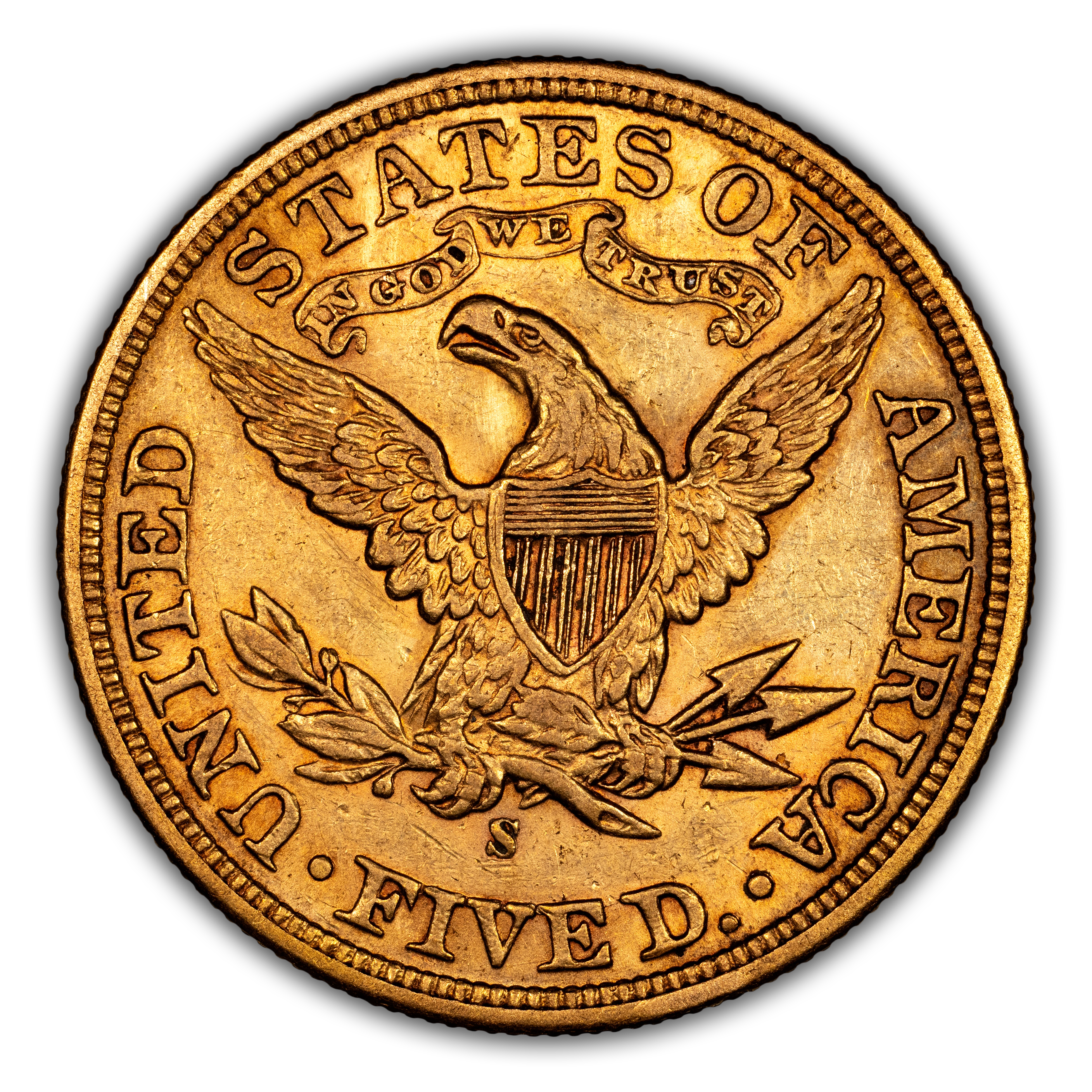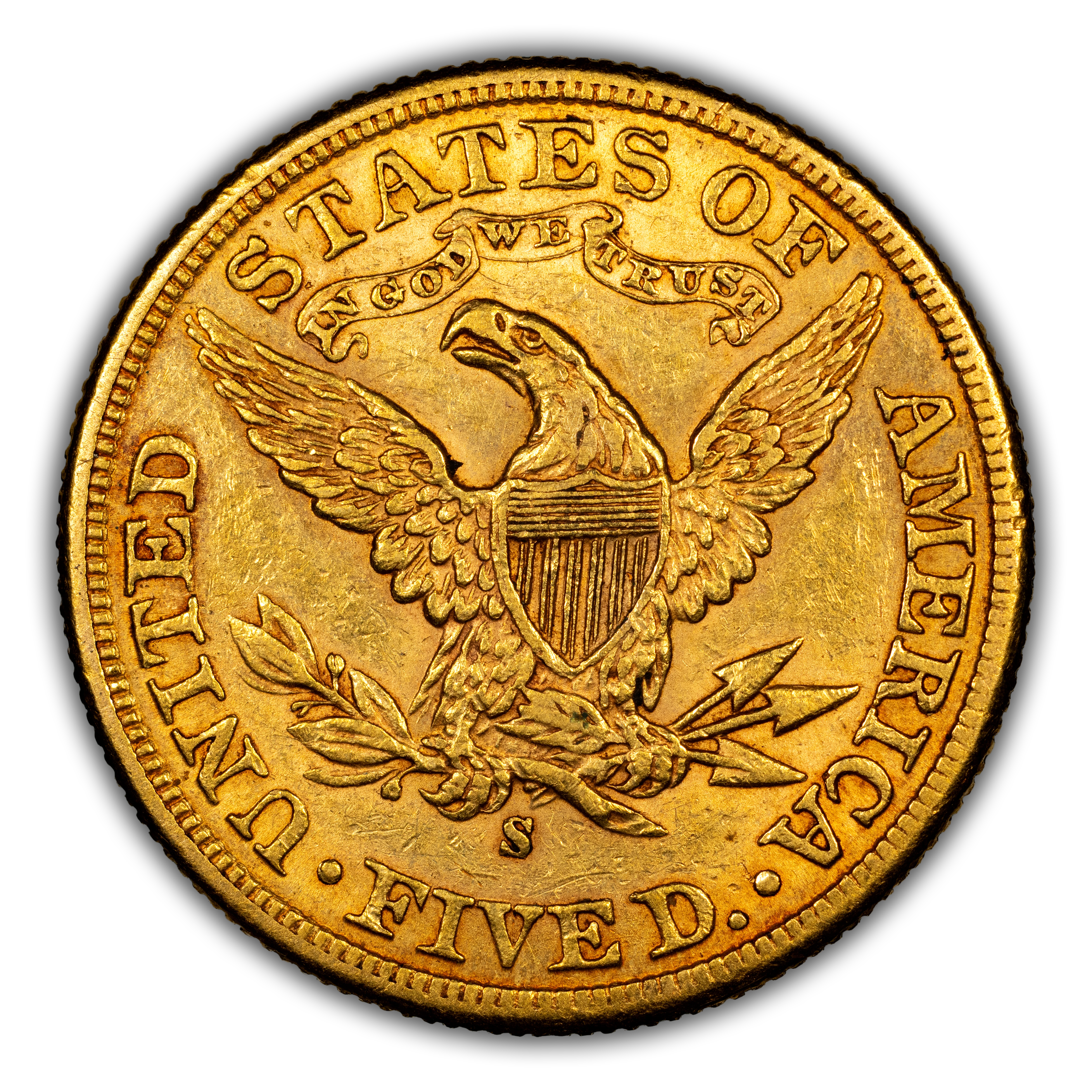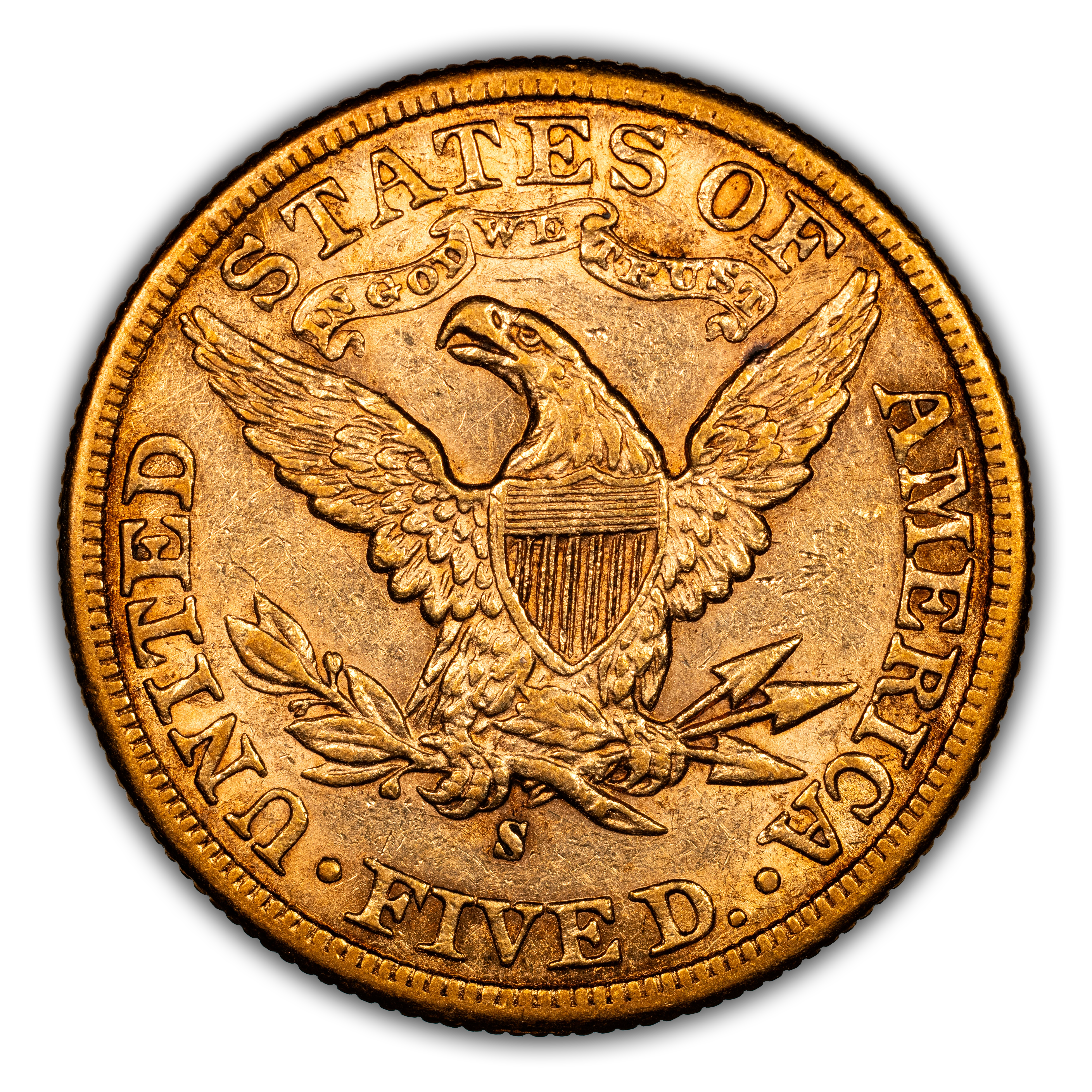 Reverse: Heraldic eagle holding arrows and branch in its claws is centered in the design with the words UNITED STATES OF AMERICA * FIVE D. around the periphery. Mintmark (if any) is located under the eagle's claws.