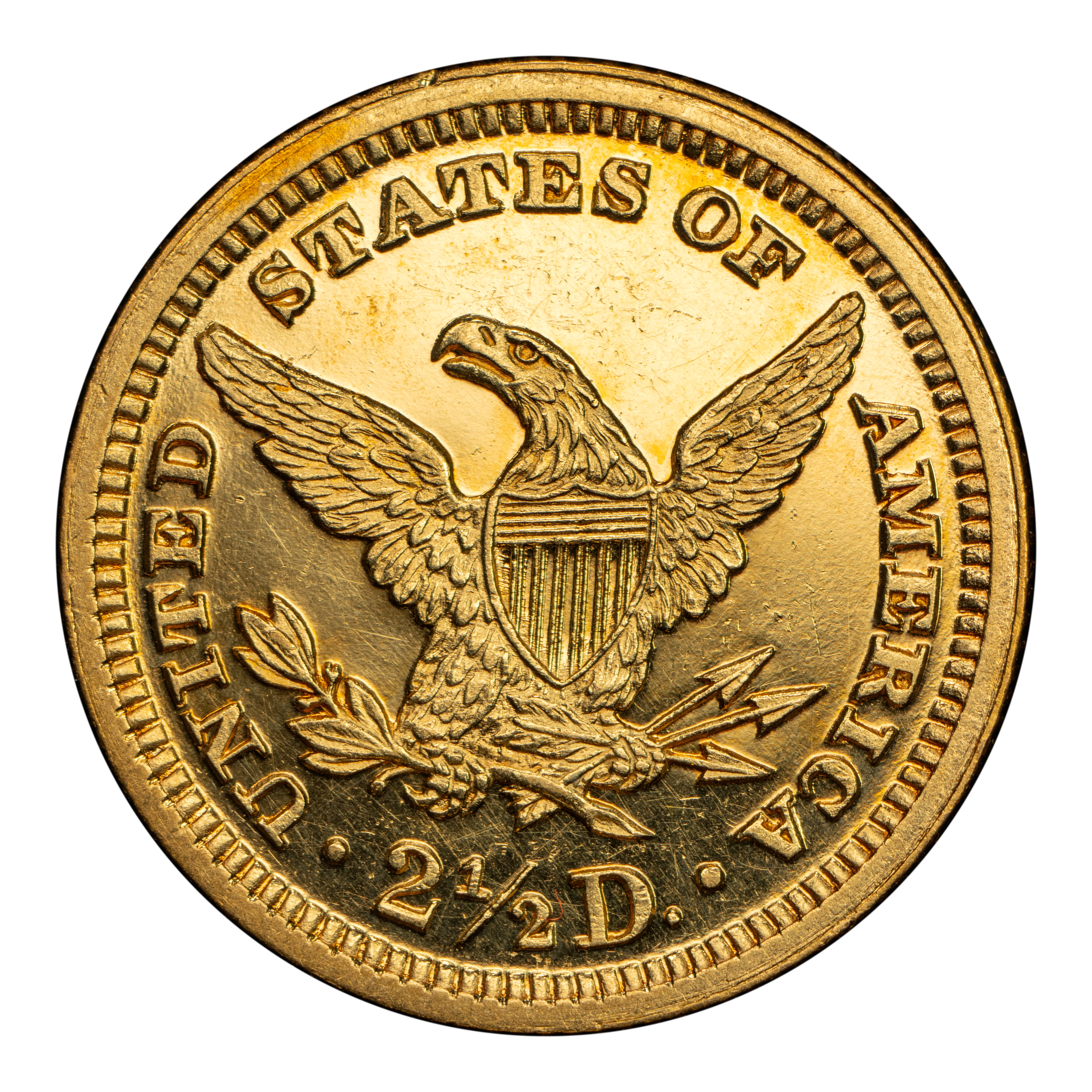 Reverse: Heraldic eagle holding arrows and branch in its claws is centered in the design with the words UNITED STATES OF AMERICA * @ 2 1/2 D. around the periphery. Mintmark (if any) is located under the eagle's claws.