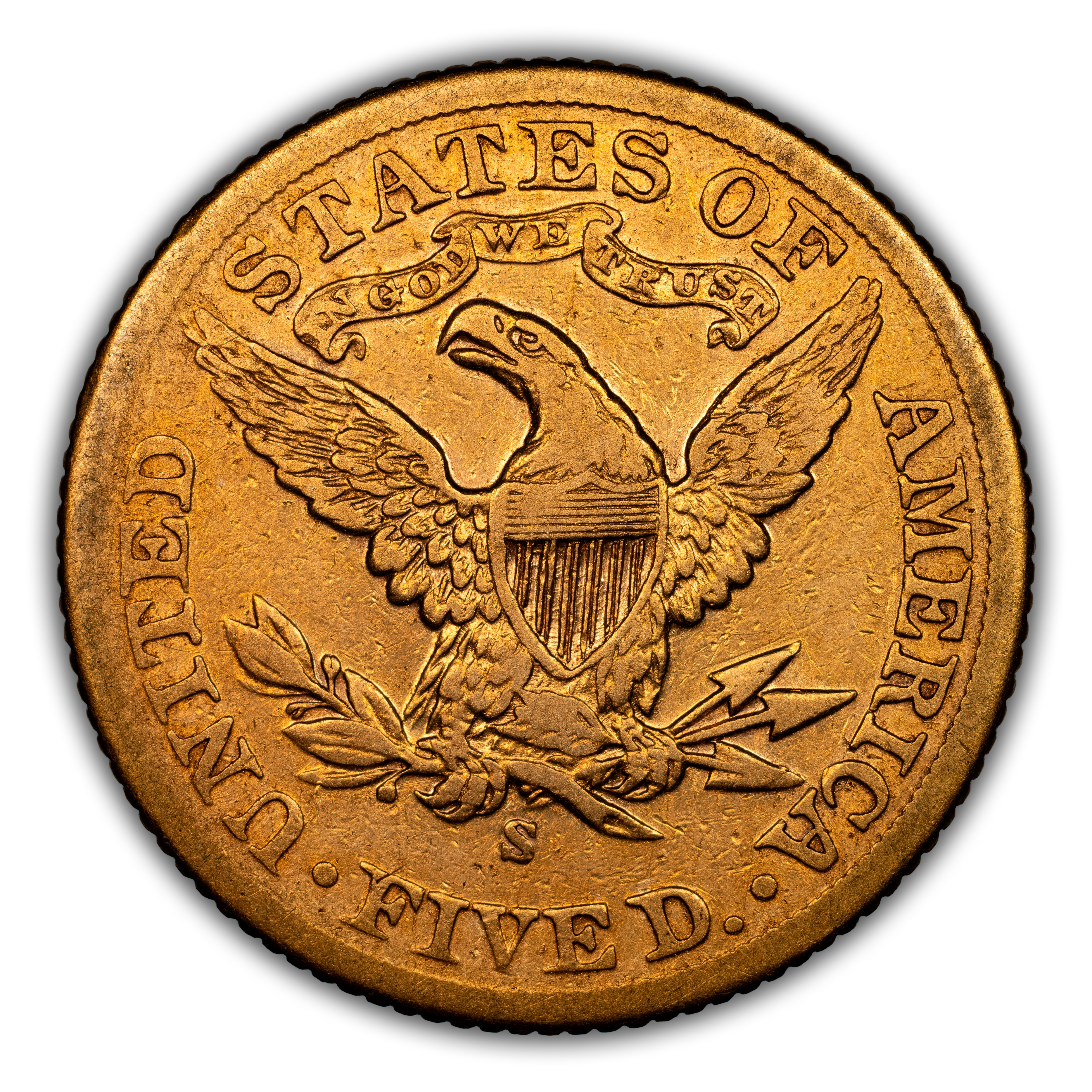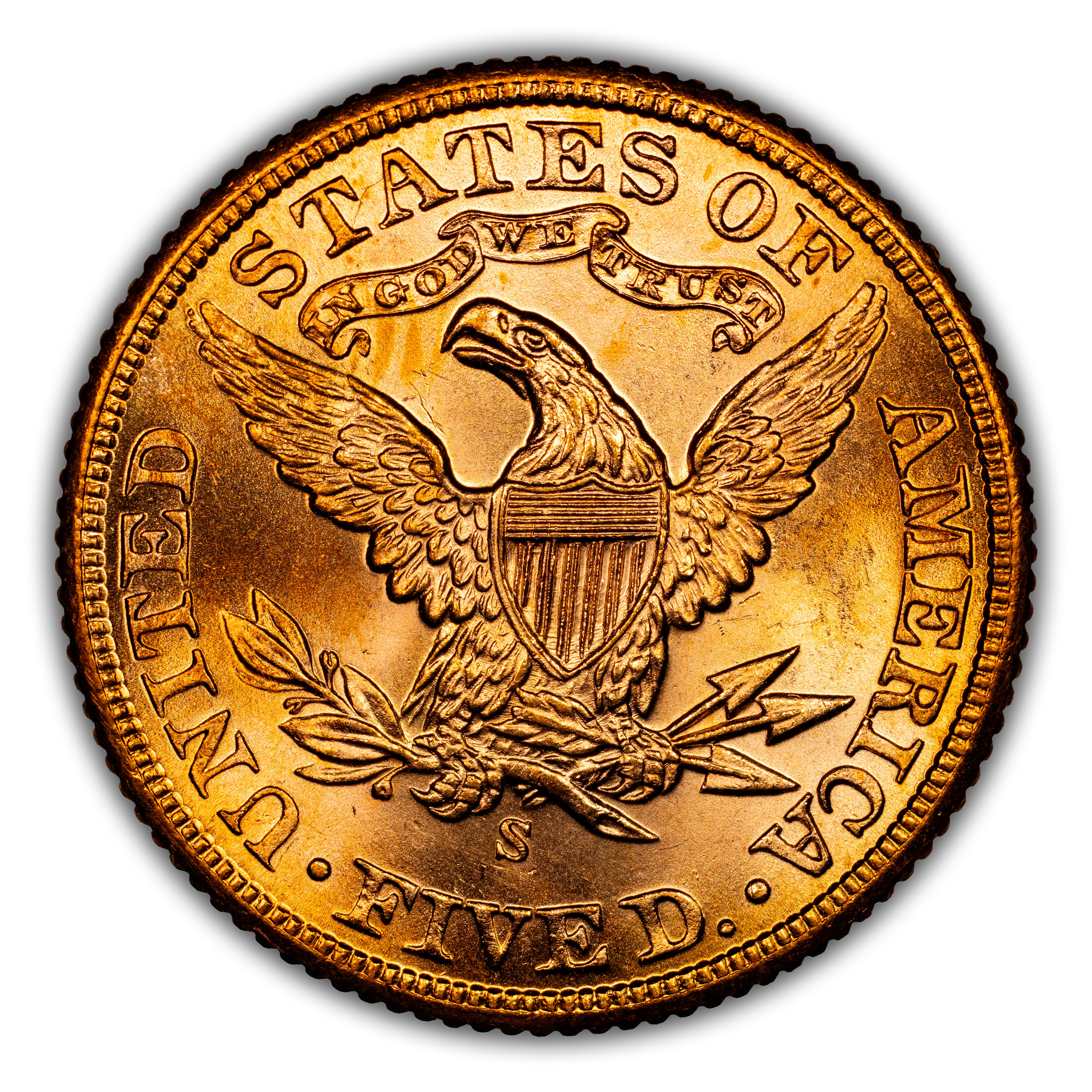 Reverse: Heraldic eagle holding arrows and branch in its claws is centered in the design with the words UNITED STATES OF AMERICA * FIVE D. around the periphery. Mintmark (if any) is located under the eagle's claws.