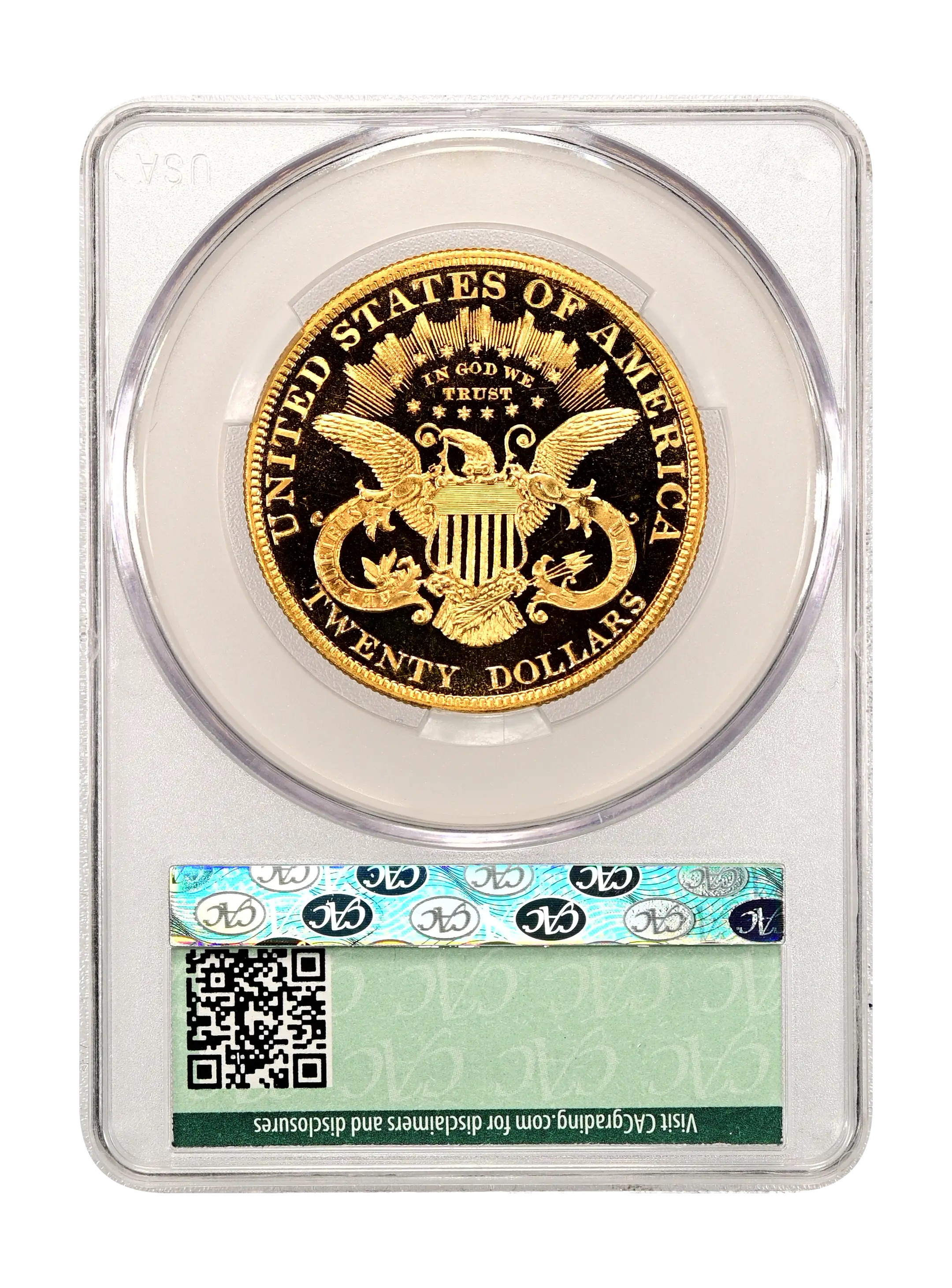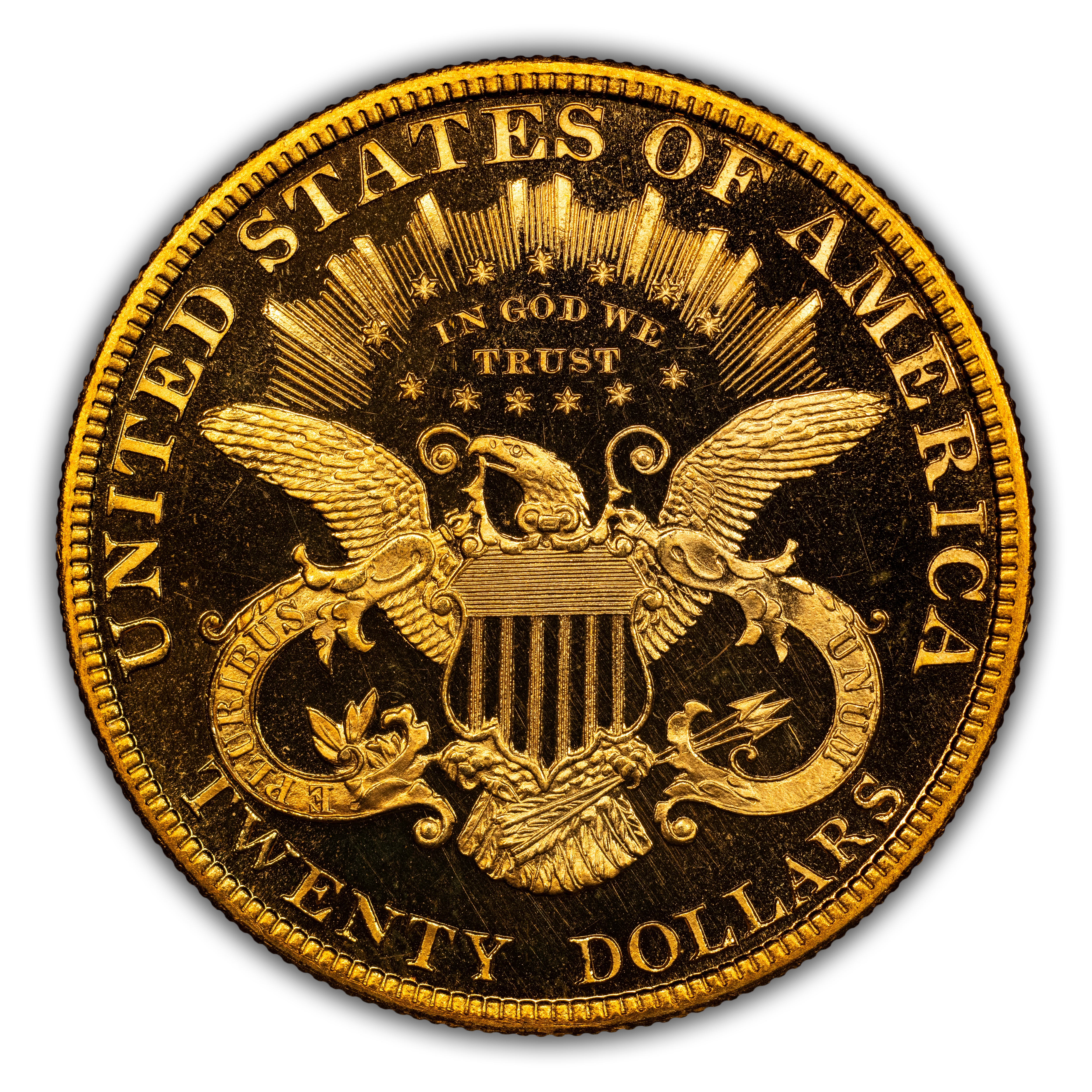 Reverse: Shielded eagle with wings outstretched holding arrows and olive branches. The words UNITED STATES OF AMERICA * TWENTY D. appear around the periphery. Mint mark, if any, appears below the eagle's tail, above the N in TWENTY.