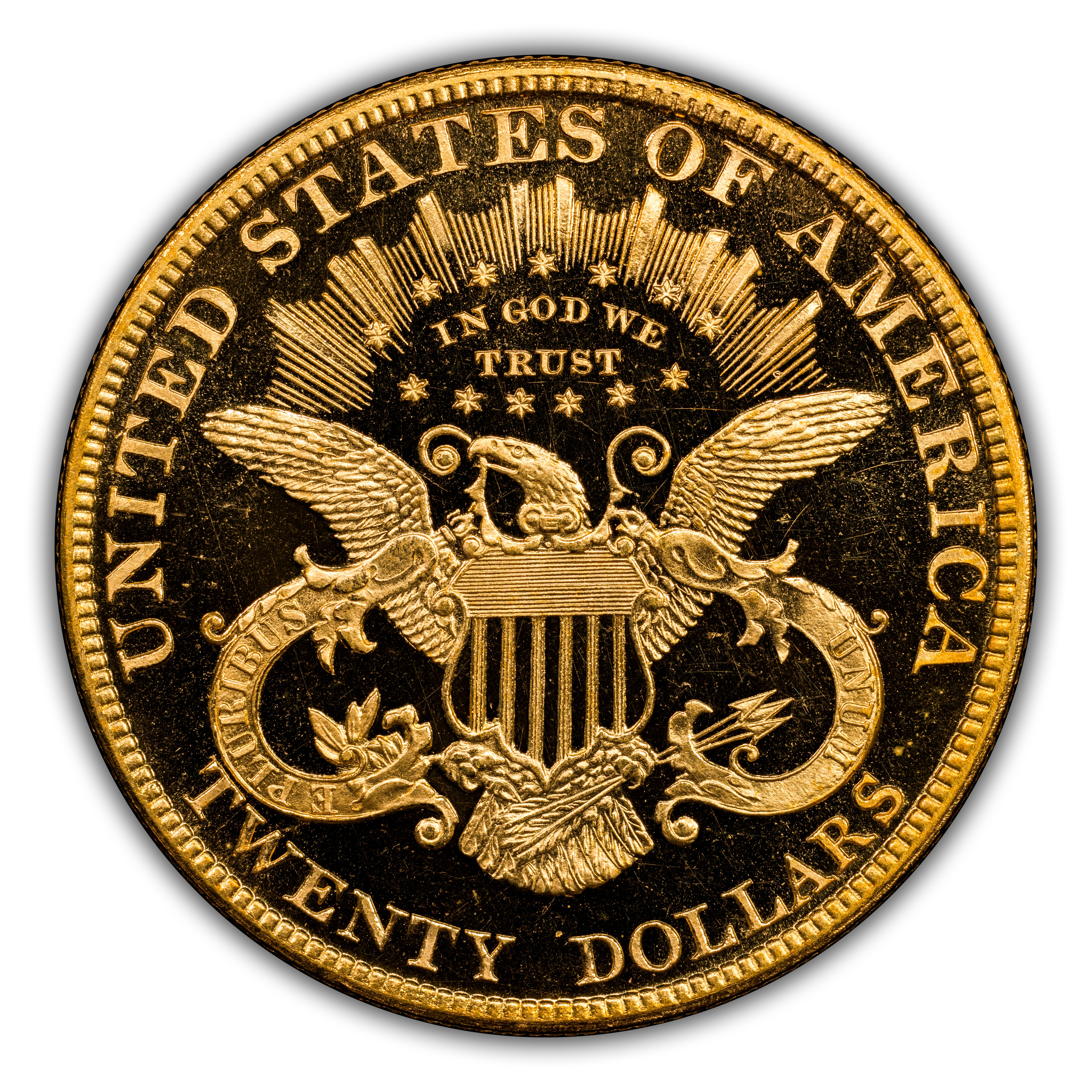 Reverse: Shielded eagle with wings outstretched holding arrows and olive branches. The words UNITED STATES OF AMERICA * TWENTY D. appear around the periphery. Mint mark, if any, appears below the eagle's tail, above the N in TWENTY.