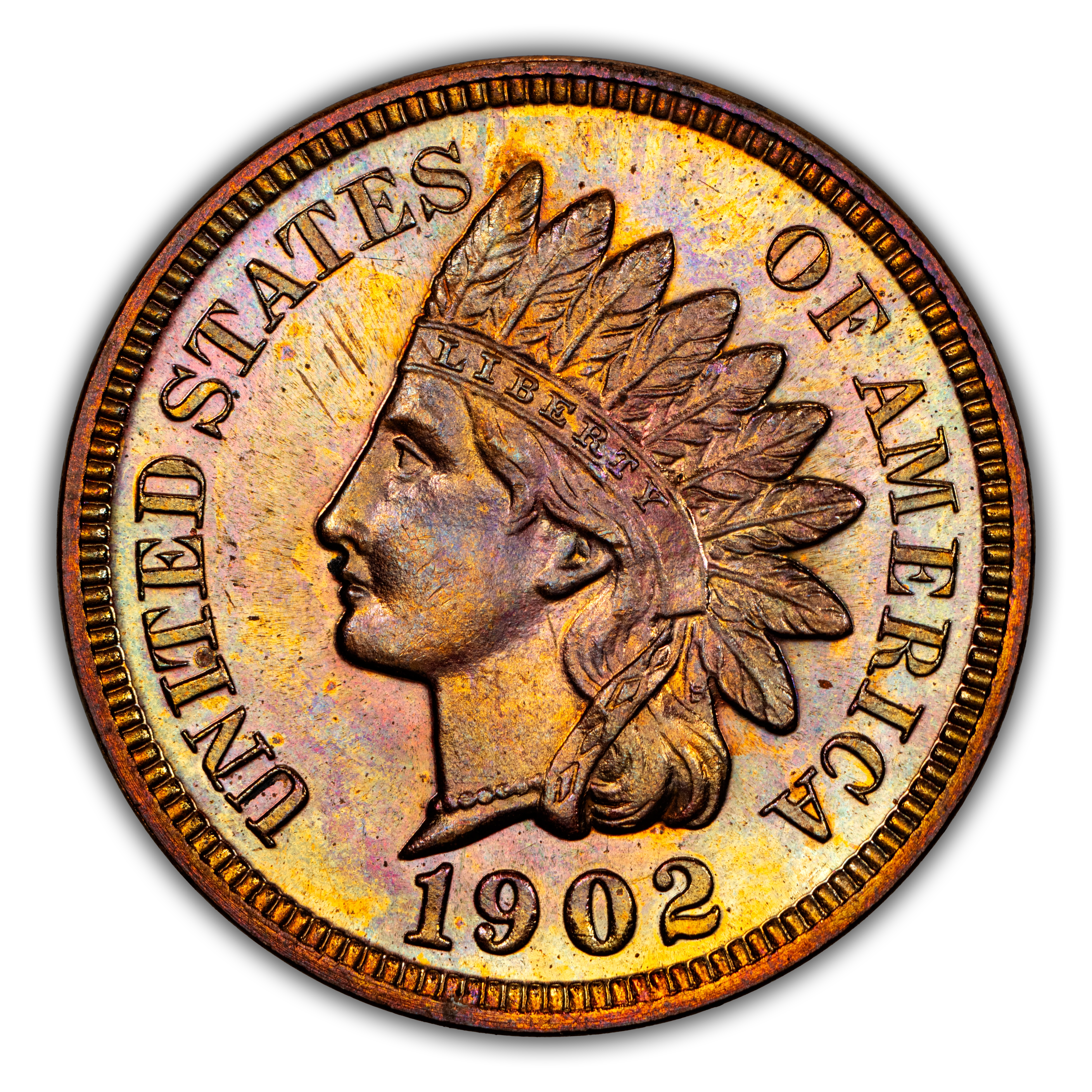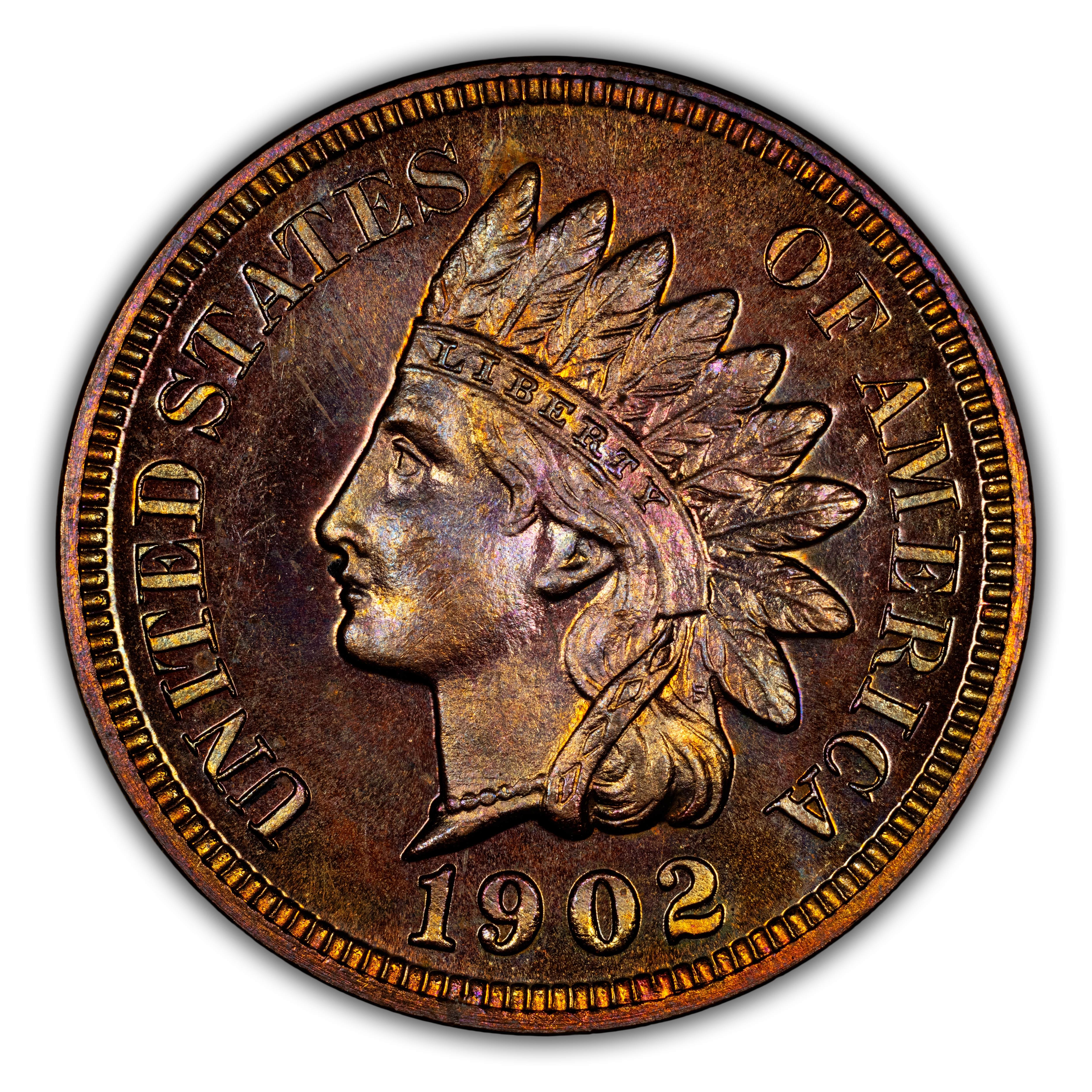 The mintage for the 1902 Indian Cent is 2,018. Brown pieces are common along with red-brown; only the finest gems are scarce. Full red gems are scarce as well with the finest ones being very rare. Any grade with a cameo is at the very least, scarce with high Mint State grades being rare. Seek out attractively toned brown pieces or blazing red surfaces as those are the most coveted and are not very difficult to locate.
