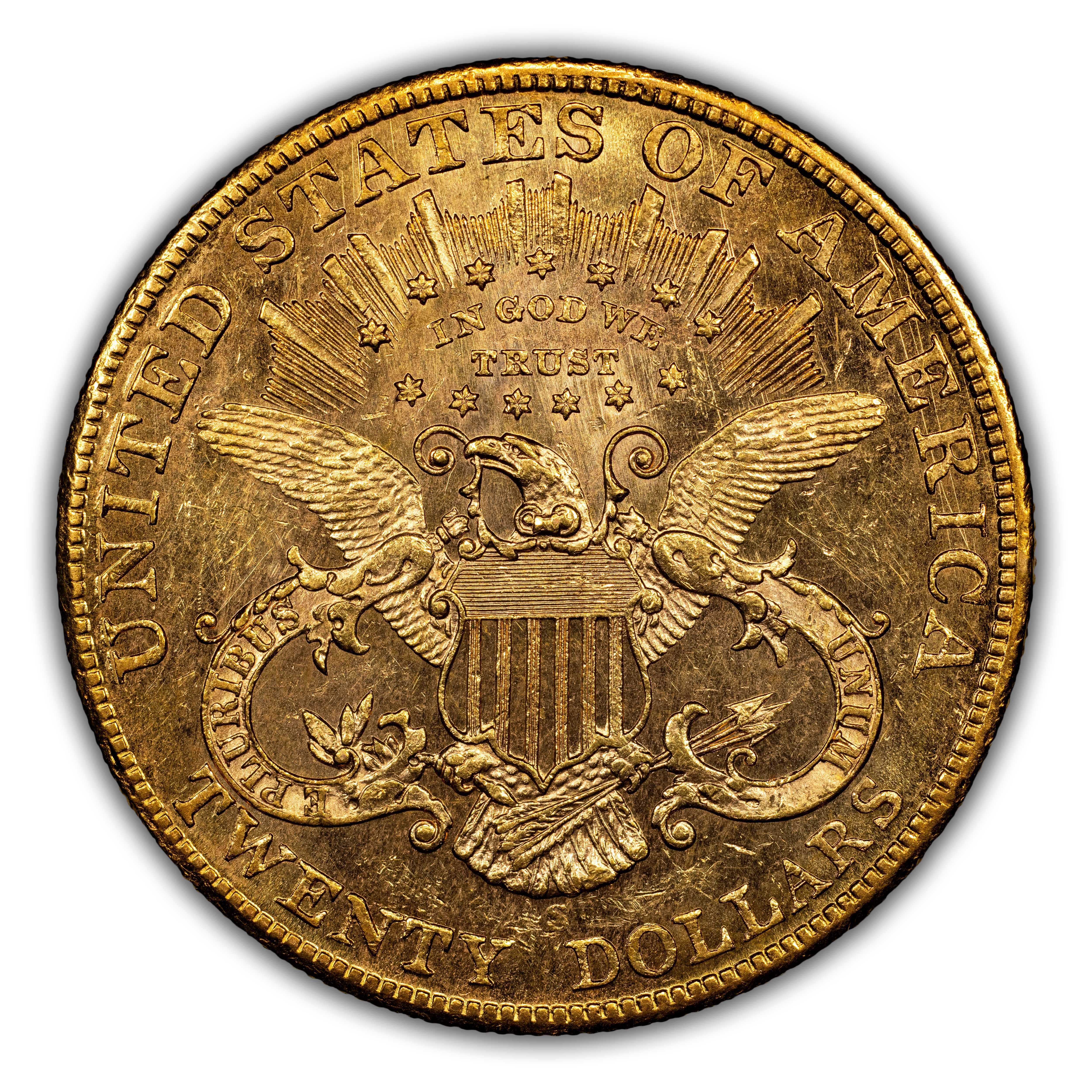 Reverse: Shielded eagle with wings outstretched holding arrows and olive branches. The words UNITED STATES OF AMERICA * TWENTY D. appear around the periphery. Mint mark, if any, appears below the eagle's tail, above the N in TWENTY.