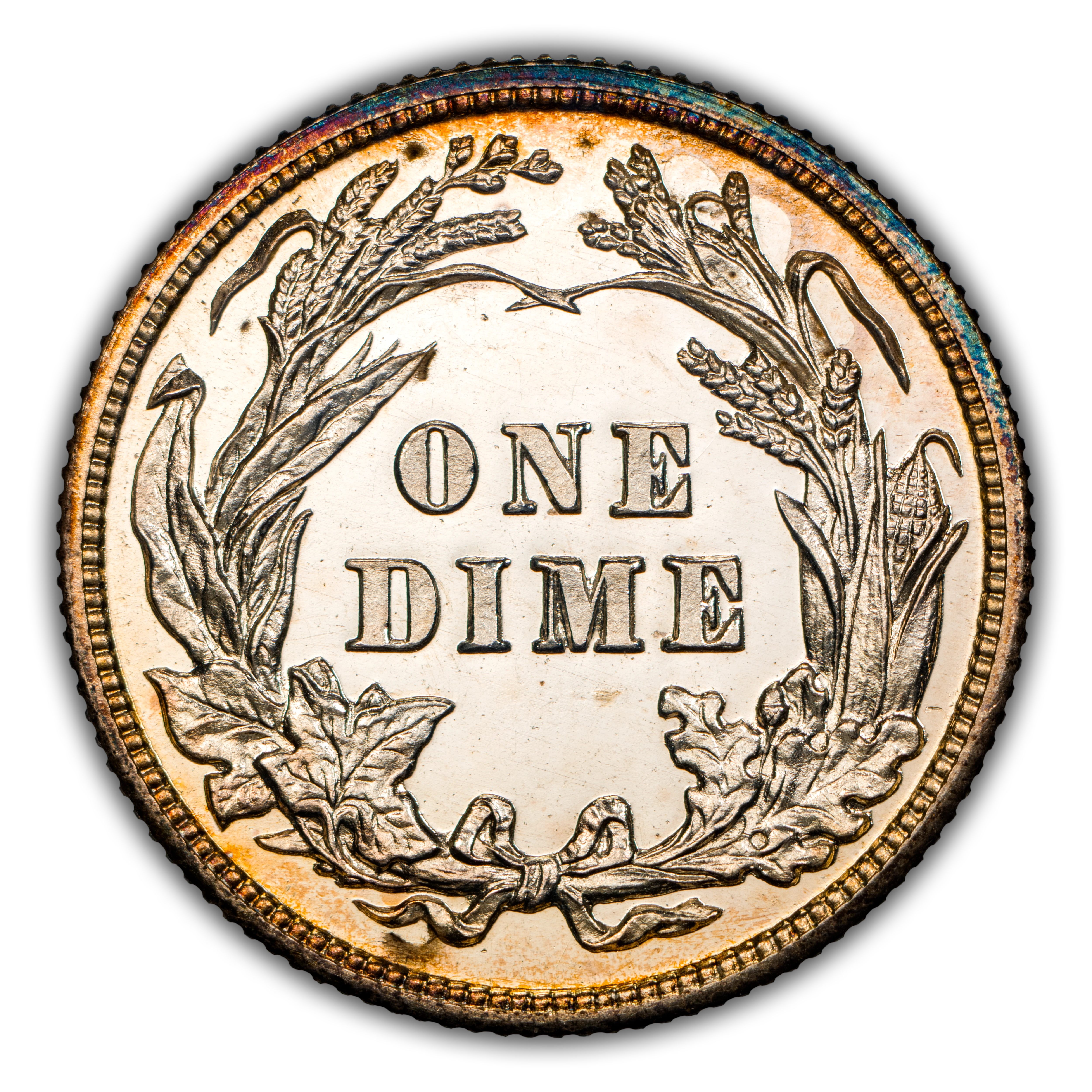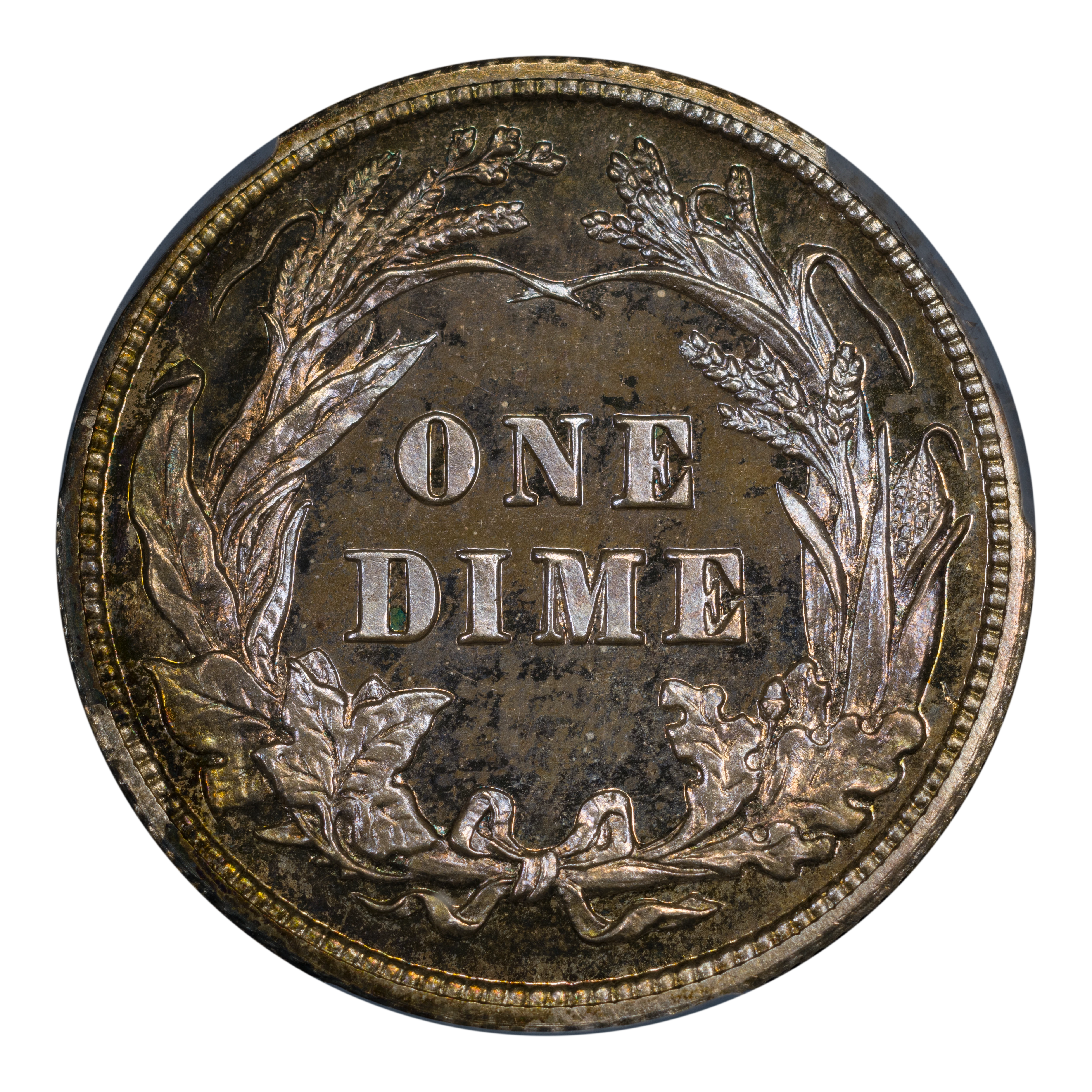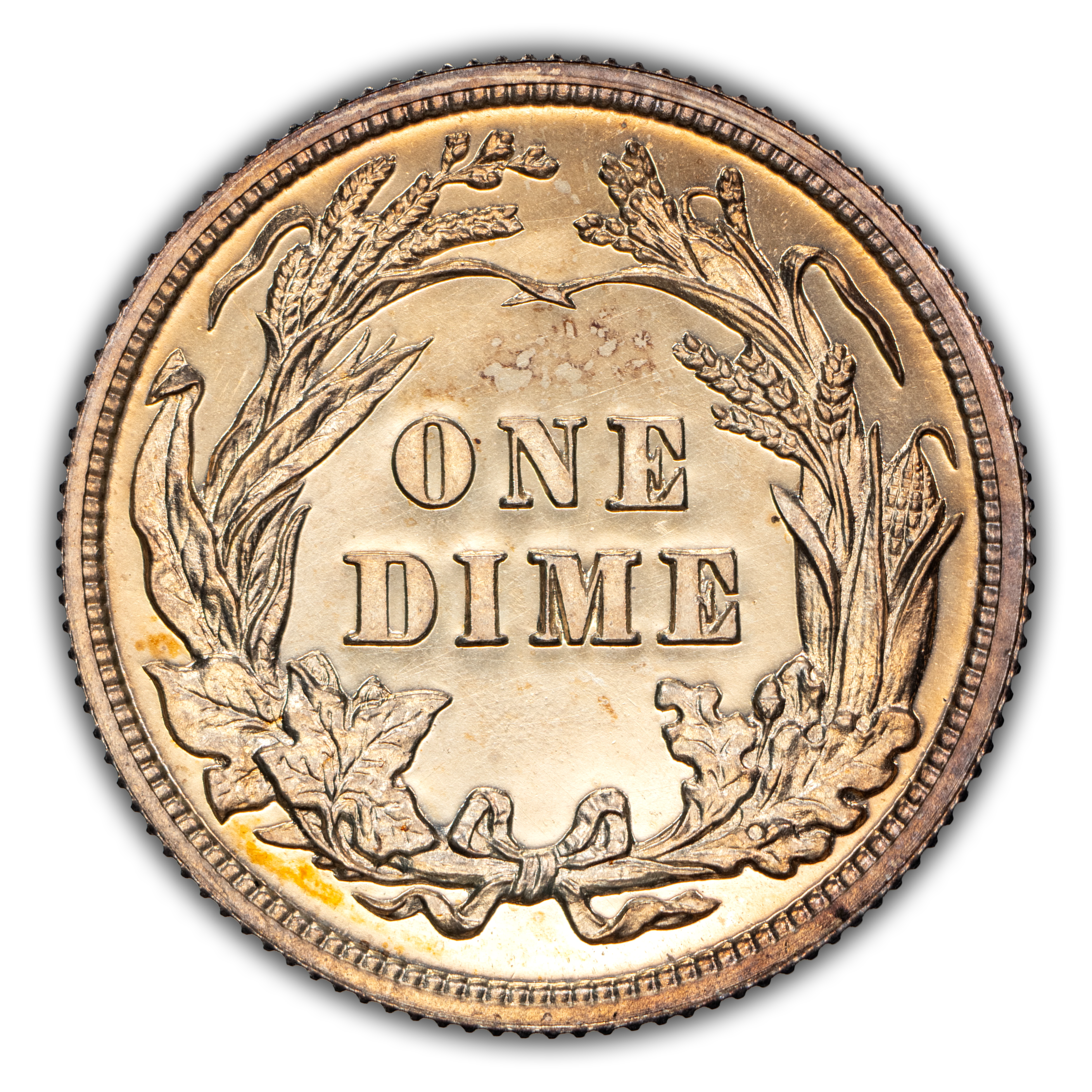 Reverse: ONE DIME is centered in the middle of the reverse surrounded by a wreath tied by a bow at the bottom.