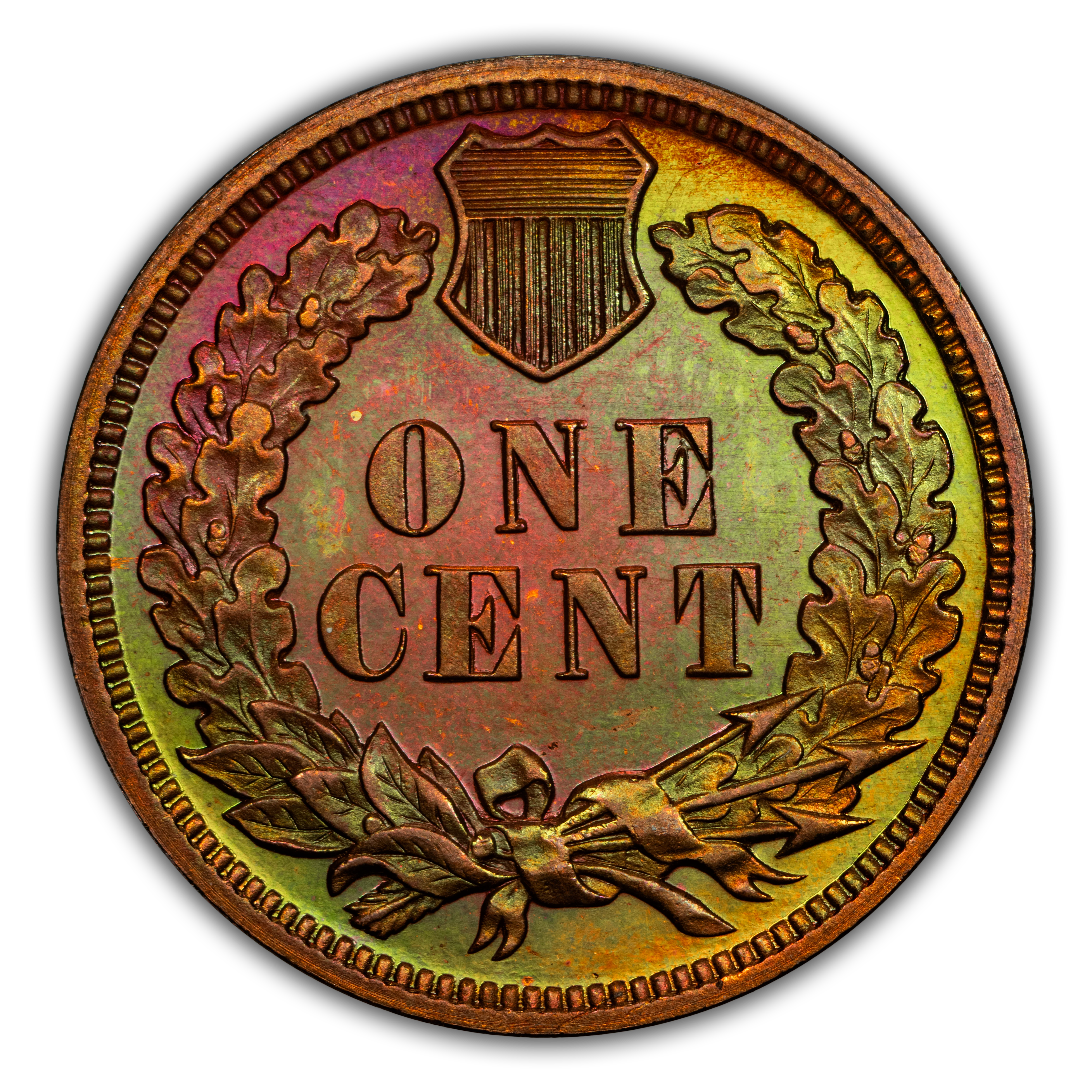 Reverse: The reverse bears the denomination of ONE CENT in the center surrounded by a wreath bearing a ribbon with arrows tied in at the bottom center.