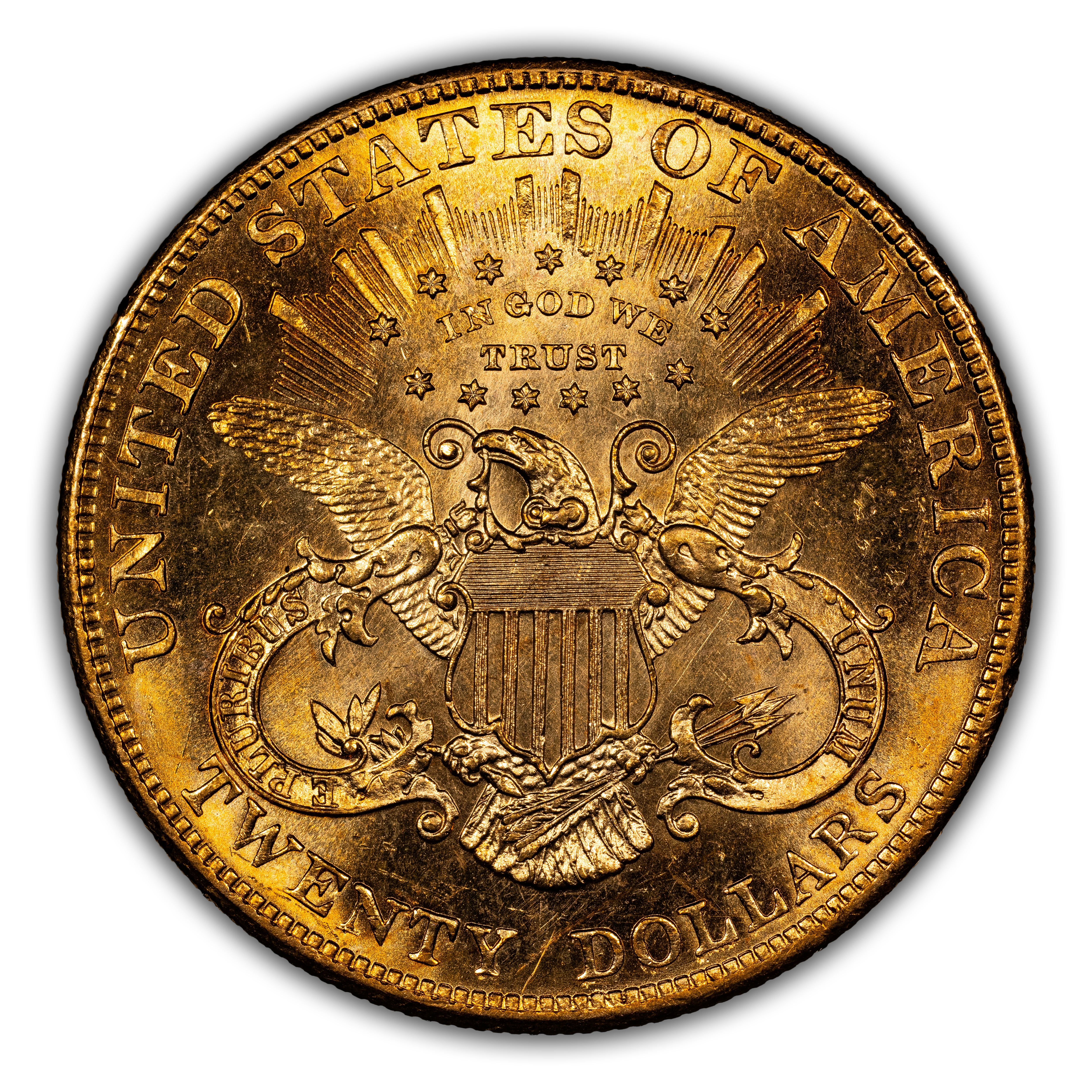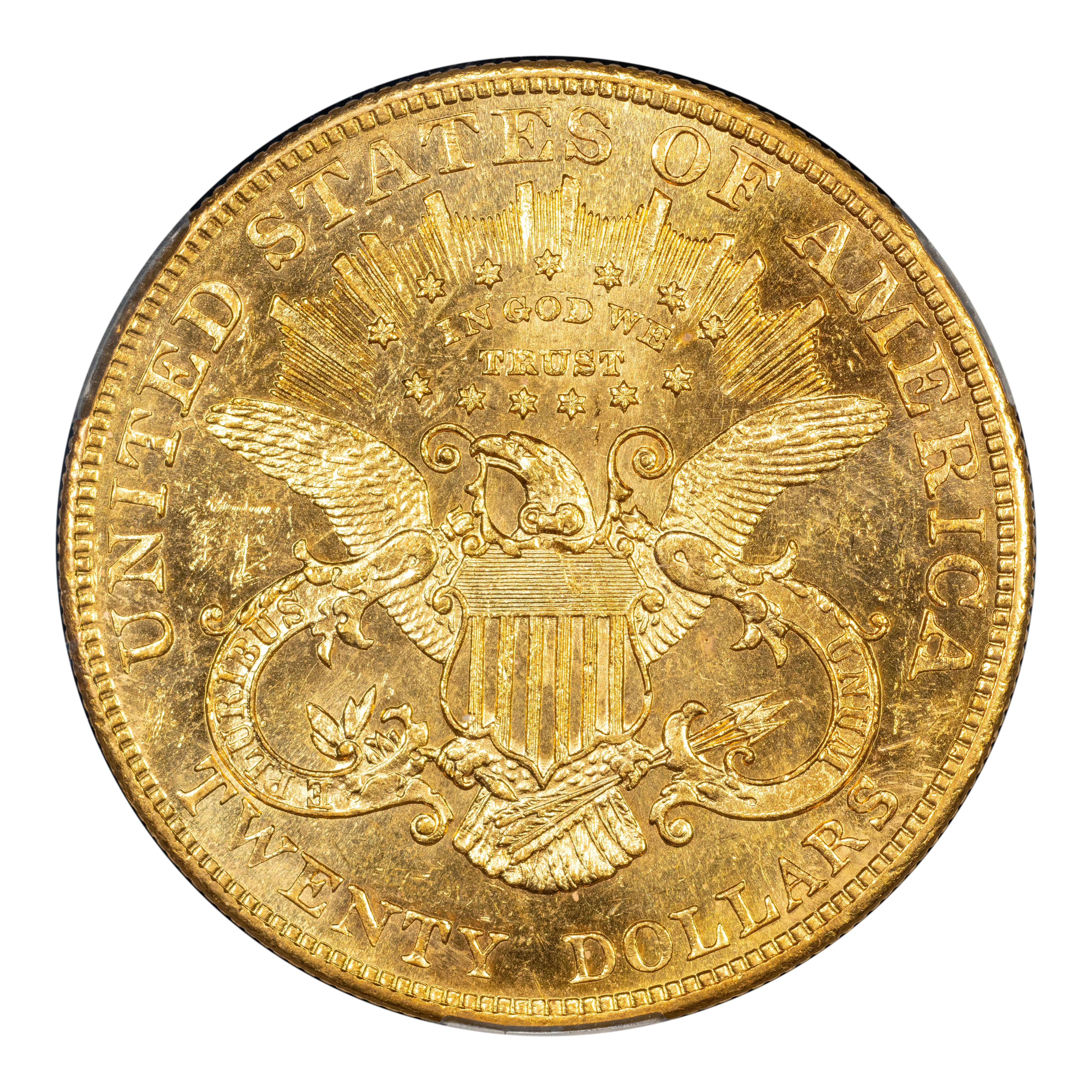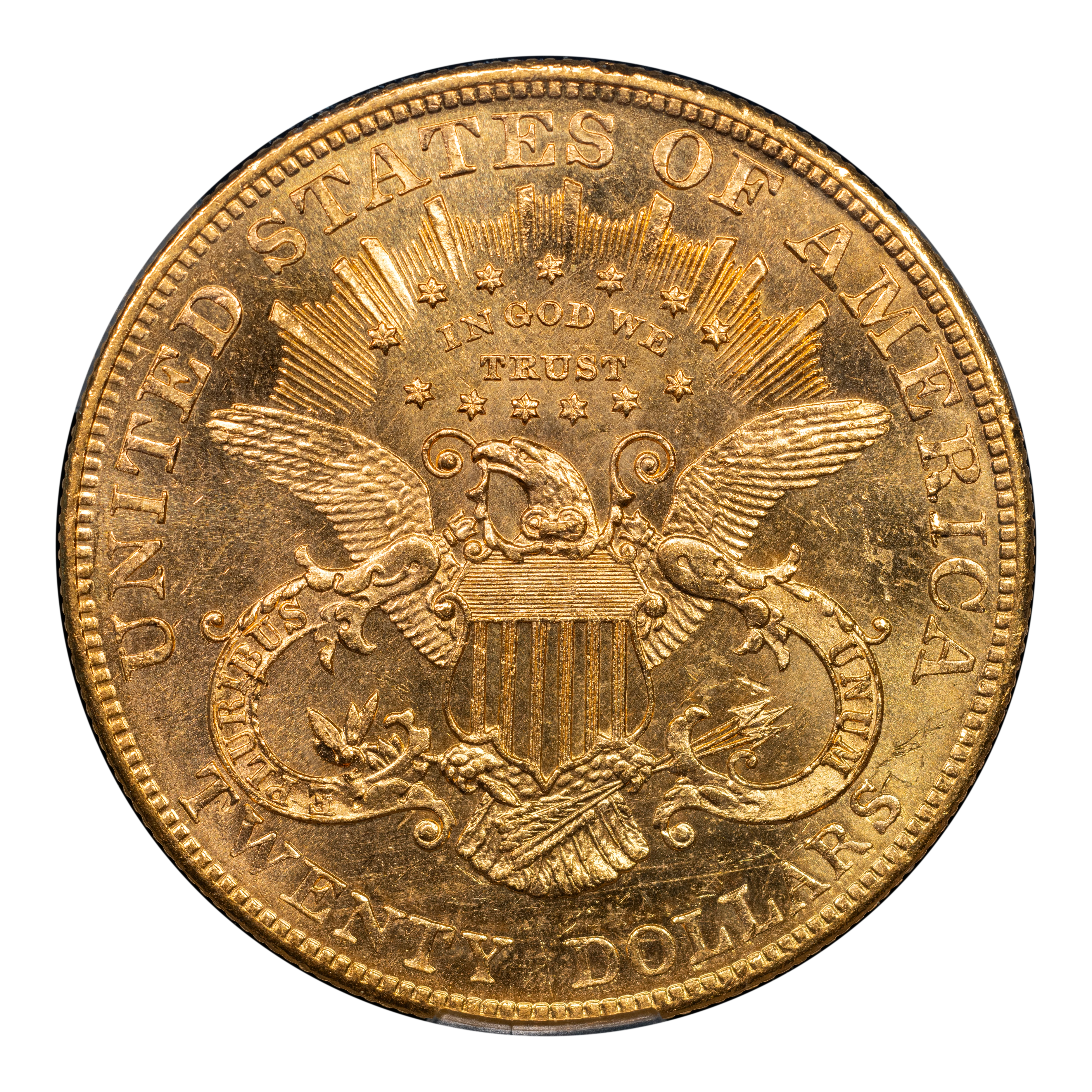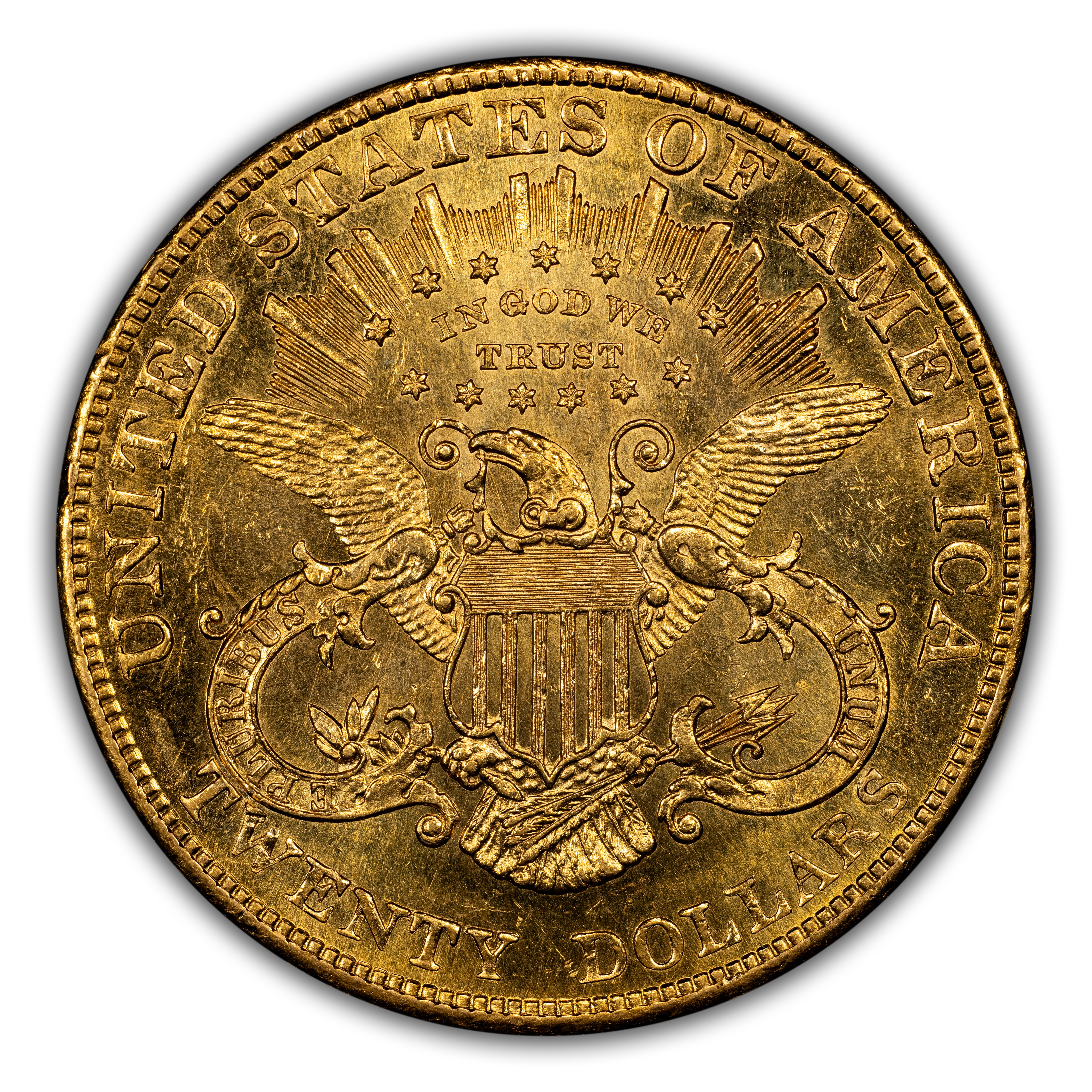 Reverse: Shielded eagle with wings outstretched holding arrows and olive branches. The words UNITED STATES OF AMERICA * TWENTY D. appear around the periphery. Mint mark, if any, appears below the eagle's tail, above the N in TWENTY.