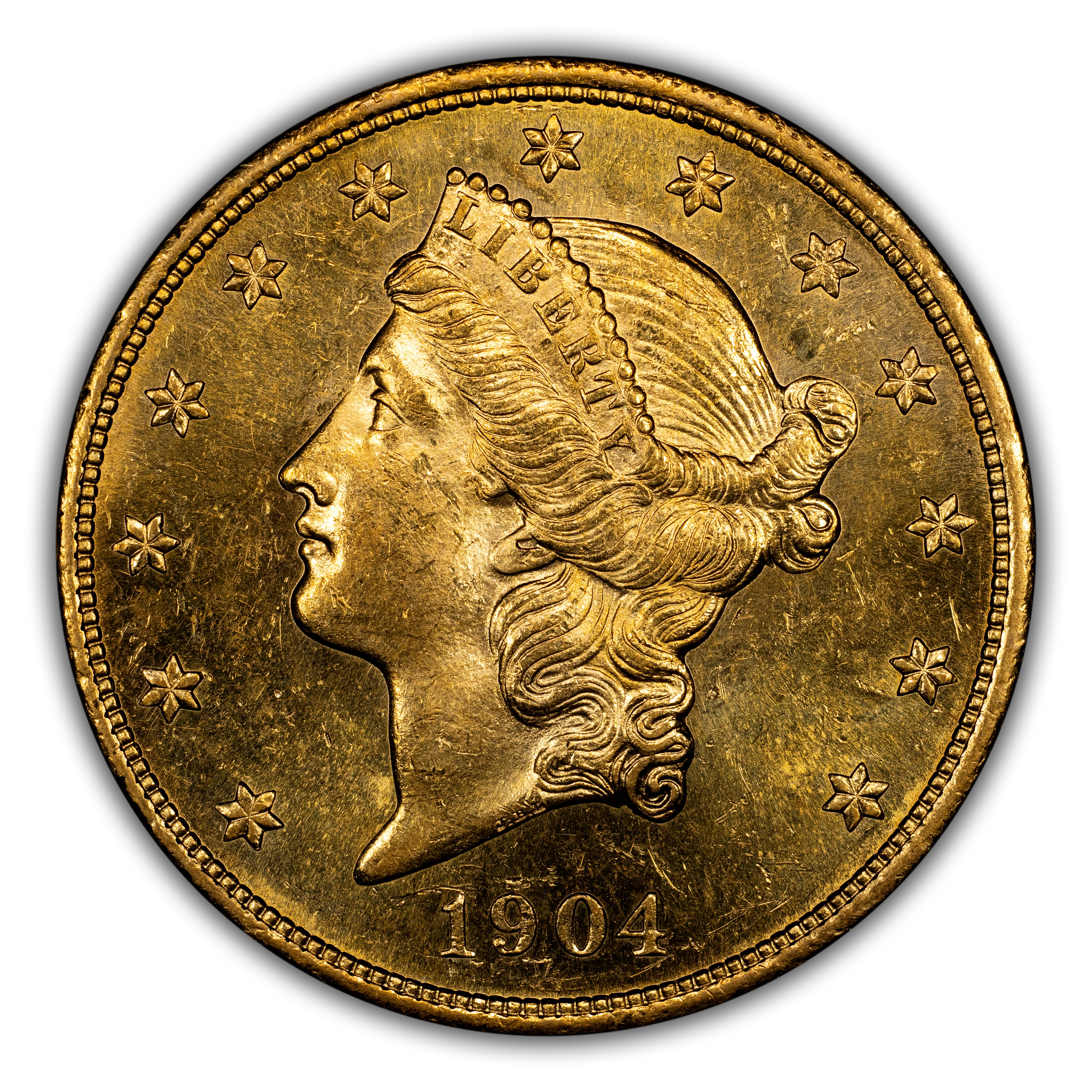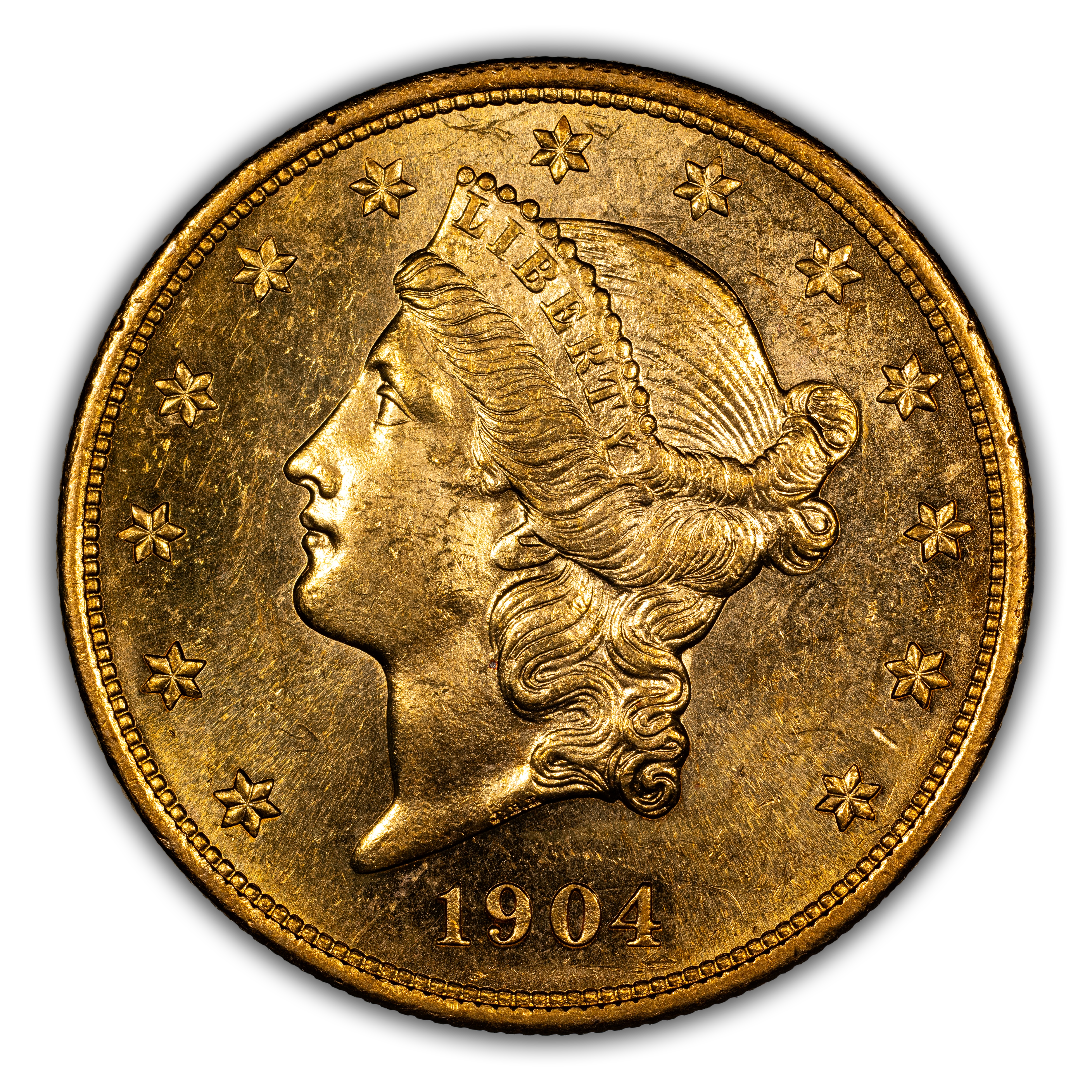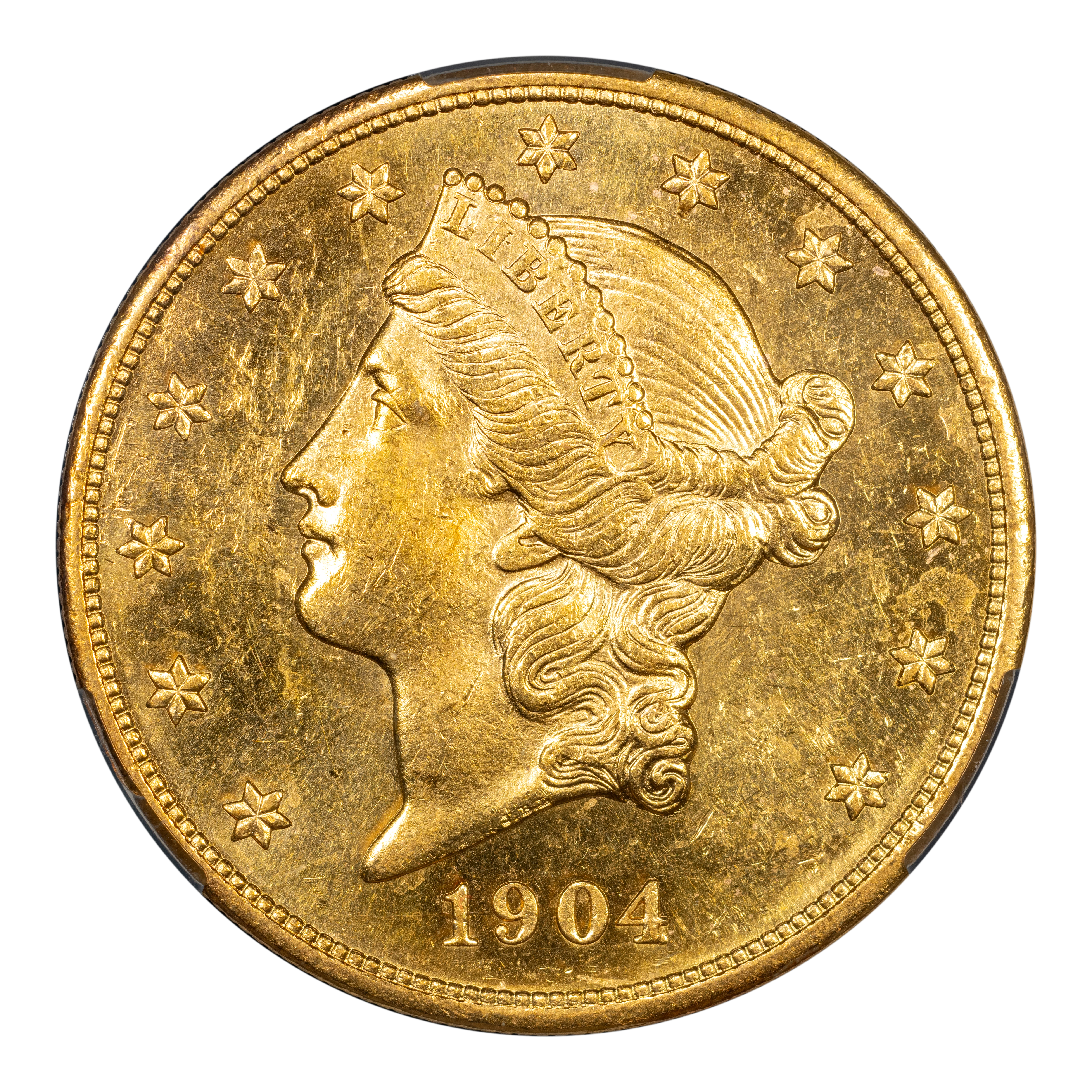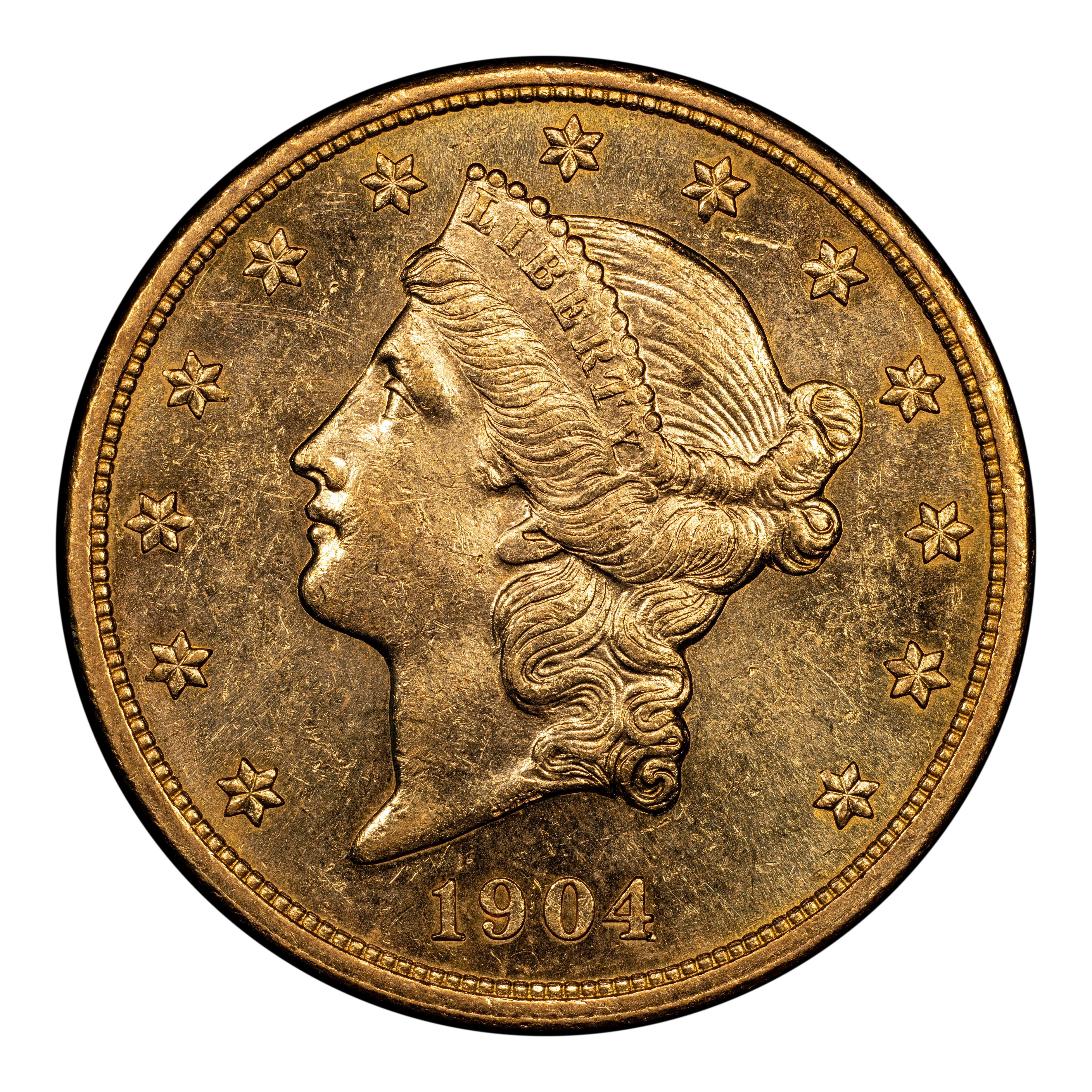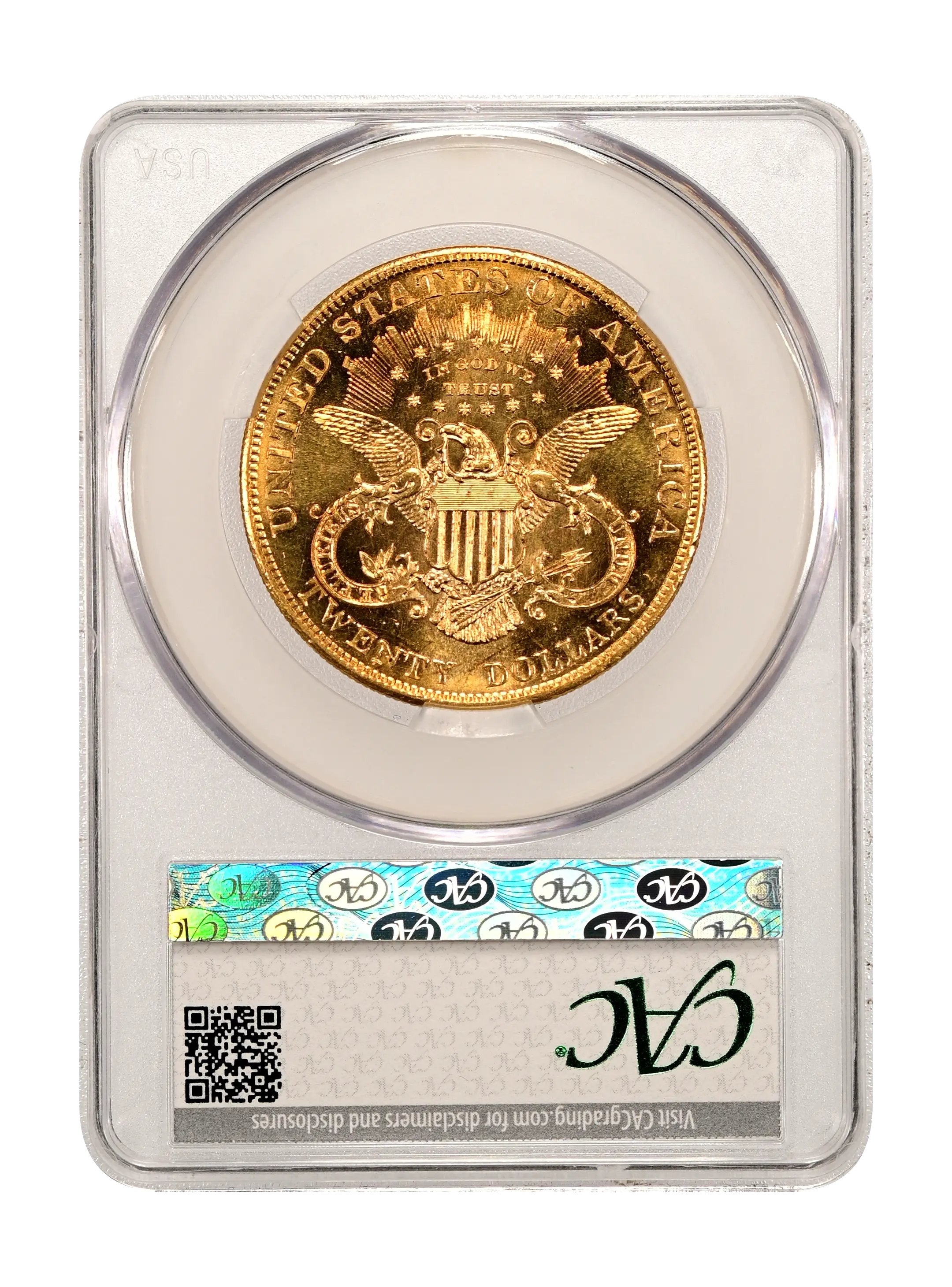 Reverse: Shielded eagle with wings outstretched holding arrows and olive branches. The words UNITED STATES OF AMERICA * TWENTY D. appear around the periphery. Mint mark, if any, appears below the eagle's tail, above the N in TWENTY.
